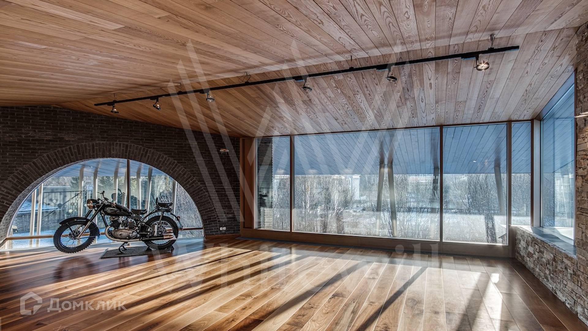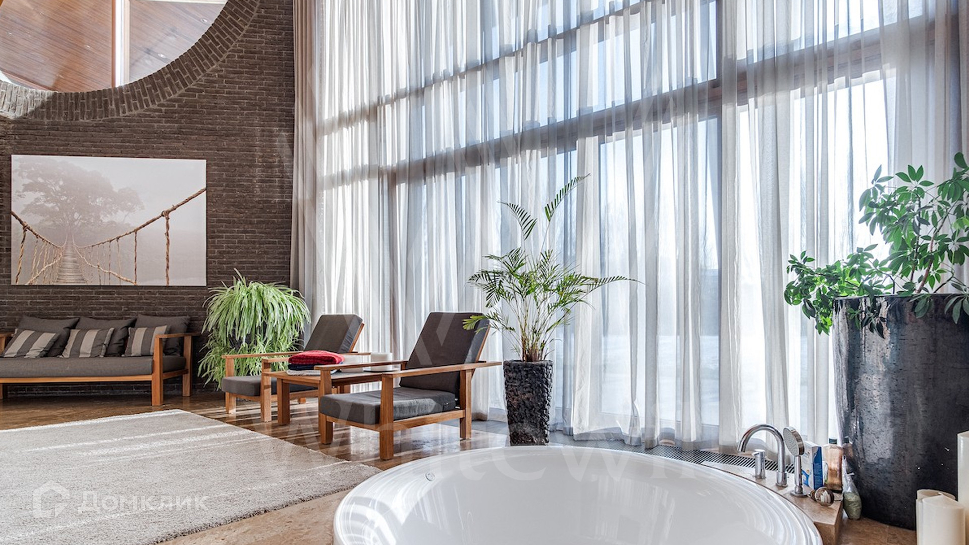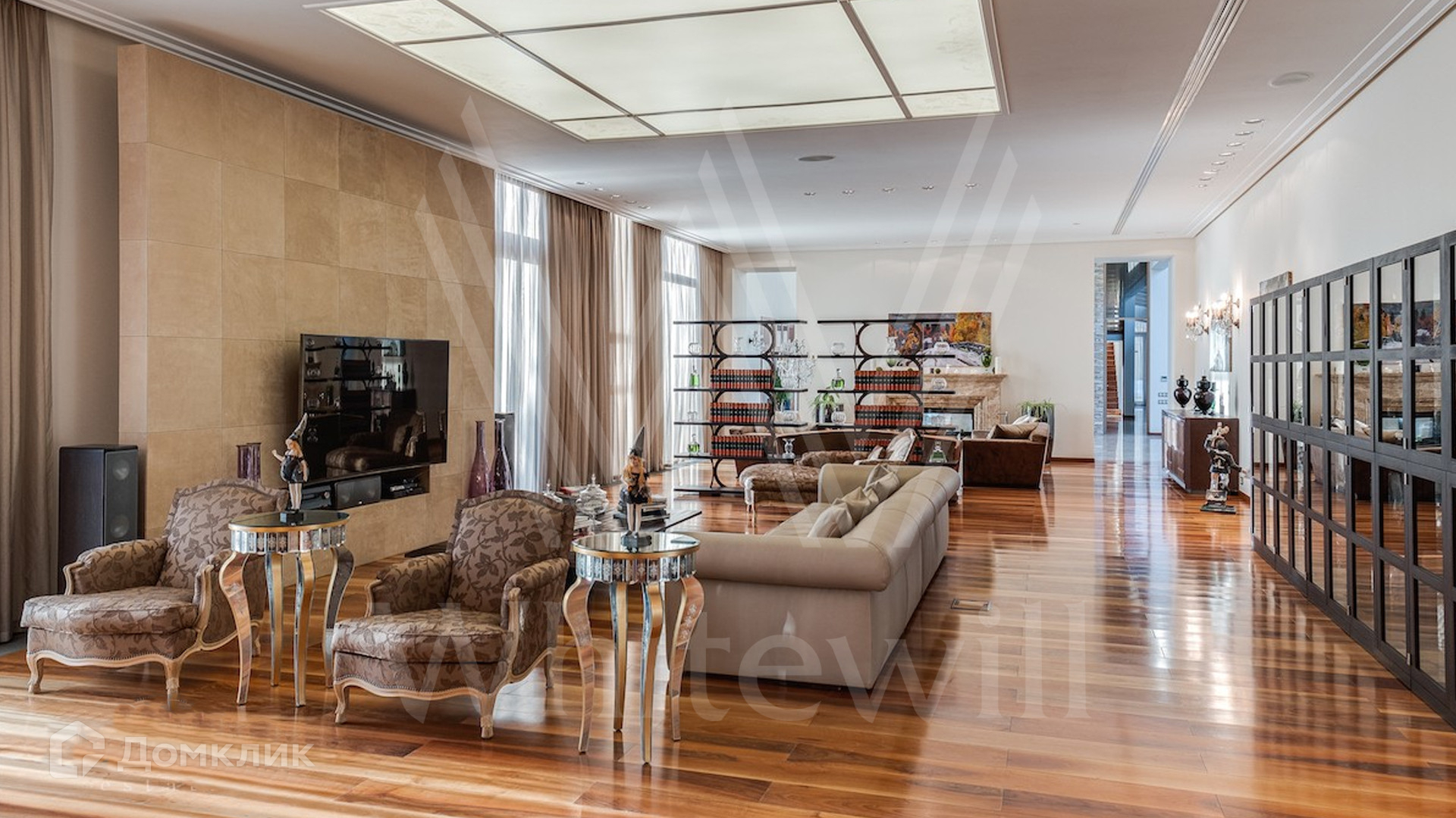 ID 9 405. Жуковка 21. Представительная загородная резиденция площадью 1 360 м² построена на полевом участке 50 соток. Необычный фасад дома облицован коричневым и бежевым клинкером, кровлю и землю соединяют тонкие стальные колонны. Интерьер резиденции выполнен в современном стиле — в отделке использовали натуральное дерево ценных пород, камень, дизайнерскую мебель, сантехнику и бытовую технику премиальных брендов. В доме спланированы просторные гостевые комнаты, гостиные, 5 спален с санузлами и гардеробными, тренажерный зал и сауна. Для персонала отведен отдельный блок с кухней. Из гостиной первого этажа можно выйти в зону патио и на участок. Для 3 машин предусмотрен гараж, две гостевые машины можно оставить под навесом.