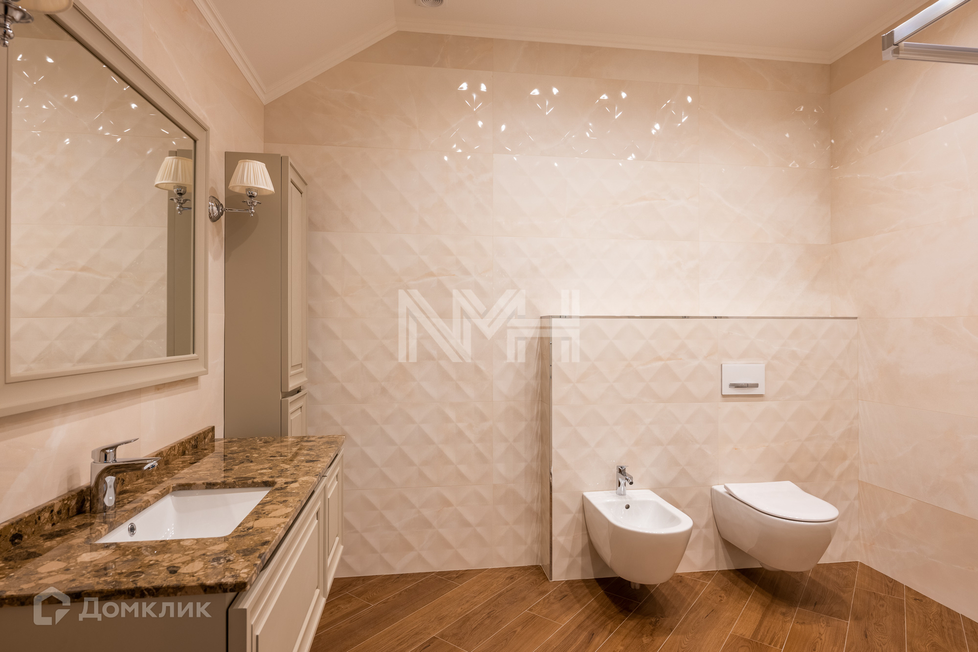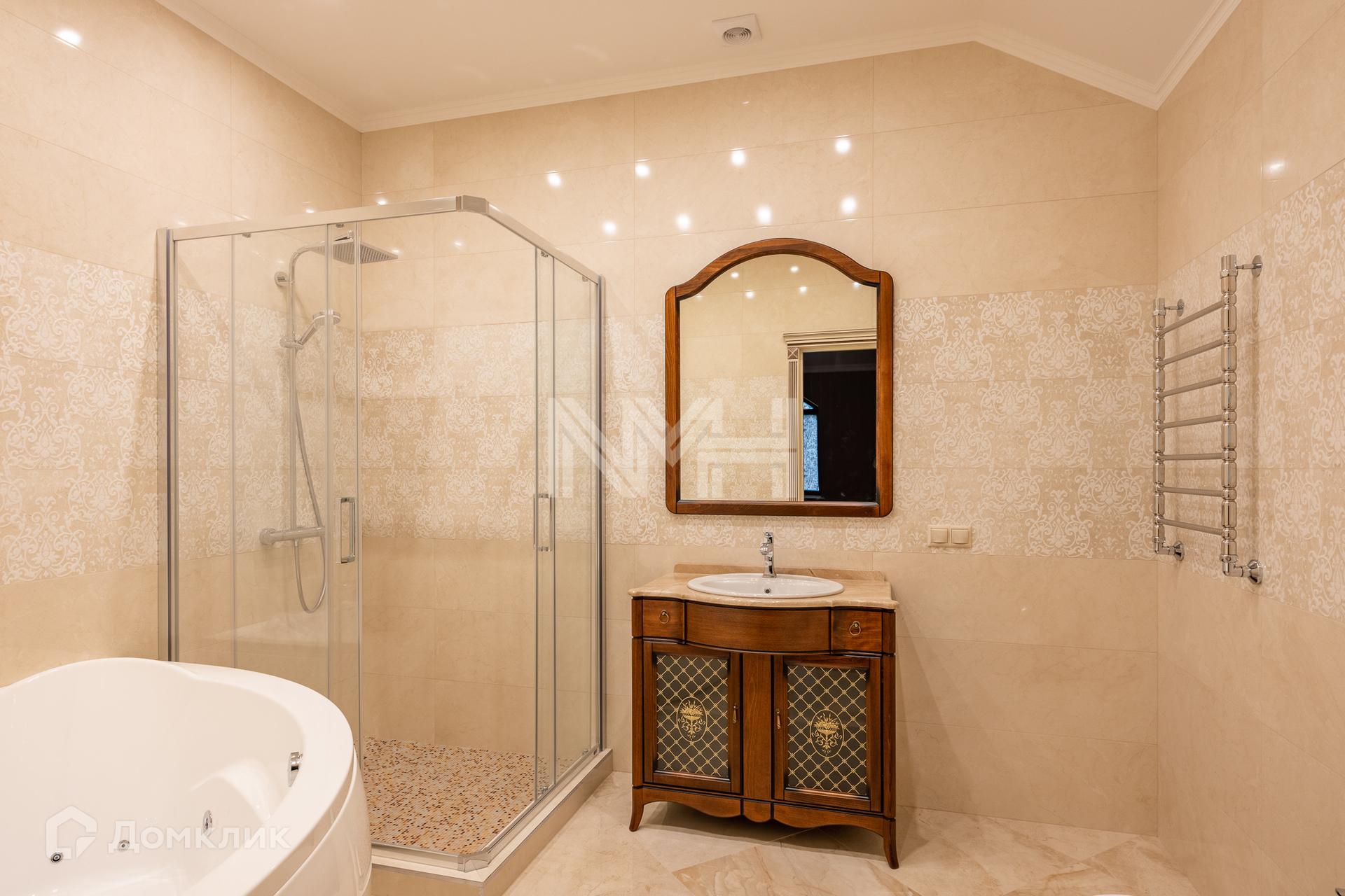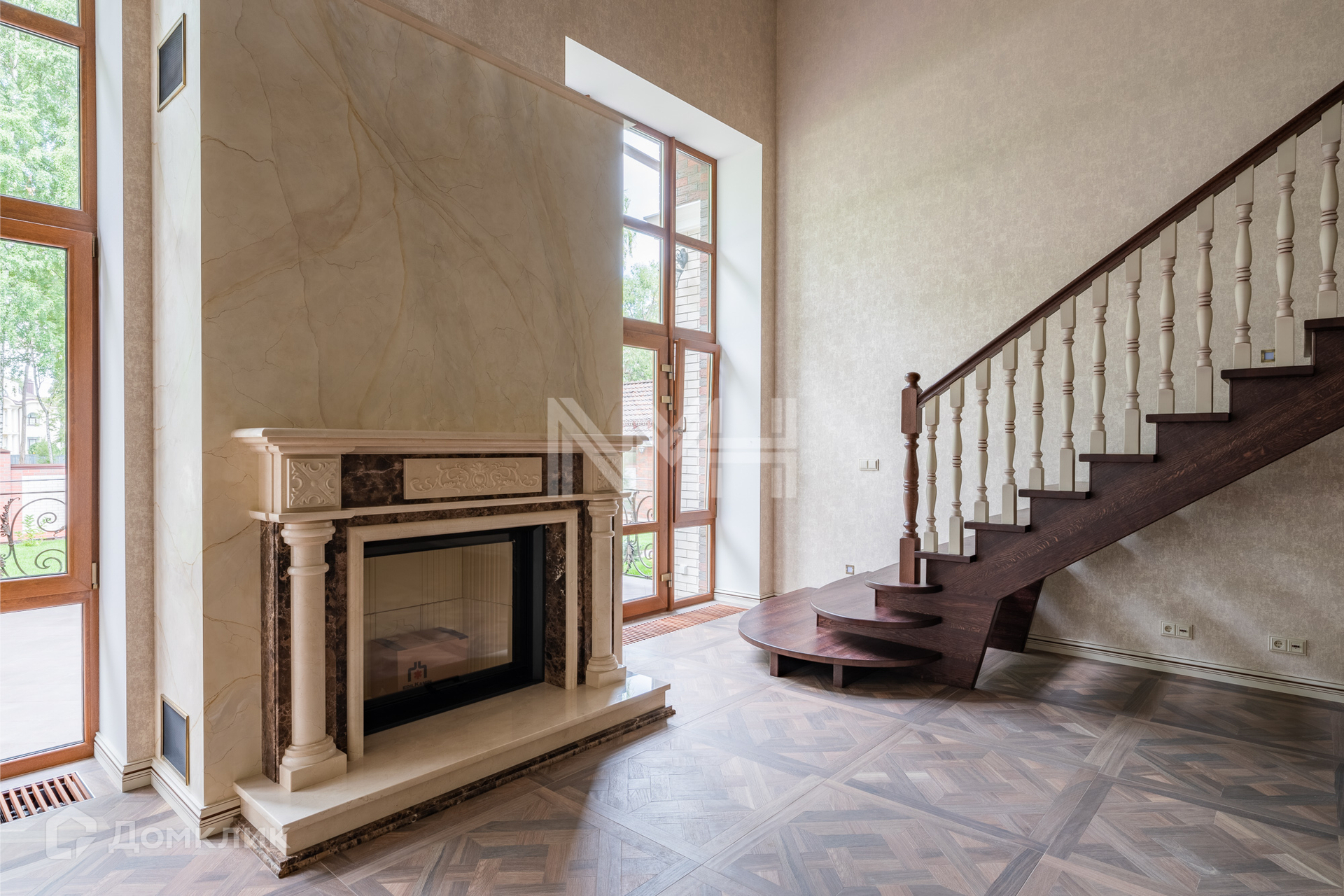 В доме выполнен ремонт в классическом стиле. Стены – венецианская штукатурка, итальянские обои, двери и лестница — массив дуба (Италия)-выполнены на заказ, пол - керамогранит с системой "Теплый пол" и инженерная доска, подоконники и камин — мрамор, санузлы полностью укомплектованы импортной сантехникой.