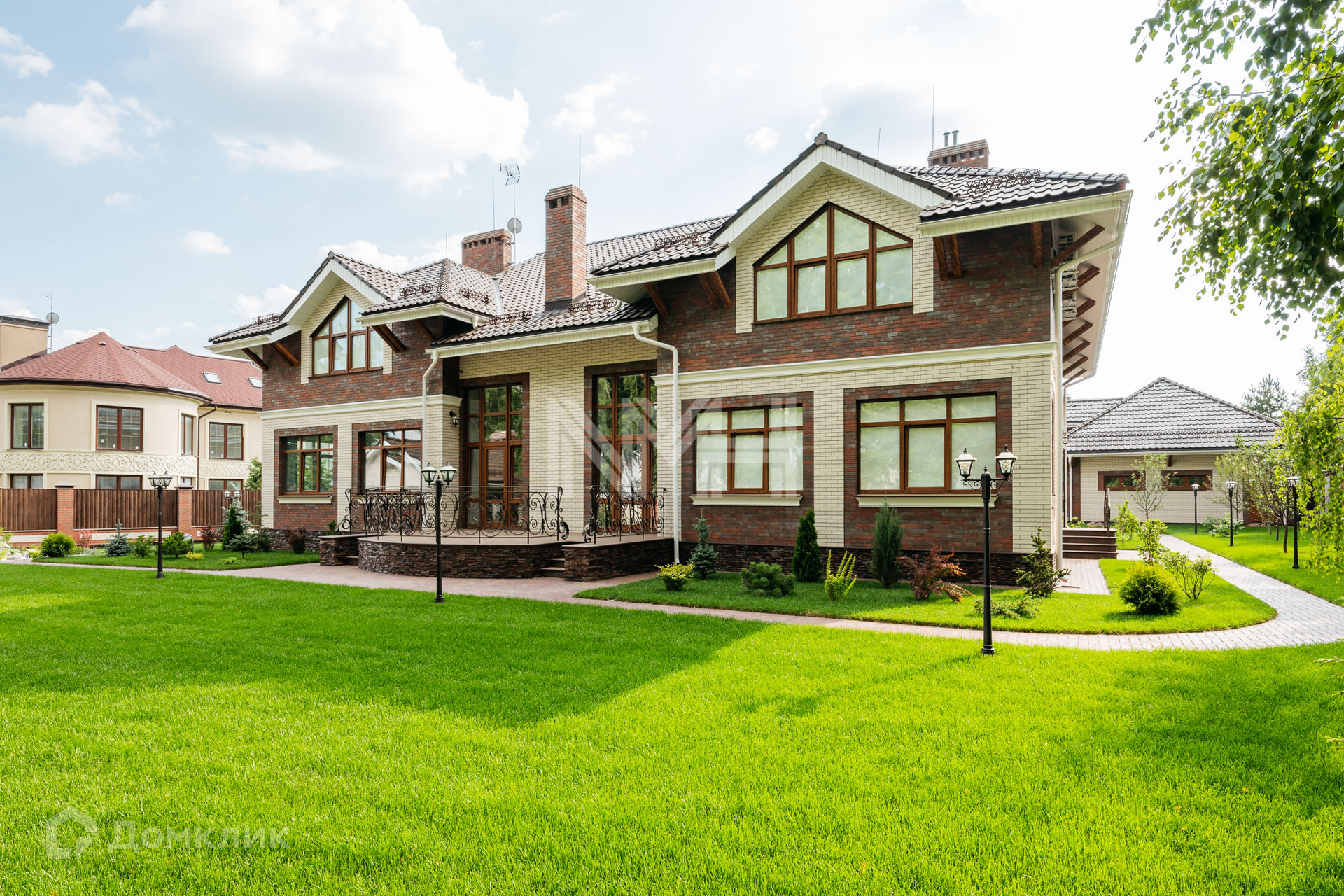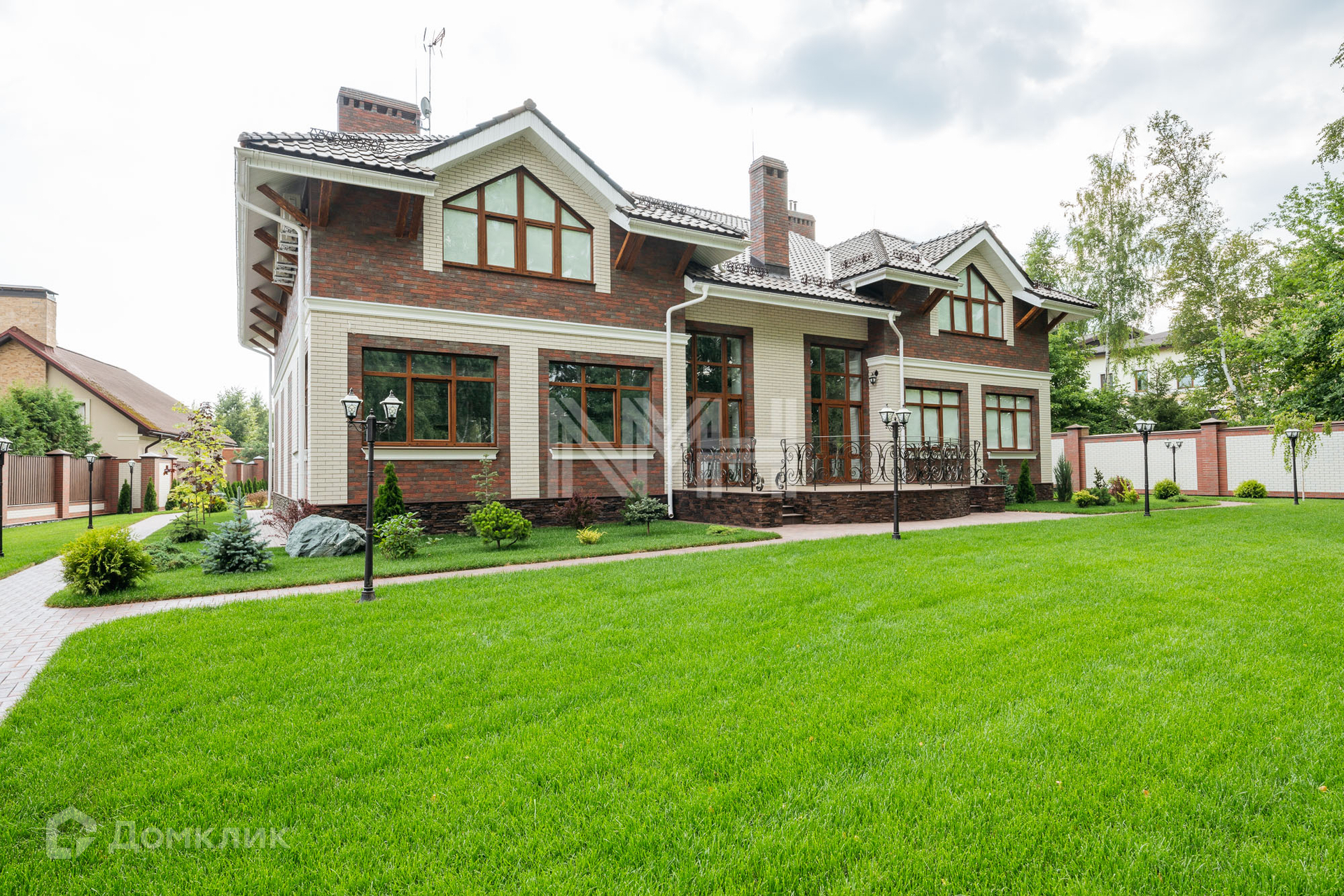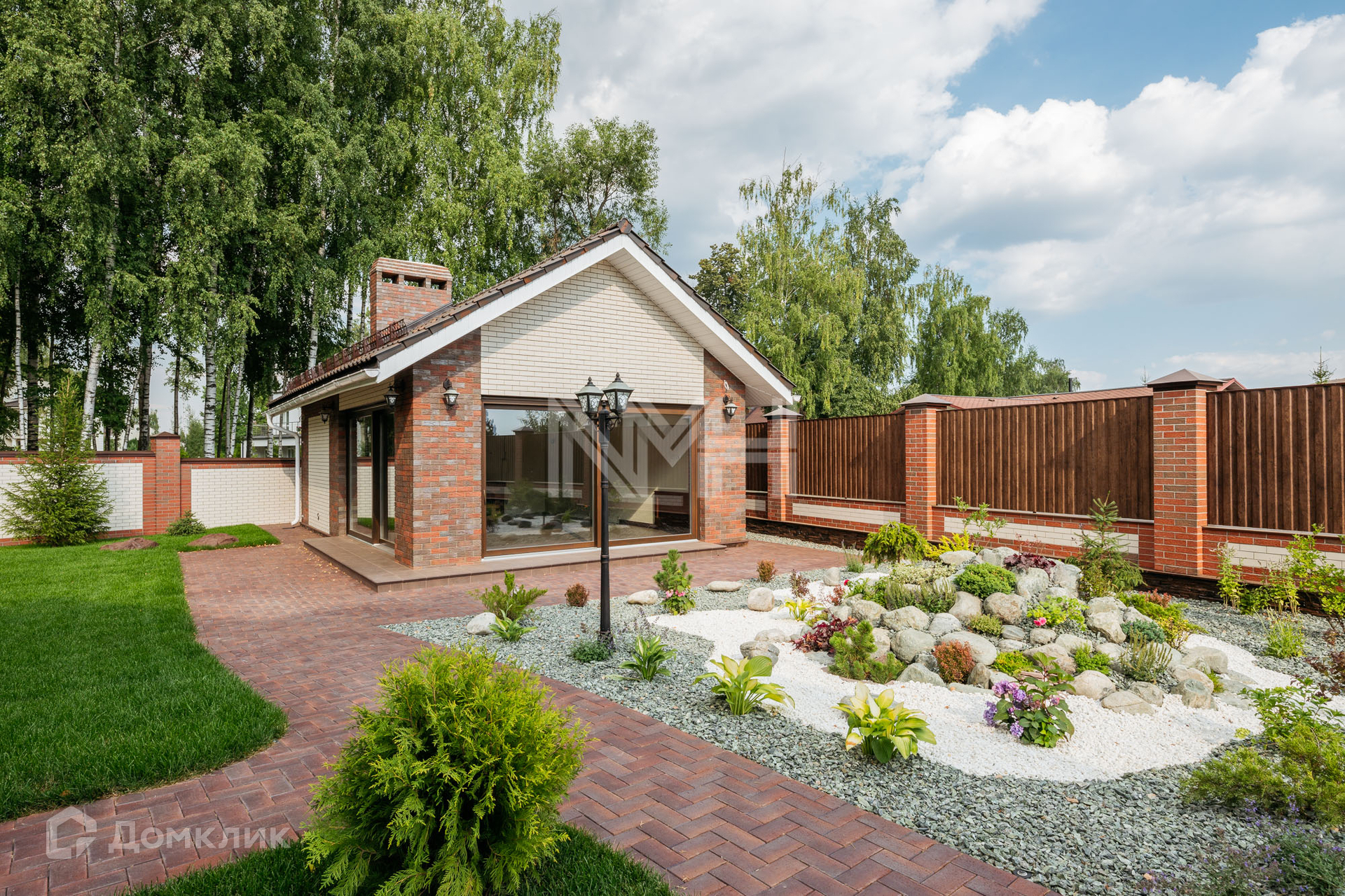 Загородный дом по авторскому проекту. Дом построен из кирпича, облицован немецким клинкерным кирпичом и декоративным камнем, крыльцо оформлено натуральным гранитом. Ламинированные стеклопакеты под дерево, с большой площадью остекления. Кровля — керамическая черепица Braas.