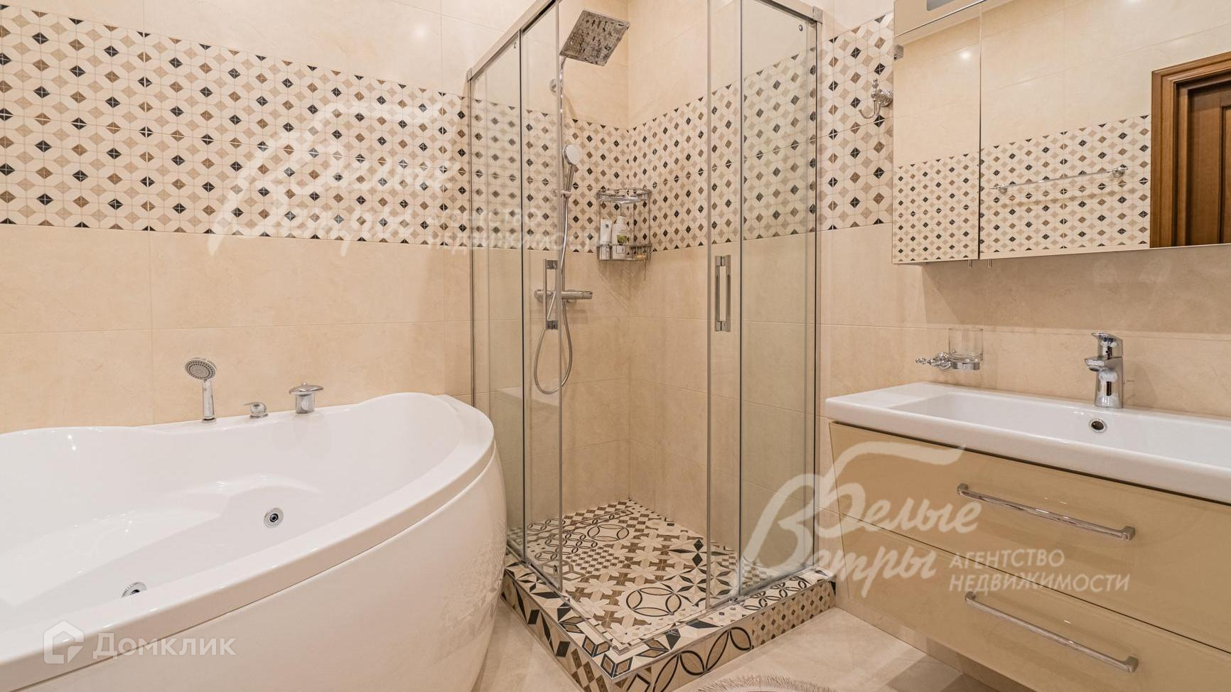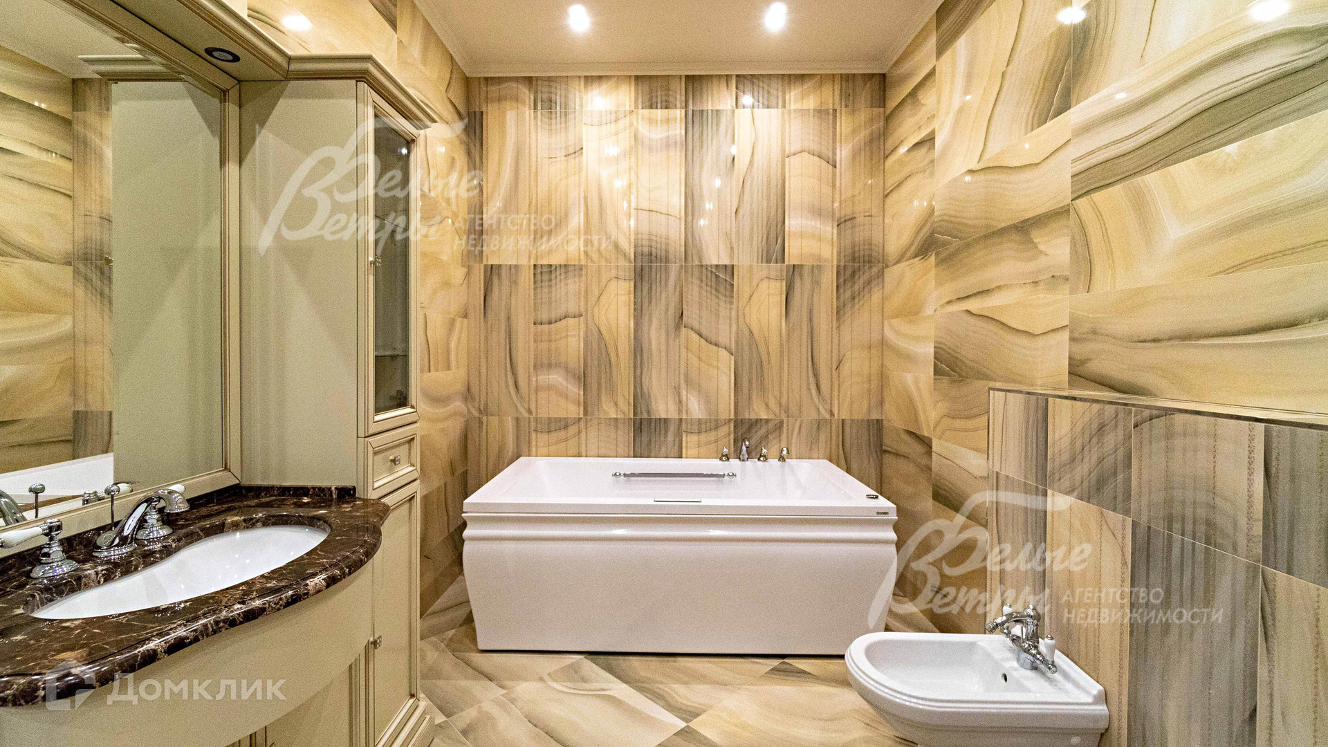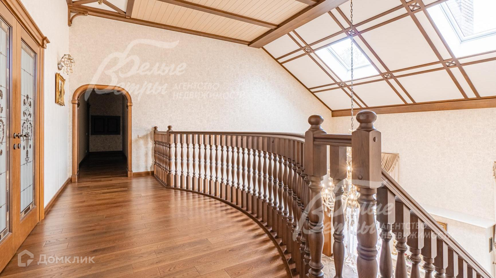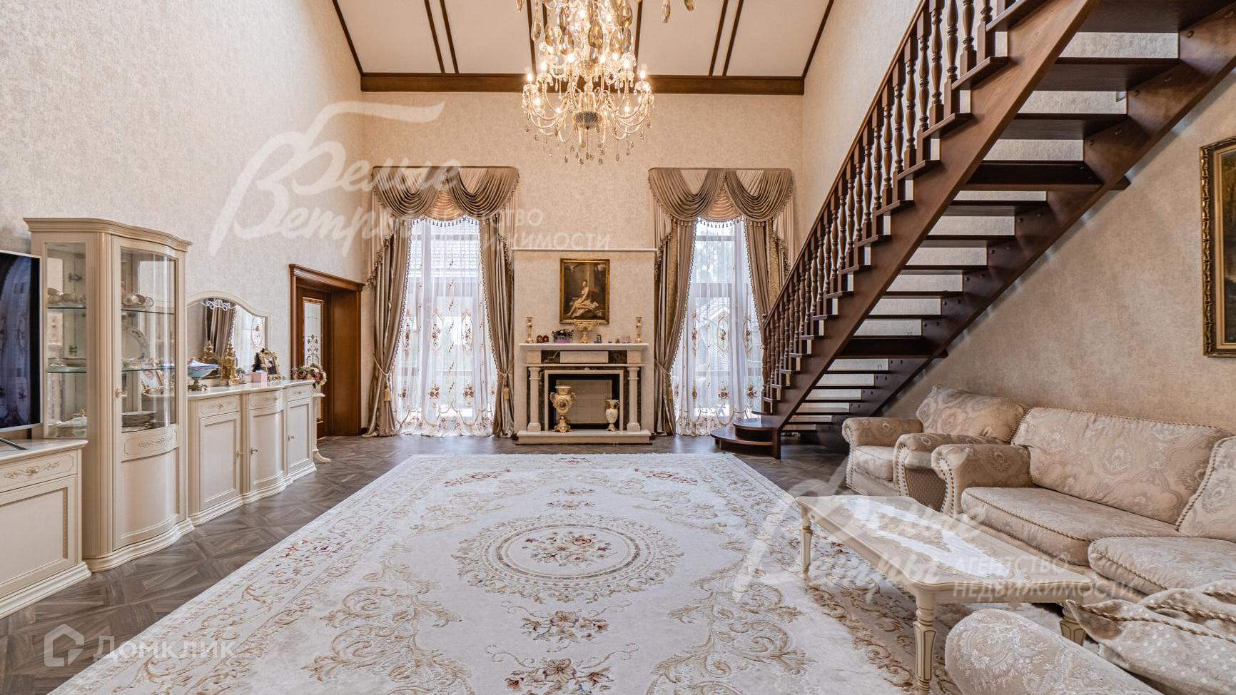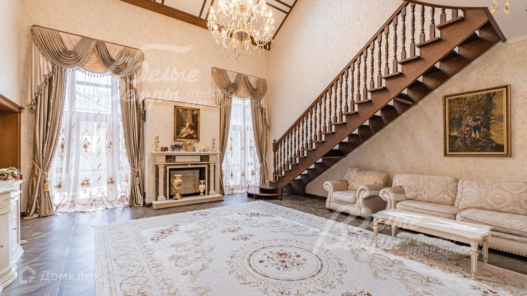 Внутренняя отделка: выполнена элитная отделка с дизайнерскими элементами. На стенах английские обои и декоративная венецианская штукатурка. На полу - паркет, керамогранит с подогревом. Широкая деревянная лестница из дуба с подсветкой. Подвесные многоуровневые потолки. Дорогая импортная сантехника, джакузи почти в каждом санузле. Все коммуникации разведены, установлены биметаллические радиаторы, внутрипольные конвекторы. Итальянские двери из массива дуба высотой 215 см (в гостиной 285 см)с резными порталами и проемами. Итальянские подоконники из мрамора. Камин облицован мрамором..