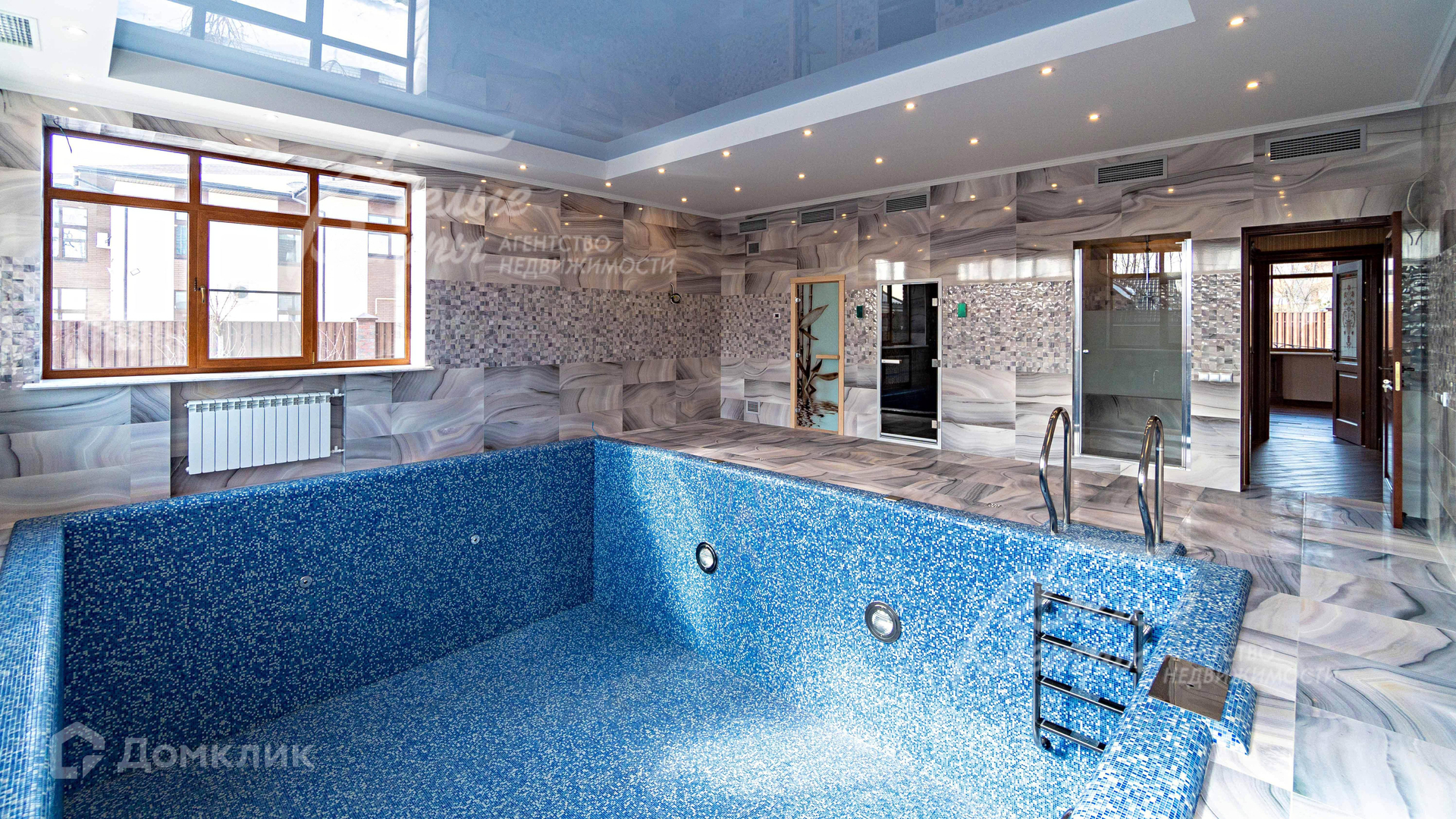 Важные опции: бассейн (скиммерный, размерами 5,35х4,15 м, глубиной 1.6 м); сауна; квартира для персонала (2 спальни); терраса; камин; холодный подвал; машиномест крытых: 3; хамам, бильярдная.