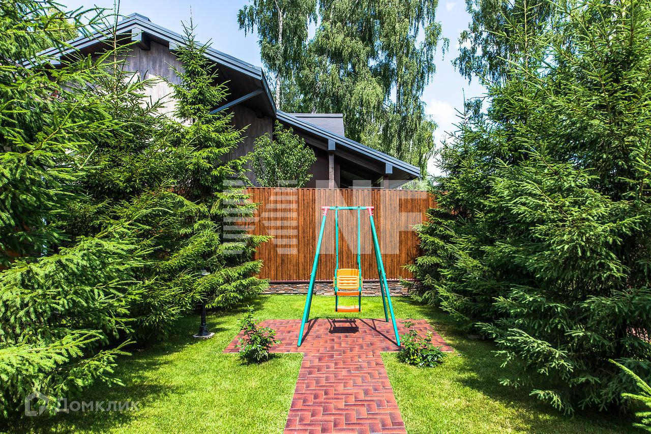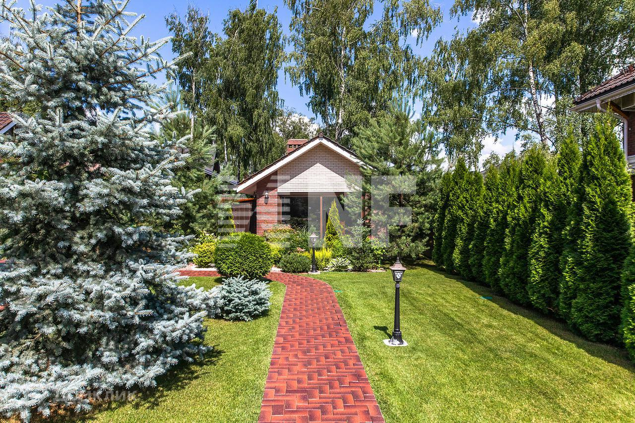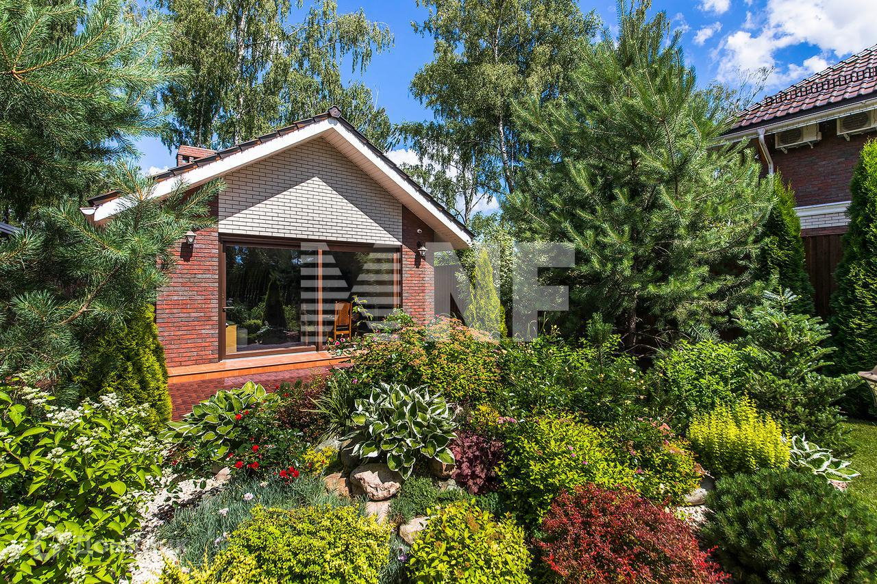 Участок с ландшафтным дизайном. На участке газон, растут деревья и кустарники. Оборудованы дорожки и освещение.