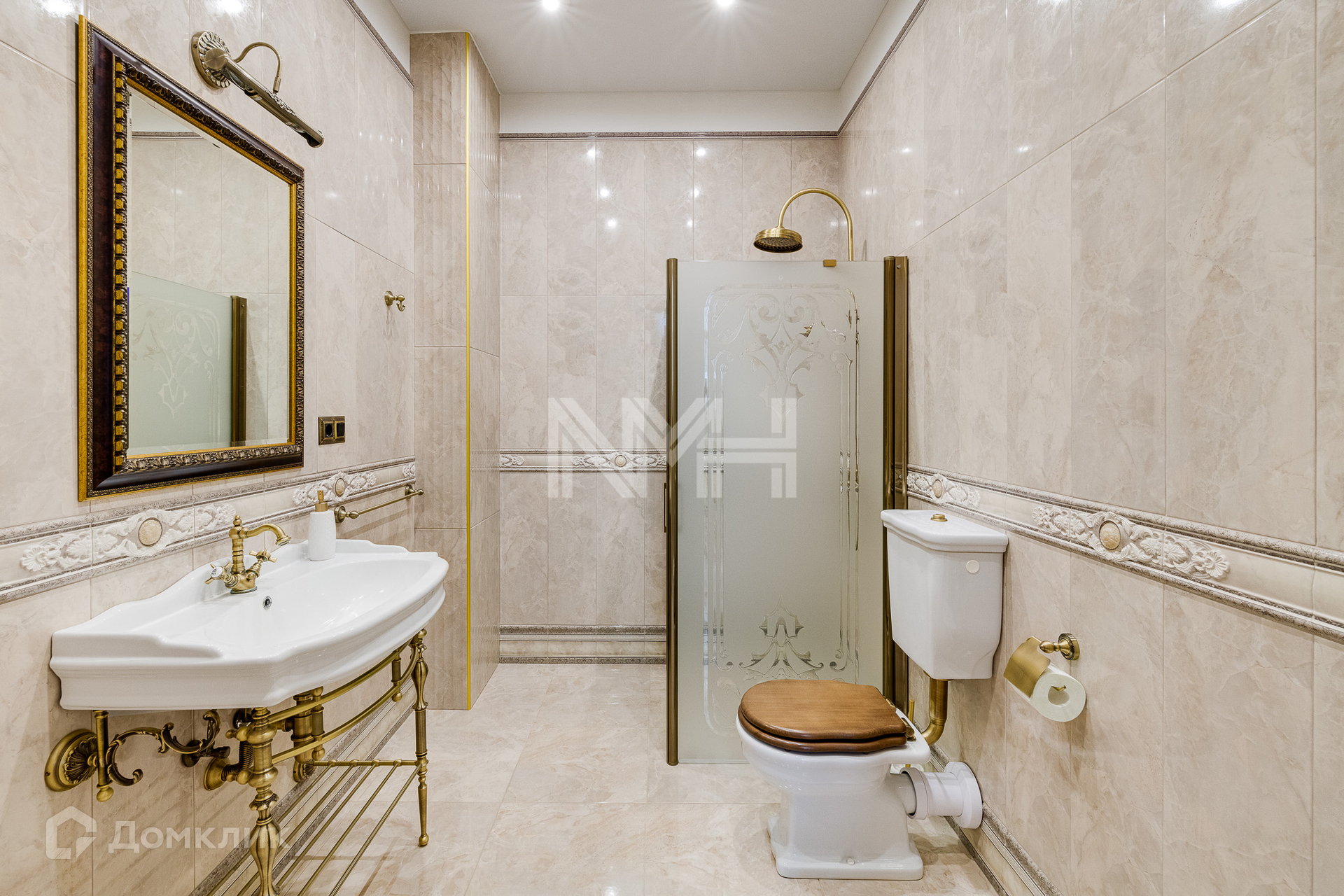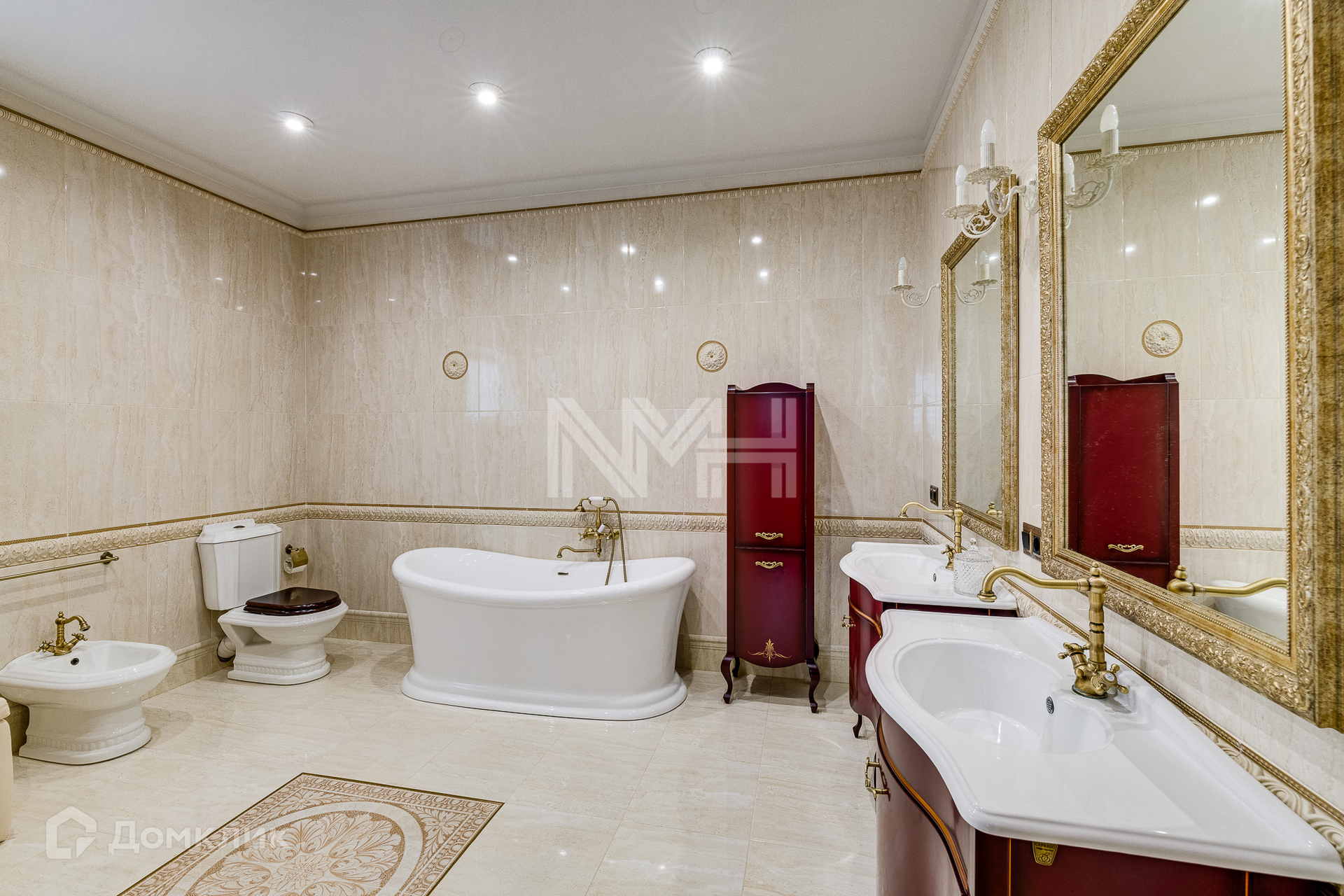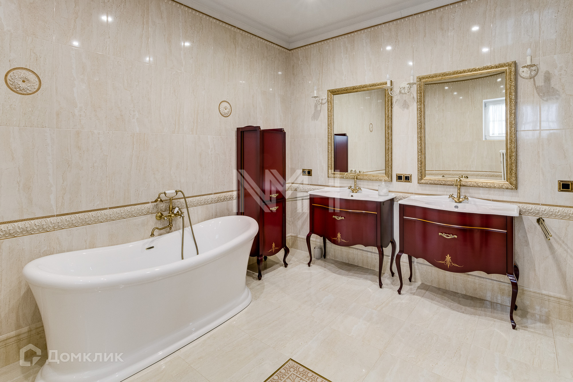 Внутри выполнена отделка под ключ, согласно дизайн-проекту, с использованием материалов известных брендов: полы выполнены из массива дуба Sherwood Parquet Antique Style, керамогранит Valle lunga, Classic Marfil, Riccketti, Villa Deste. Мраморная лестница Ботичино Фиорито (Италия), перила — ковка ручной работы, потолки и стены — американская краска Johnstone’s, декоративная штукатурка (шелк) Velatura, Decorfond. На мансарде — реечная лиственница. Ванна Belbagno, сантехника Cesares (Италия), Caprigo (Италия), краны Cesares, Caprigo. Деревянные двери «Элит» (модель «Классик», с итальянской фурнитурой). Подоконники — дерево (дуб), мрамор Emperador Dark. Каминный портал — мрамор (Испания, Престон белый). Люстры Chiaro (Германия). Мебель Ashley, кухня фабрики Stosa (Италия). Столешница из мрамора Имперадор Дарк (Италия), мойка Schock cristadur (Германия), дух. шкаф и варочная панель — Ilve (Италия). Техника: посудомоечная машина Bosh, стиральная машина Bosh. Хаммам – парогенератор Helo HNS T1-47 (Финляндия), дверь в хаммам Doorwood.