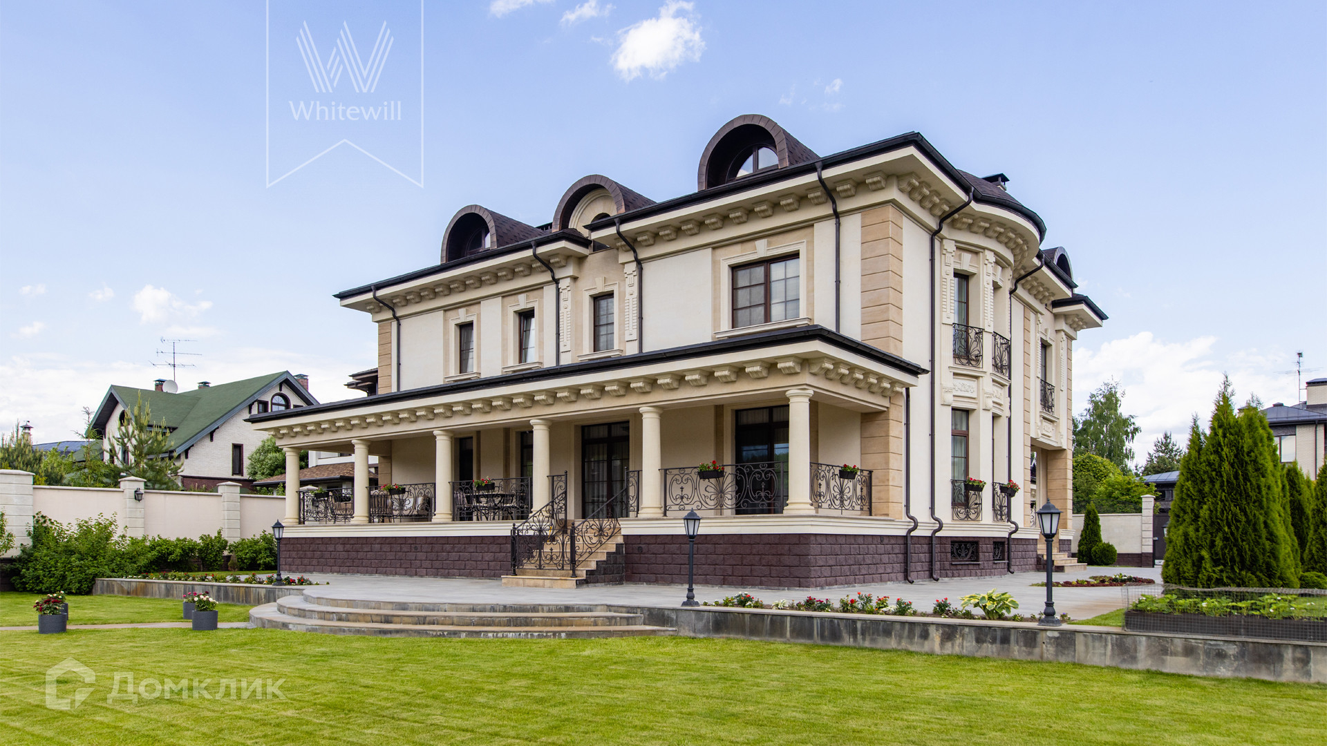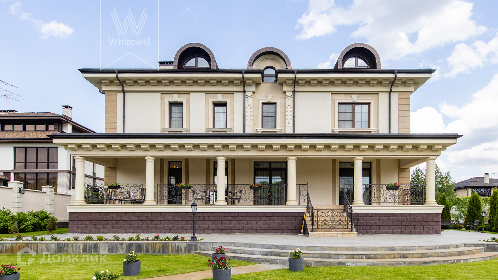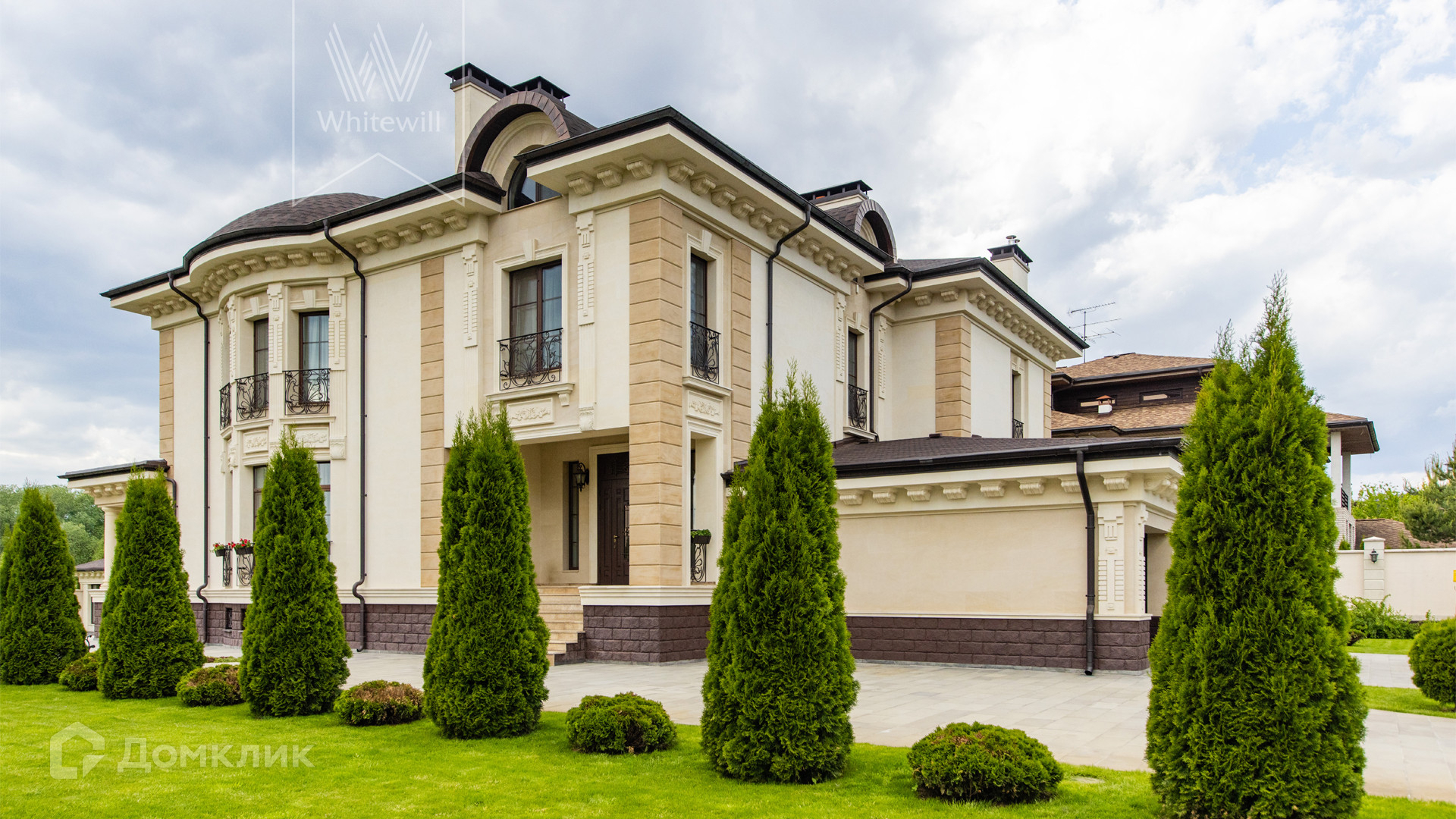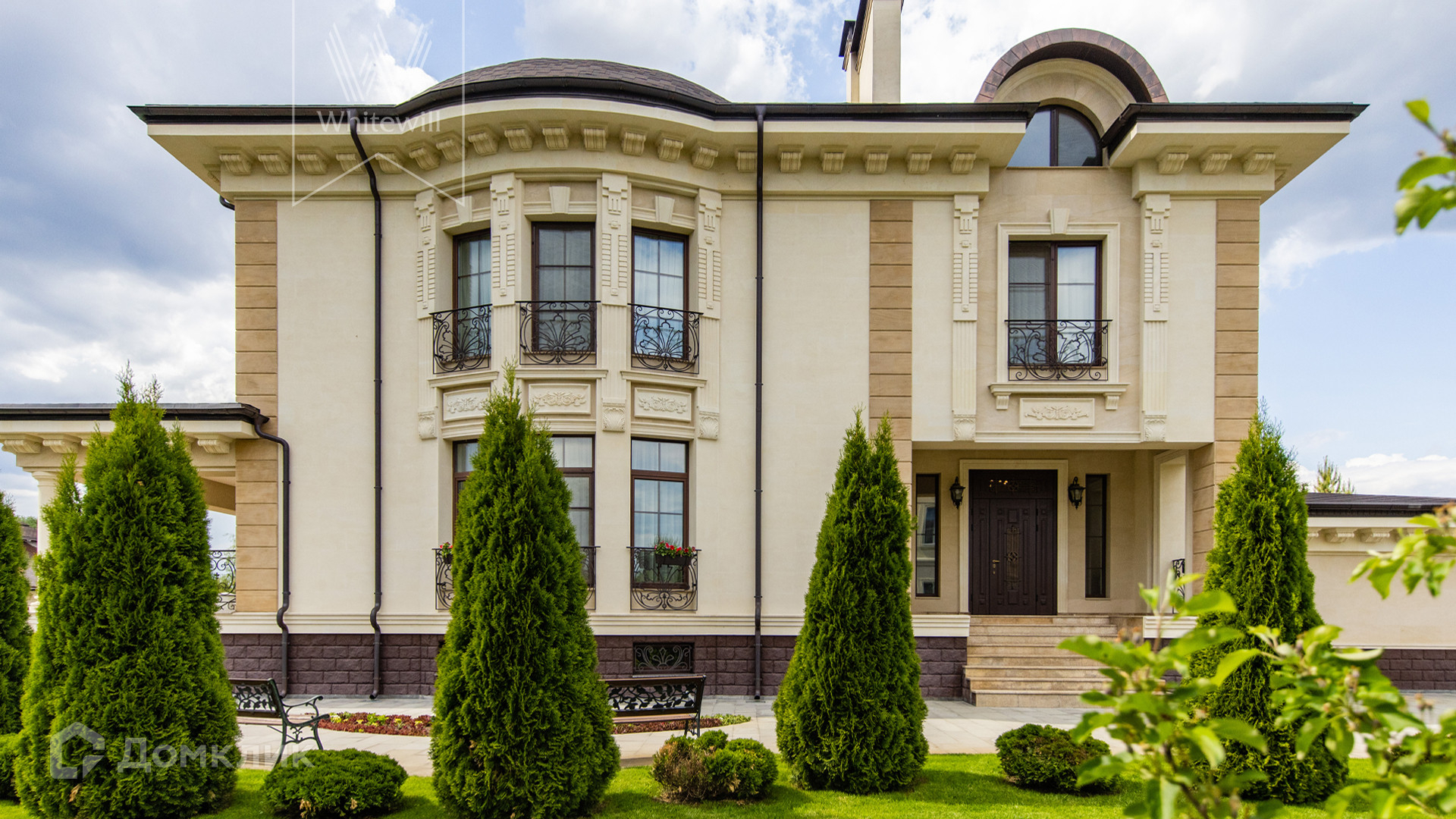 ID 11 549. Антоновка. Просторная загородная резиденция площадью 950 м² расположена на полевом участке 20,9 соток. Светлый фасад облицован натуральным дагестанским камнем, декорирован красно-коричневым клинкером по цоколю, колоннами, резными и коваными элементами. Интерьер в теплых оттенках сочетает элементы классики и современности. Дом укомплектован бытовой техникой Neff и Siemens. В коттедже разместили 5 спален, гостиную с камином, кухню-столовую с выходом на террасу, комнату отдыха, спортзал и сауну. Предусмотрены блок для персонала и гараж на 2 машины. На участке выполнен ландшафтный дизайн, установлено уличное освещение и обустроена беседка с кухней, оборудованной печью, казаном, мангалом и барбекю, и большой столовой, и санузлом .