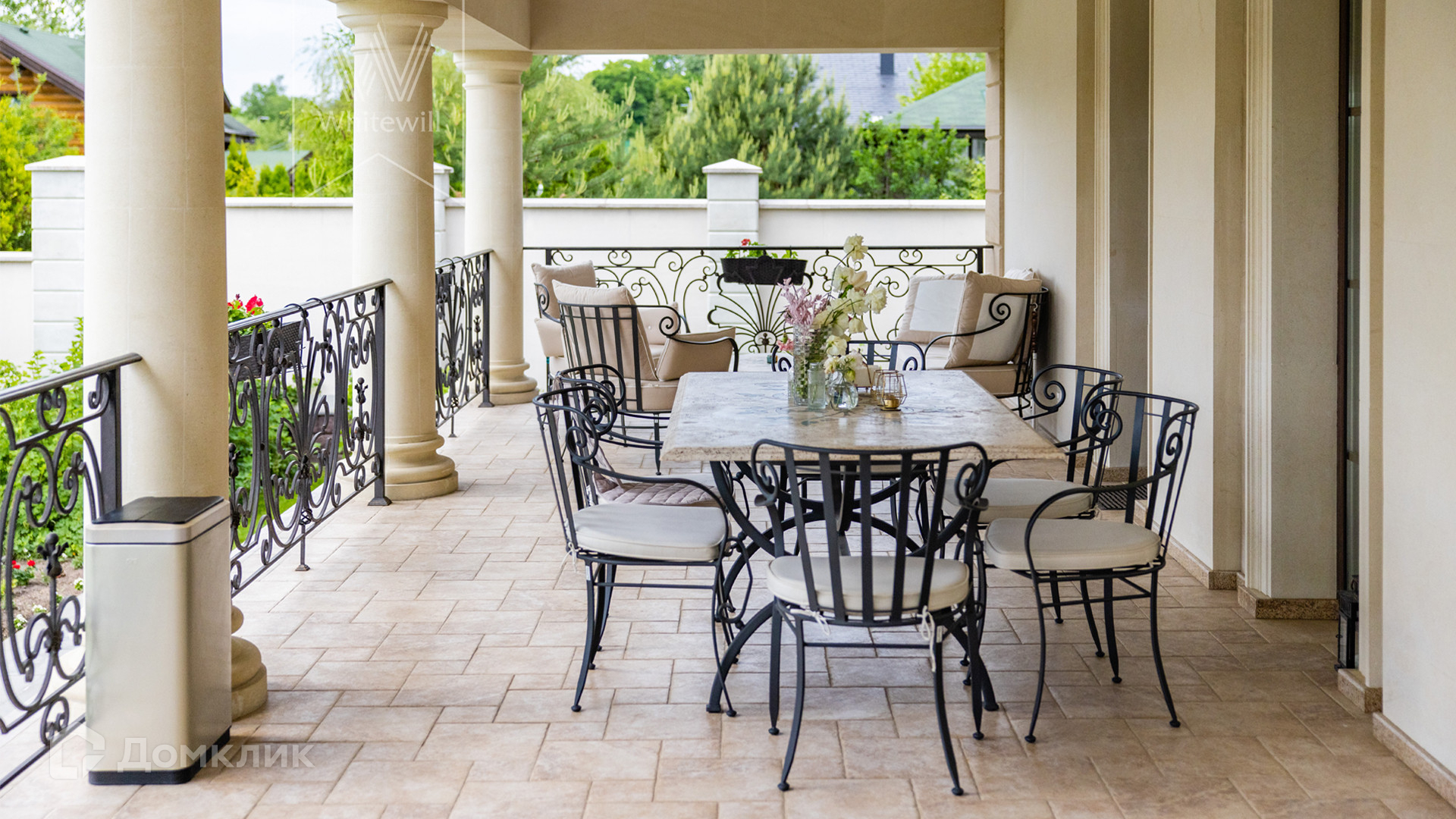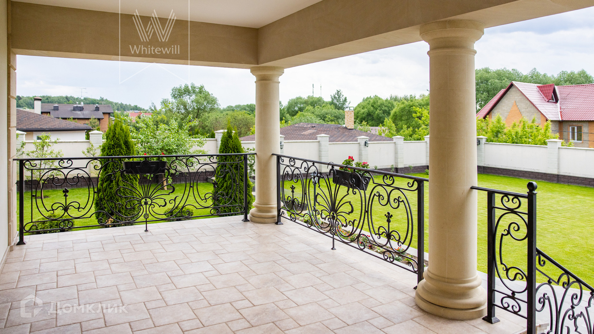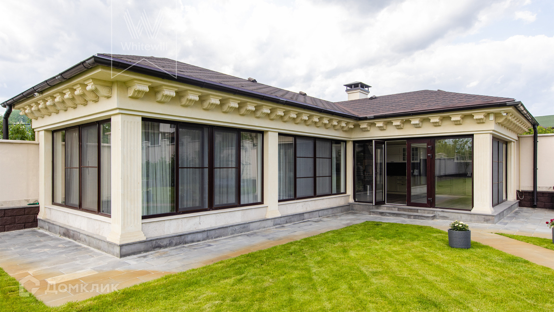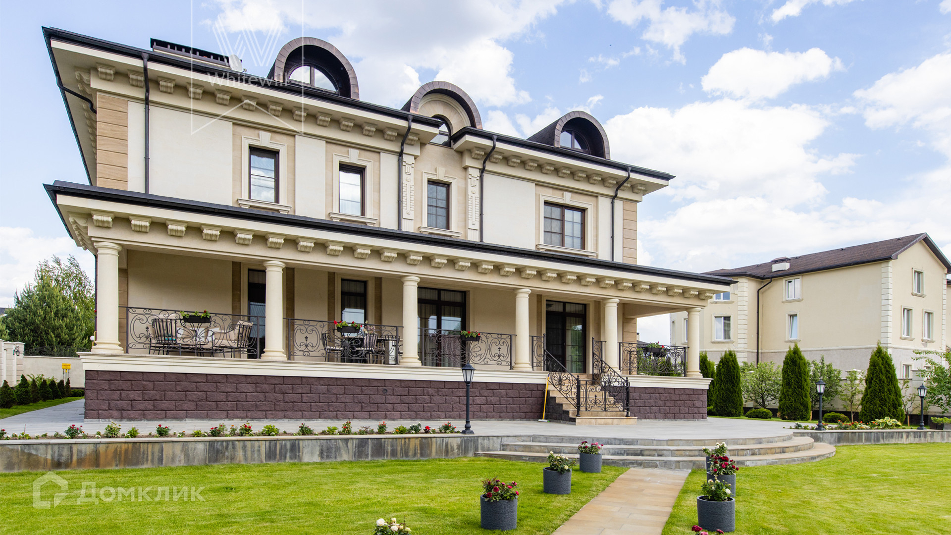 ID 11 549. Антоновка. Просторная загородная резиденция площадью 950 м² расположена на полевом участке 20,9 соток. Светлый фасад облицован натуральным дагестанским камнем, декорирован красно-коричневым клинкером по цоколю, колоннами, резными и коваными элементами. Интерьер в теплых оттенках сочетает элементы классики и современности. Дом укомплектован бытовой техникой Neff и Siemens. В коттедже разместили 5 спален, гостиную с камином, кухню-столовую с выходом на террасу, комнату отдыха, спортзал и сауну. Предусмотрены блок для персонала и гараж на 2 машины. На участке выполнен ландшафтный дизайн, установлено уличное освещение и обустроена беседка с кухней, оборудованной печью, казаном, мангалом и барбекю, и большой столовой, и санузлом .