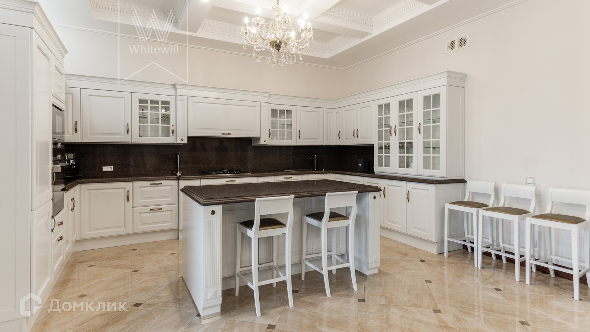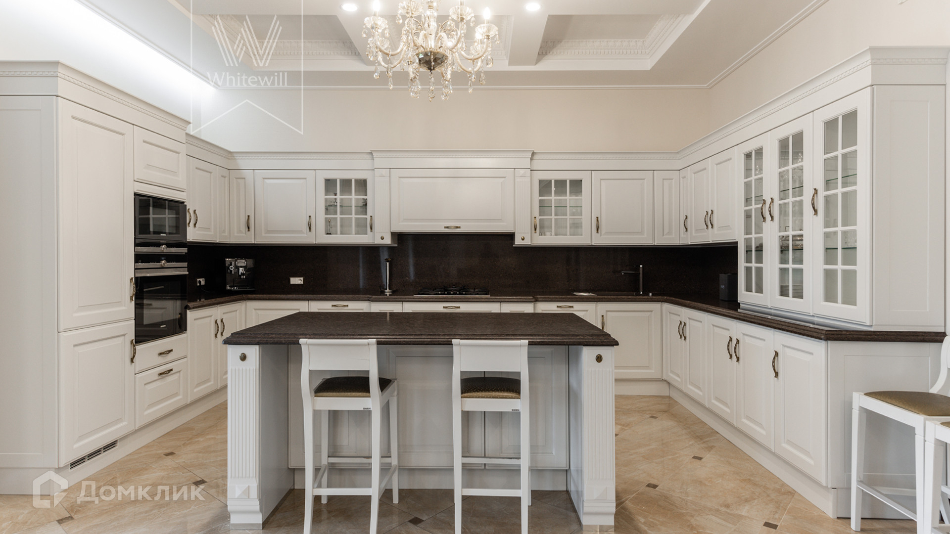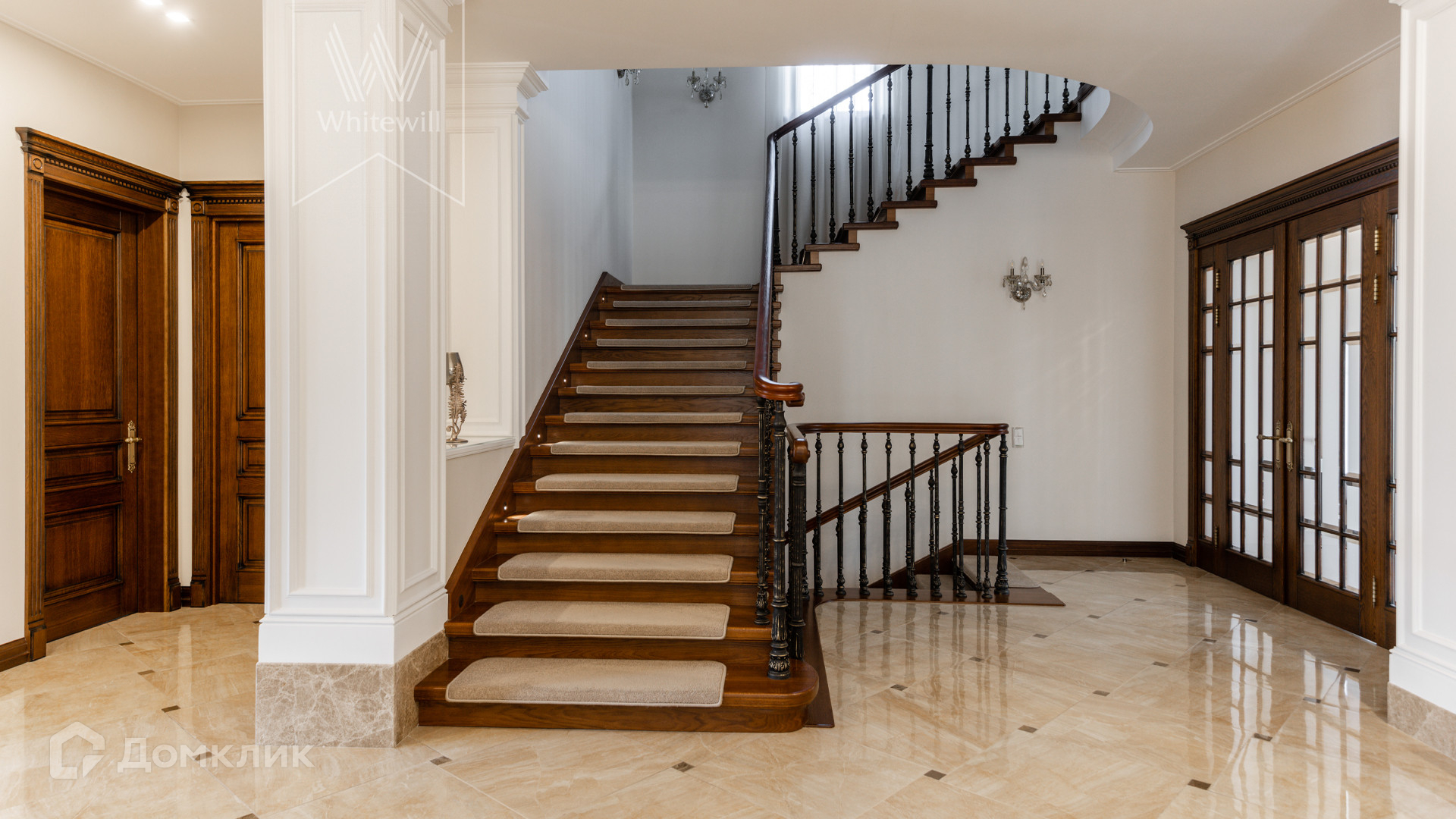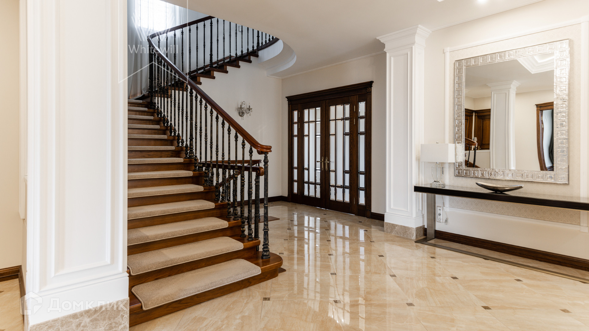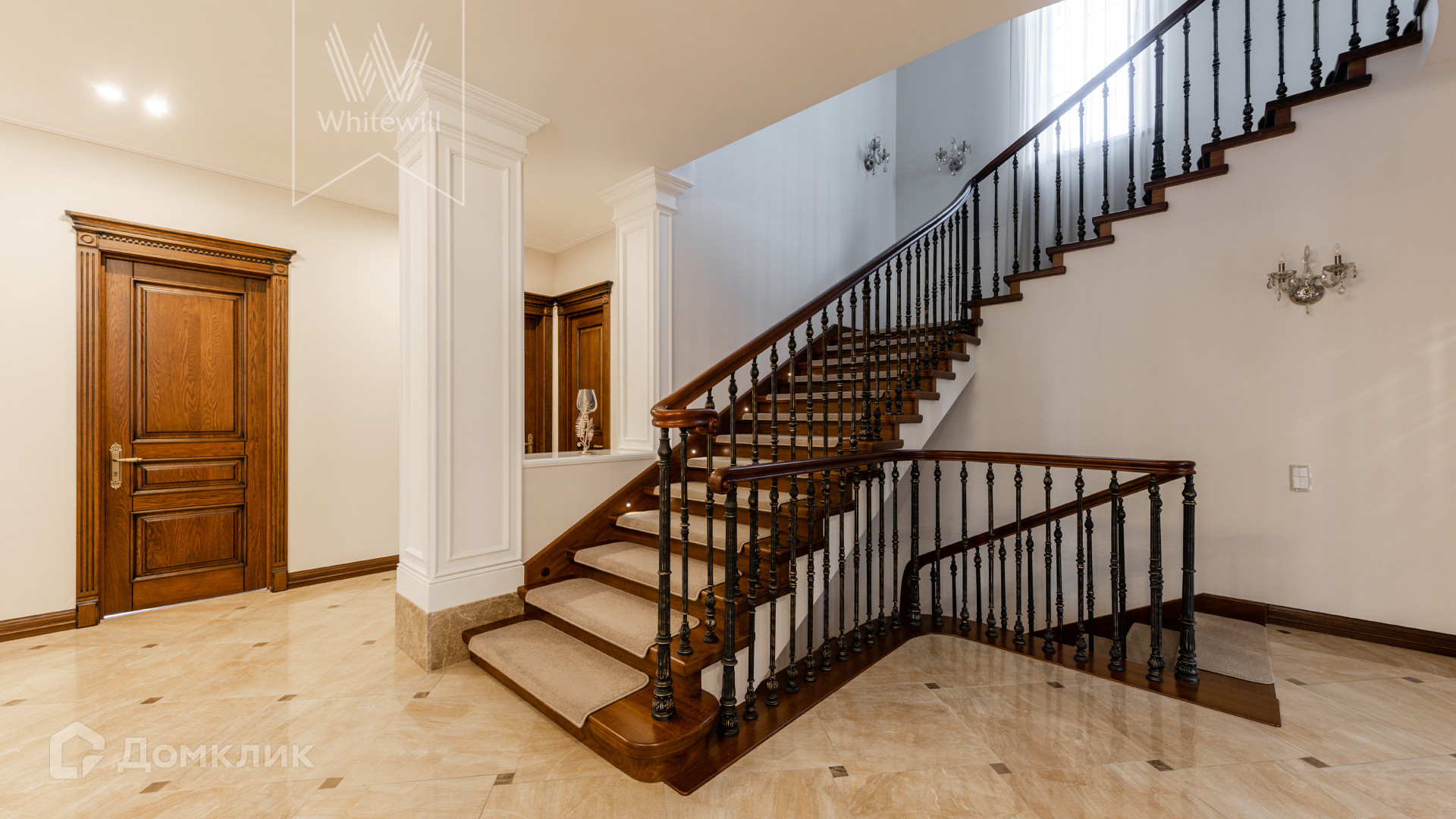 ID 11 549. Антоновка. Просторная загородная резиденция площадью 950 м² расположена на полевом участке 20,9 соток. Светлый фасад облицован натуральным дагестанским камнем, декорирован красно-коричневым клинкером по цоколю, колоннами, резными и коваными элементами. Интерьер в теплых оттенках сочетает элементы классики и современности. Дом укомплектован бытовой техникой Neff и Siemens. В коттедже разместили 5 спален, гостиную с камином, кухню-столовую с выходом на террасу, комнату отдыха, спортзал и сауну. Предусмотрены блок для персонала и гараж на 2 машины. На участке выполнен ландшафтный дизайн, установлено уличное освещение и обустроена беседка с кухней, оборудованной печью, казаном, мангалом и барбекю, и большой столовой, и санузлом .