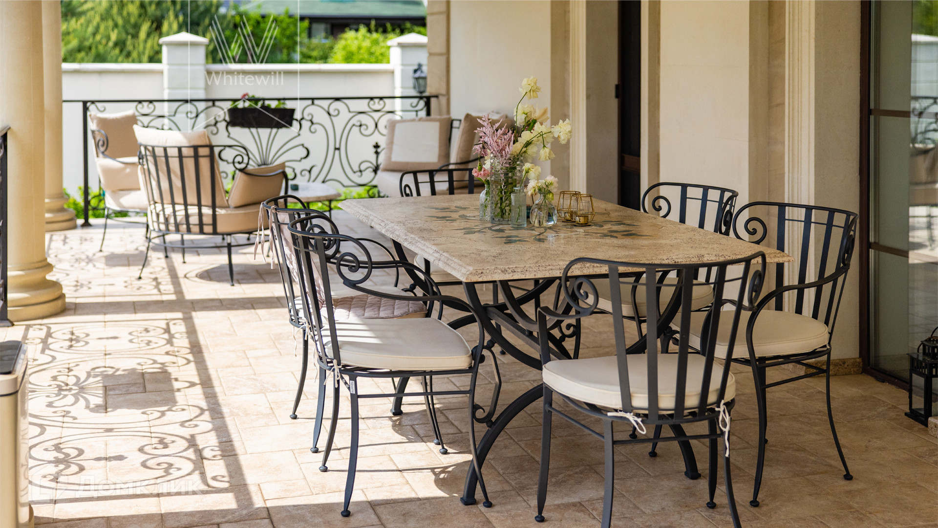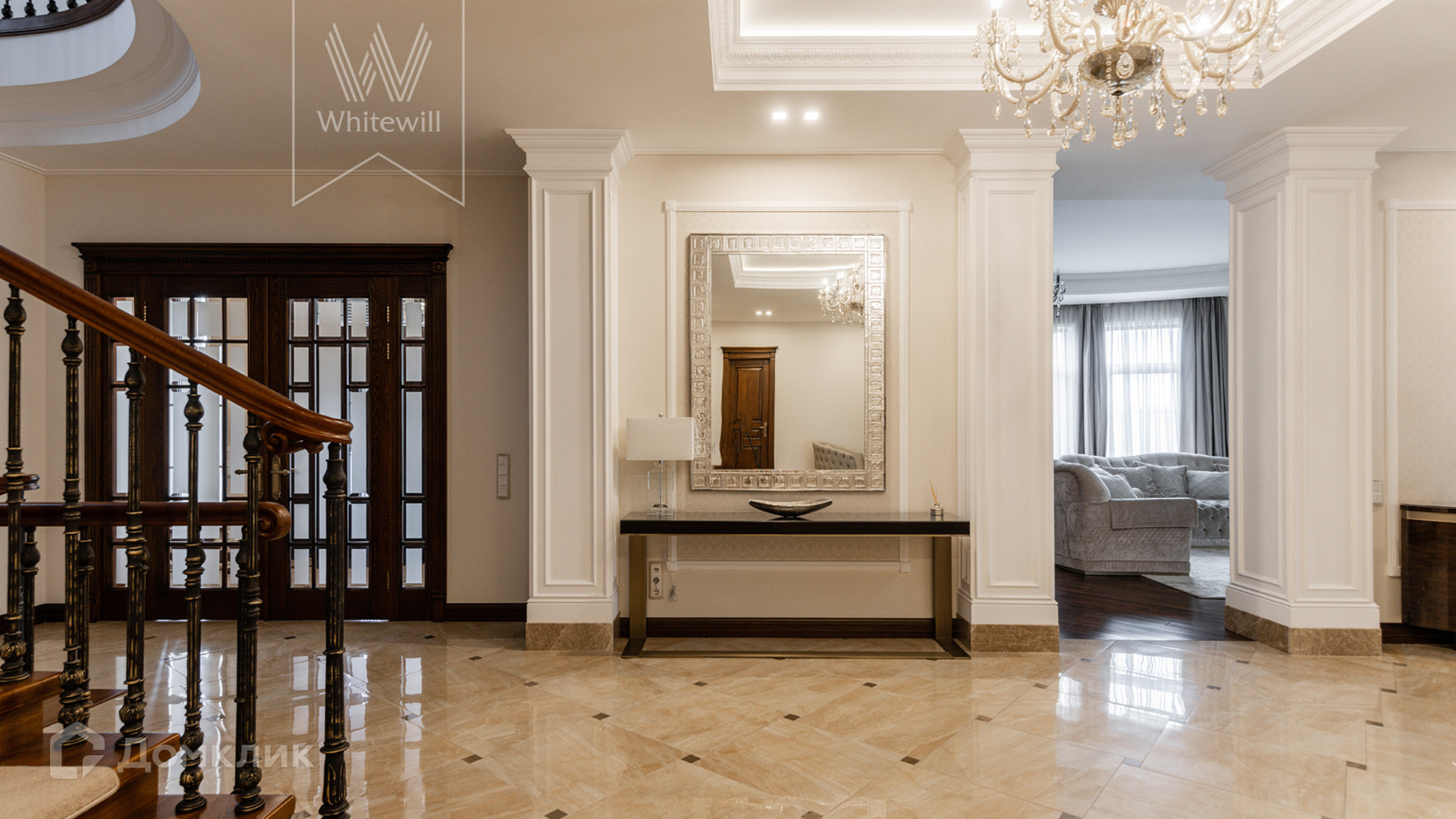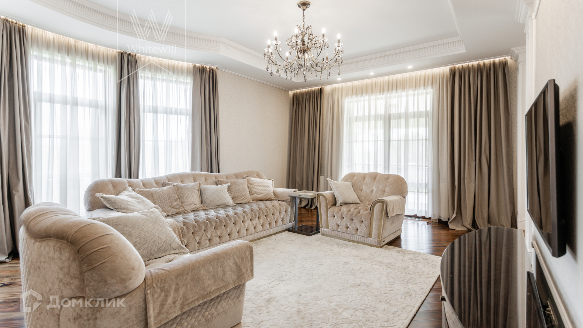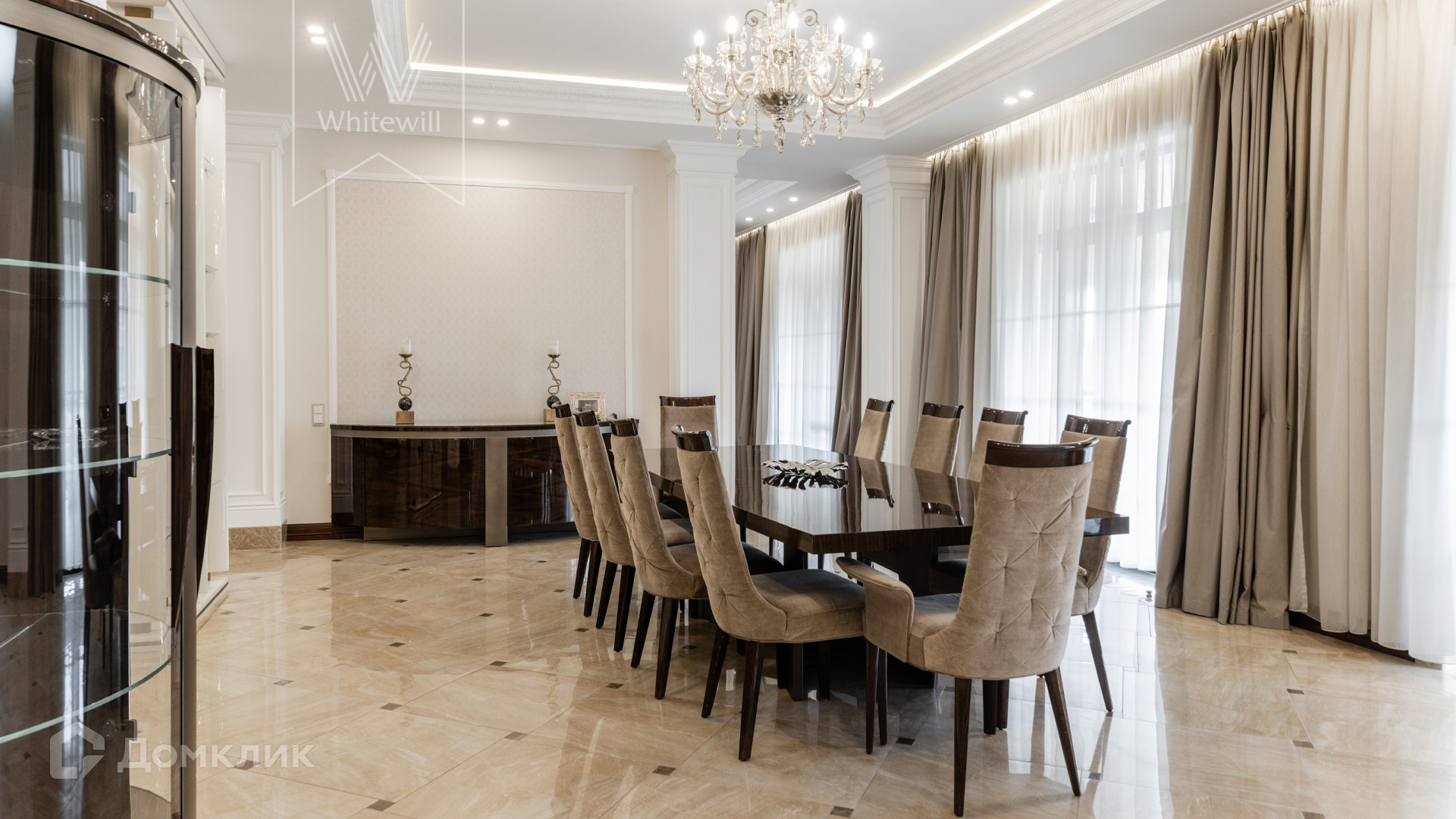 ID 11 549. Антоновка. Просторная загородная резиденция площадью 950 м² расположена на полевом участке 20,9 соток. Светлый фасад облицован натуральным дагестанским камнем, декорирован красно-коричневым клинкером по цоколю, колоннами, резными и коваными элементами. Интерьер в теплых оттенках сочетает элементы классики и современности. Дом укомплектован бытовой техникой Neff и Siemens. В коттедже разместили 5 спален, гостиную с камином, кухню-столовую с выходом на террасу, комнату отдыха, спортзал и сауну. Предусмотрены блок для персонала и гараж на 2 машины. На участке выполнен ландшафтный дизайн, установлено уличное освещение и обустроена беседка с кухней, оборудованной печью, казаном, мангалом и барбекю, и большой столовой, и санузлом .