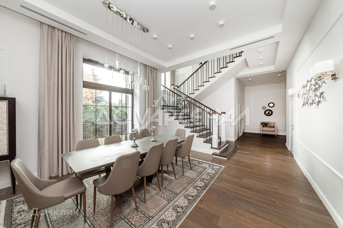 В доме 6 уютных спален, из которых: мастер-спальня 60 кв.м с приватным холлом-гостиной, с/у и выходом на балкон, две спальни (24 и 26 кв.м) с гардеробными и собственными с/у; просторная двух зонная гостиная с выходом на террасу, столовая, кухня, кабинет, детская игровая, великолепная SPA-зона: бассейн (9х4,5 м), хаммам, душевая с с/у.
