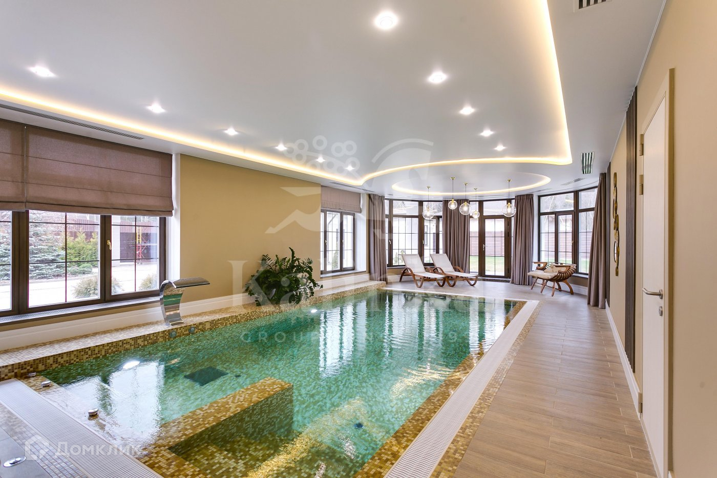 На 1-м этаже расположены  прихожая, гостиная с камином и выходом на террасу, столовая, кухня, кабинет, спортзал/игровая, с/у, постирочная, спа- зона : бассейн 6 *3 метра, хамам, душ, комната отдыха, с/у; котельная.