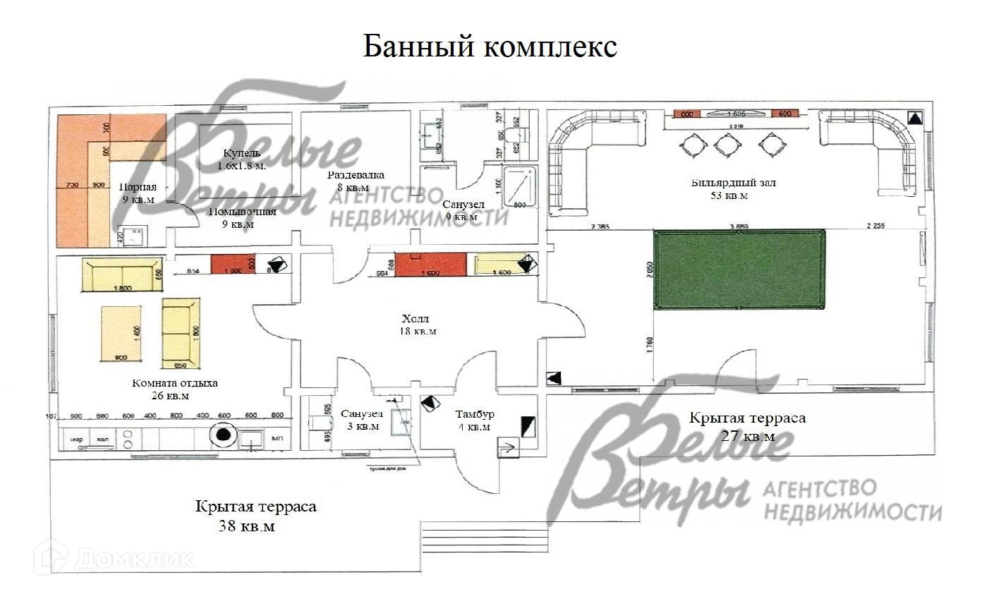 Доп. строения: Одноэтажный банный комплекс из клеёного бруса лиственных пород дерева площадью 200 кв.м под ключ. Высота потолков 3.6 м. Тамбур 4 кв.м, холл 18 кв.м, санузел 3 кв.м, комната отдыха 26 кв.м, парная 9 кв.м, помывочная 9 кв.м, раздевалка 8 кв.м, санузел 9 кв.м, бильярдная 53 кв.м, терраса 27 кв.м, терраса 38 кв.м..