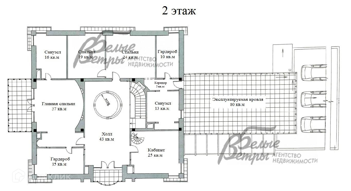 2-ой этаж: холл 43 кв.м, балкон 3 кв.м, кабинет 25 кв.м, главная спальня 37 кв.м, гардеробная 15 кв.м, санузел 16 кв.м, балкон 16 кв.м, спальня 19 кв.м, спальня 24 кв.м, гардеробная 10 кв.м, коридор 5 кв.м, санузел 13 кв.м, эксплуатируемая кровля 80 кв.м..