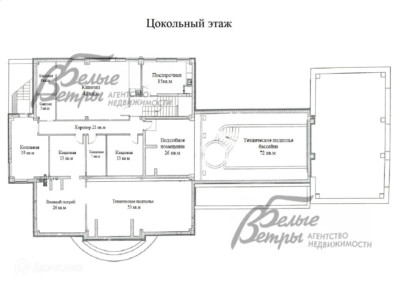 Цокольный этаж: техническое помещение бассейна 72 кв.м, подсобное помещение 26 кв.м, коридор 21 кв.м, постирочная 15 кв.м, кинозал 42 кв.м, кладовая 6 кв.м, санузел 5 кв.м, кладовая 13 кв.м, кладовая 7 кв.м, кладовая 7 кв.м, винный погреб 26 кв.м, техническое подполье 53 кв.м, котельная 19 кв.м..