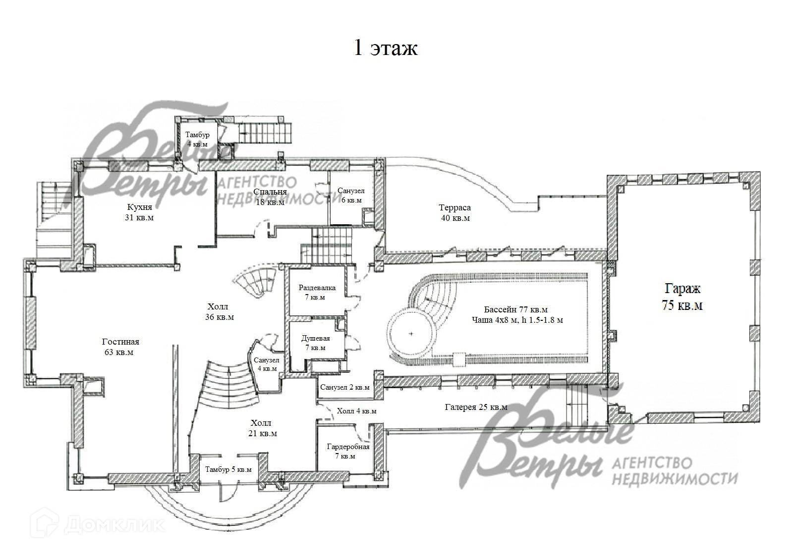 1-ый этаж: гараж 75 кв.м, галерея 25 кв.м, коридор 4 кв.м, сезонная гардеробная 7 кв.м, холл 21 кв.м, тамбур 5 кв.м, холл 36 кв.м, гостиная 63 кв.м, санузел 4 кв.м, кухня 31 кв.м, тамбур 4 кв.м, спальня 18 кв.м, санузел 6 кв.м, бассейн 77 кв.м, душевая 7 кв.м, раздевалка 7 кв.м, санузел 2 кв.м, терраса 40 кв.м..