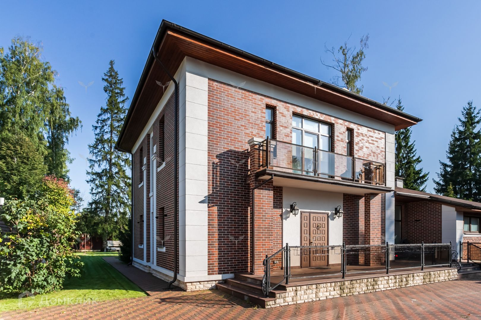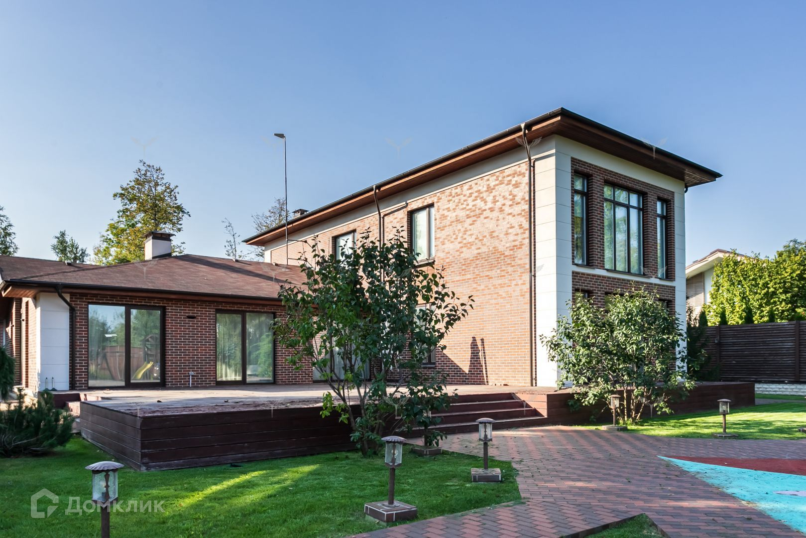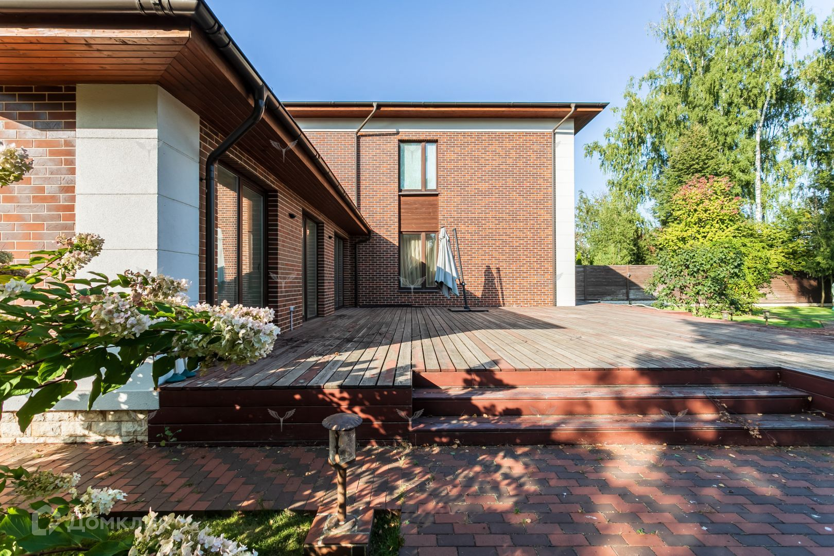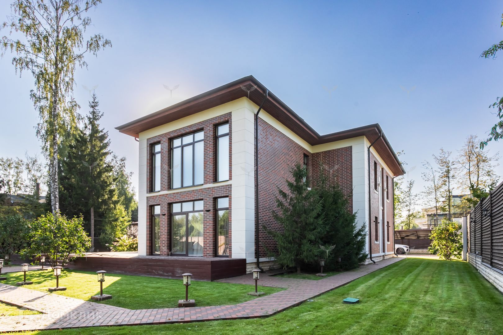 Участок дома отличается исключительным ландшафтным дизайном. Партерные газоны, взрослые деревья и кустарники создают атмосферу уюта и спокойствия. Автоматизированная система полива и освещения дополняют этот оазис комфорта. Тропинки и дорожки вымощены гранитом и клинкером, подчеркивая статус этого объекта.
