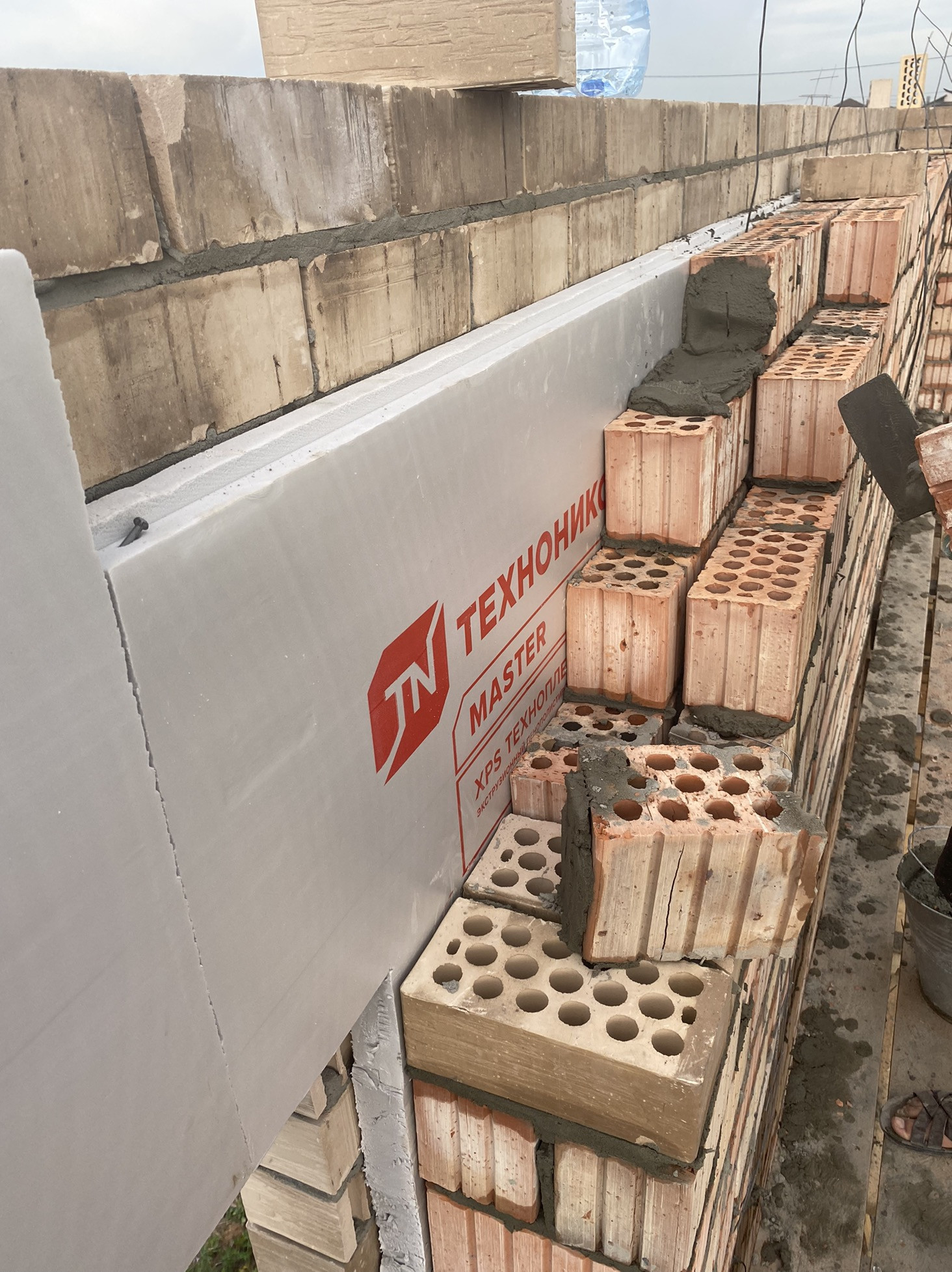 Стена 430. Полкирпича облицовка, утеплитель 50, черновая кладка керамический кирпич 250 мм. Утеплитель Экструдированный пенополистирол (XPS) 50мм полностью пропенен по всему контуру. Есть много споров на тему утеплителя, но этот самый тёплый для стен.