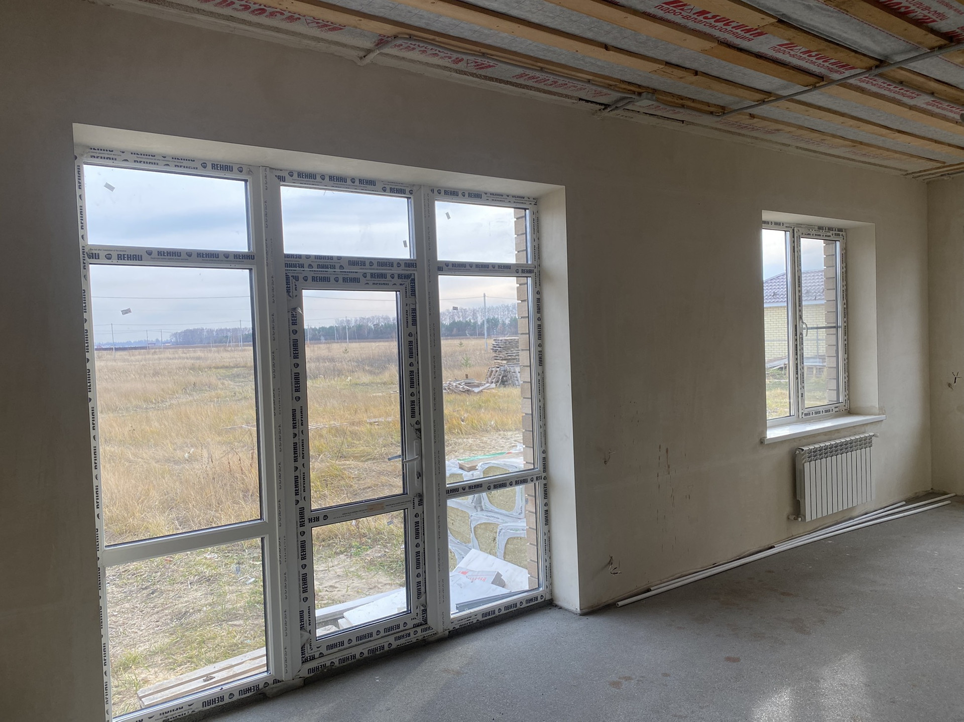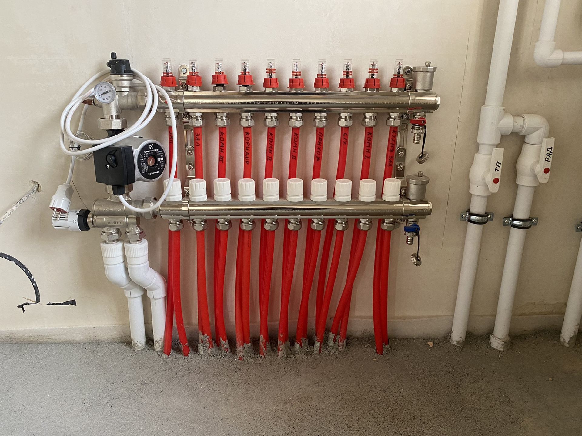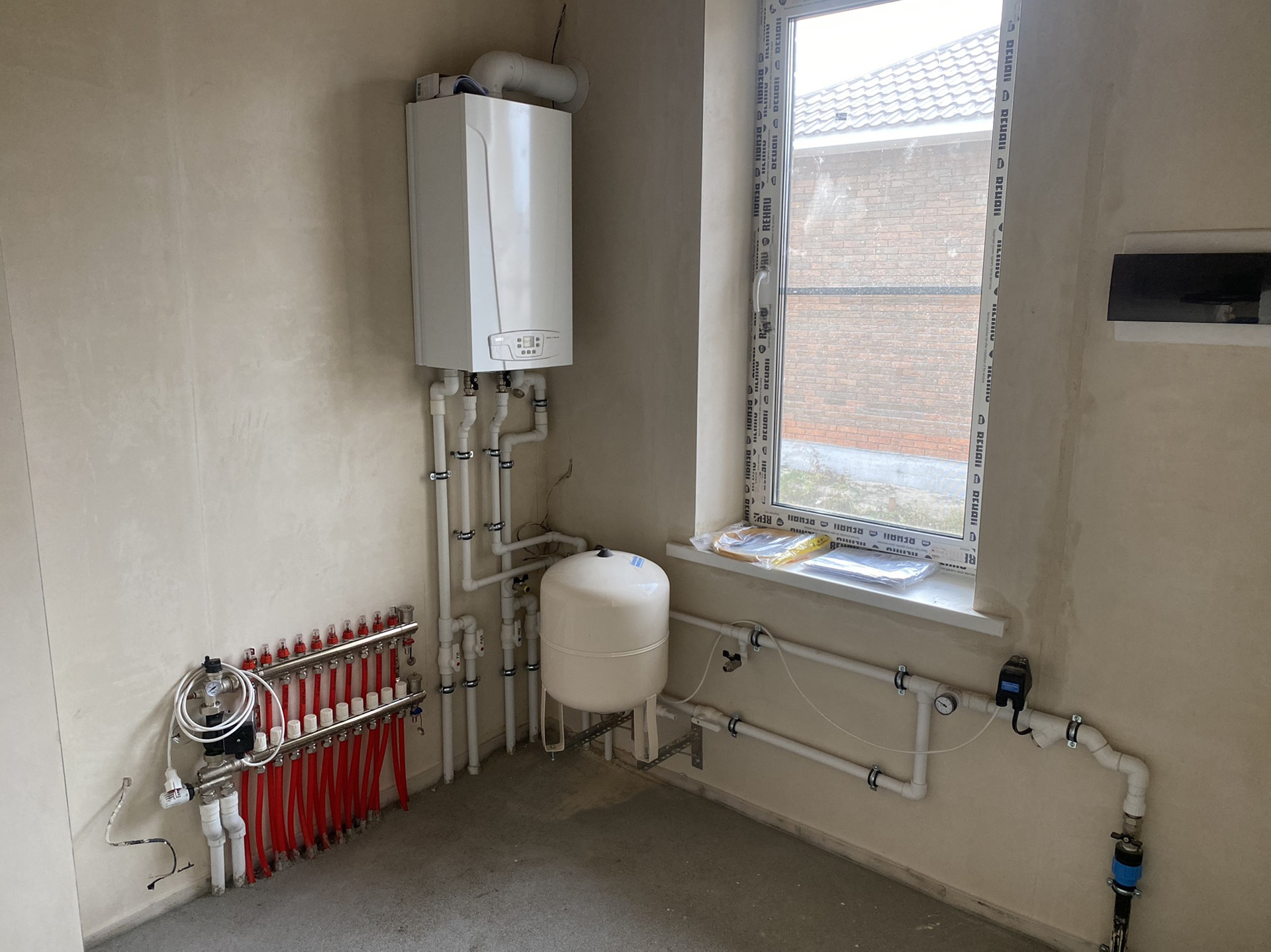 Отопление проведено. Тёплые полы абсолютно по всему дому - 10 контуров. Котёл Baxi (Италия), смесительная группа тоже итальянская. Циркуляционный насос Grundfos (Германия). Под окнами батареи.