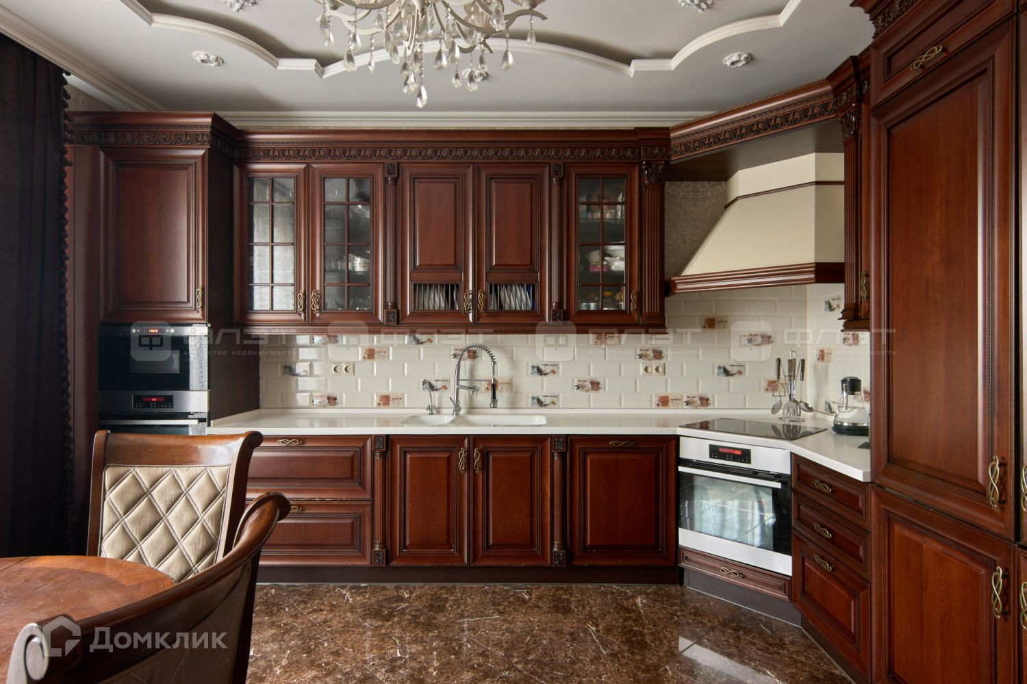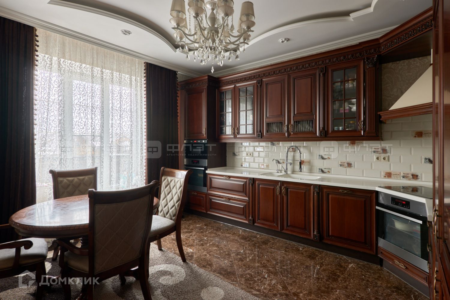 В кабинете рабочий стол и книжные шкафы, установлен изысканный - итальянский кухонный гарнитур.