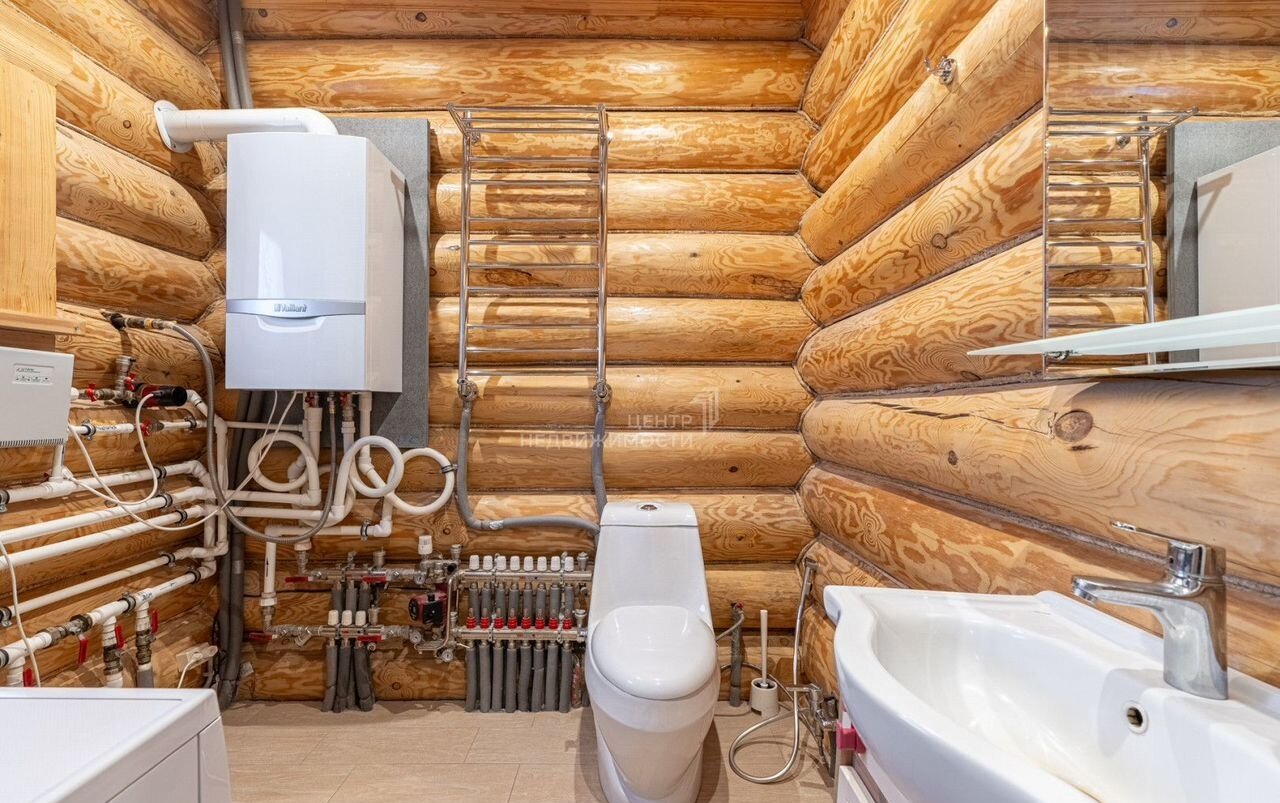На первом этаже расположена кухня, гостиная, санузел и сауна с дровяной печью, которая также служит камином в гостиной. Оборудование для водоподготовки, отоплению и нагреву воды расположено в отдельной комнате.
