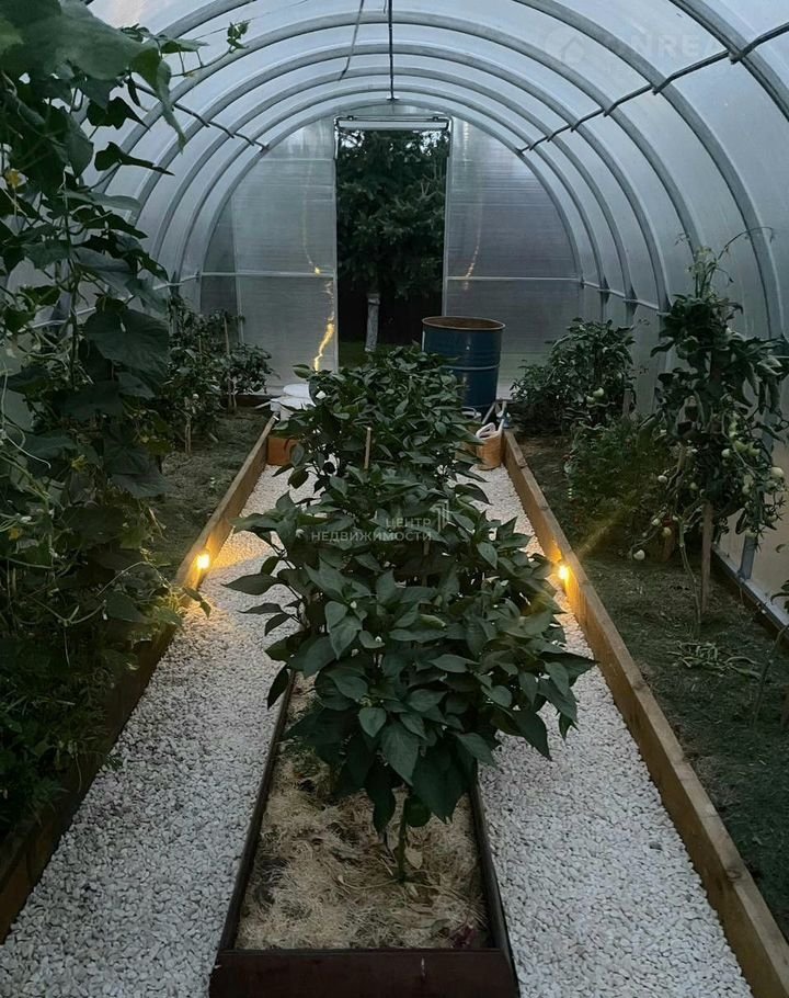 В дальнем углу двора организована зона огорода с теплицей.