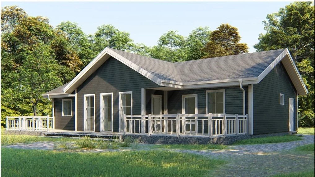 стены - каркас из сухой доски, собраны на производстве в цеху, утепление - 150 мм, мембрана и пароветрозащита, вентзазор - 50 мм, тонкопильная, брашерованная и окрашенная на производстве фасадная доска;