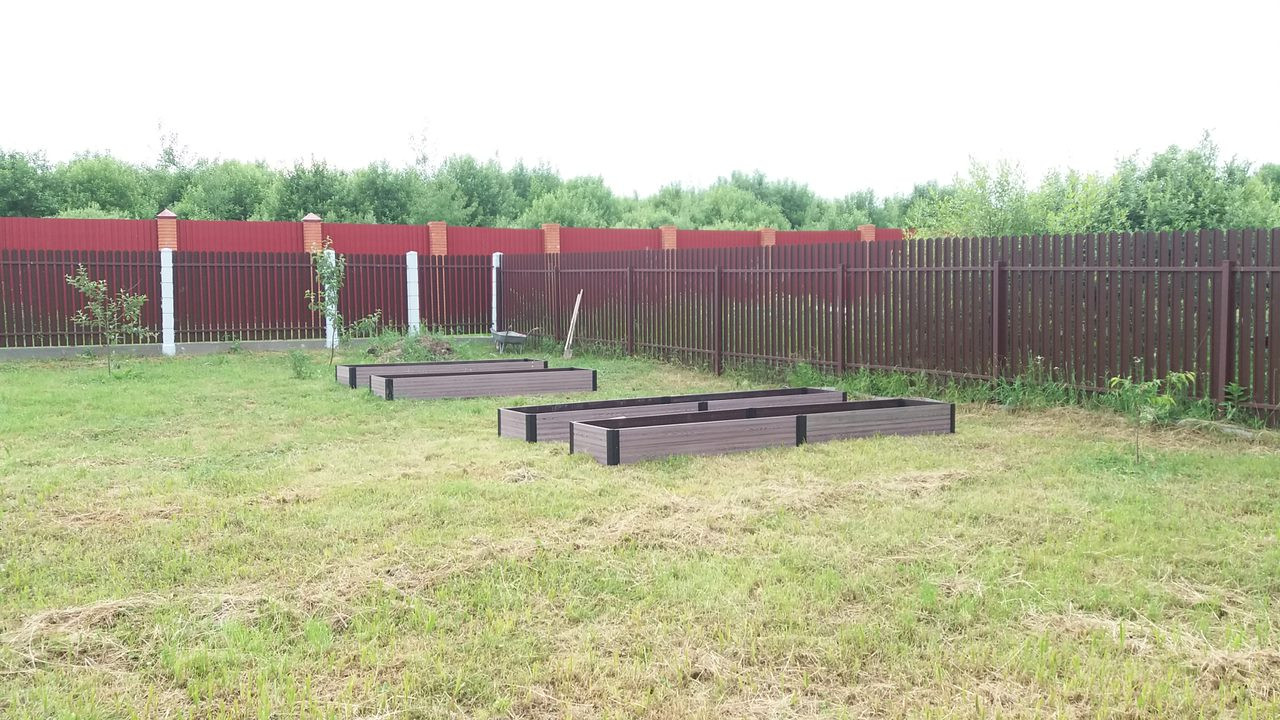 Забор по периметру из евроштакетника с декоративными бетонными столбами по лицевой стороне.