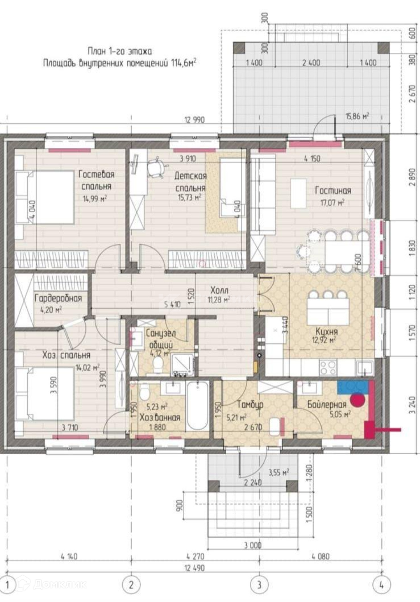 3. Спальни - в доме есть три спальни, в каждой из которых можно разместить кровать и шкаф для одежды.