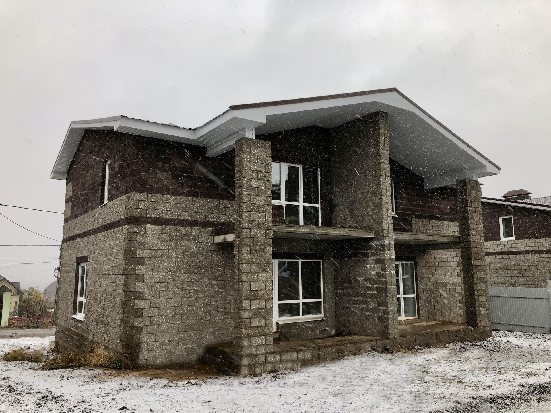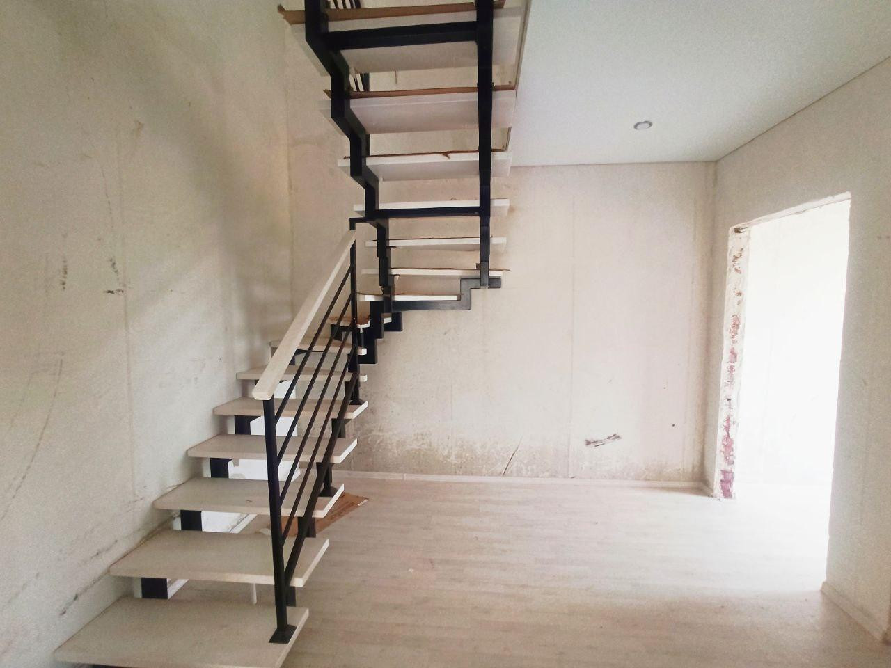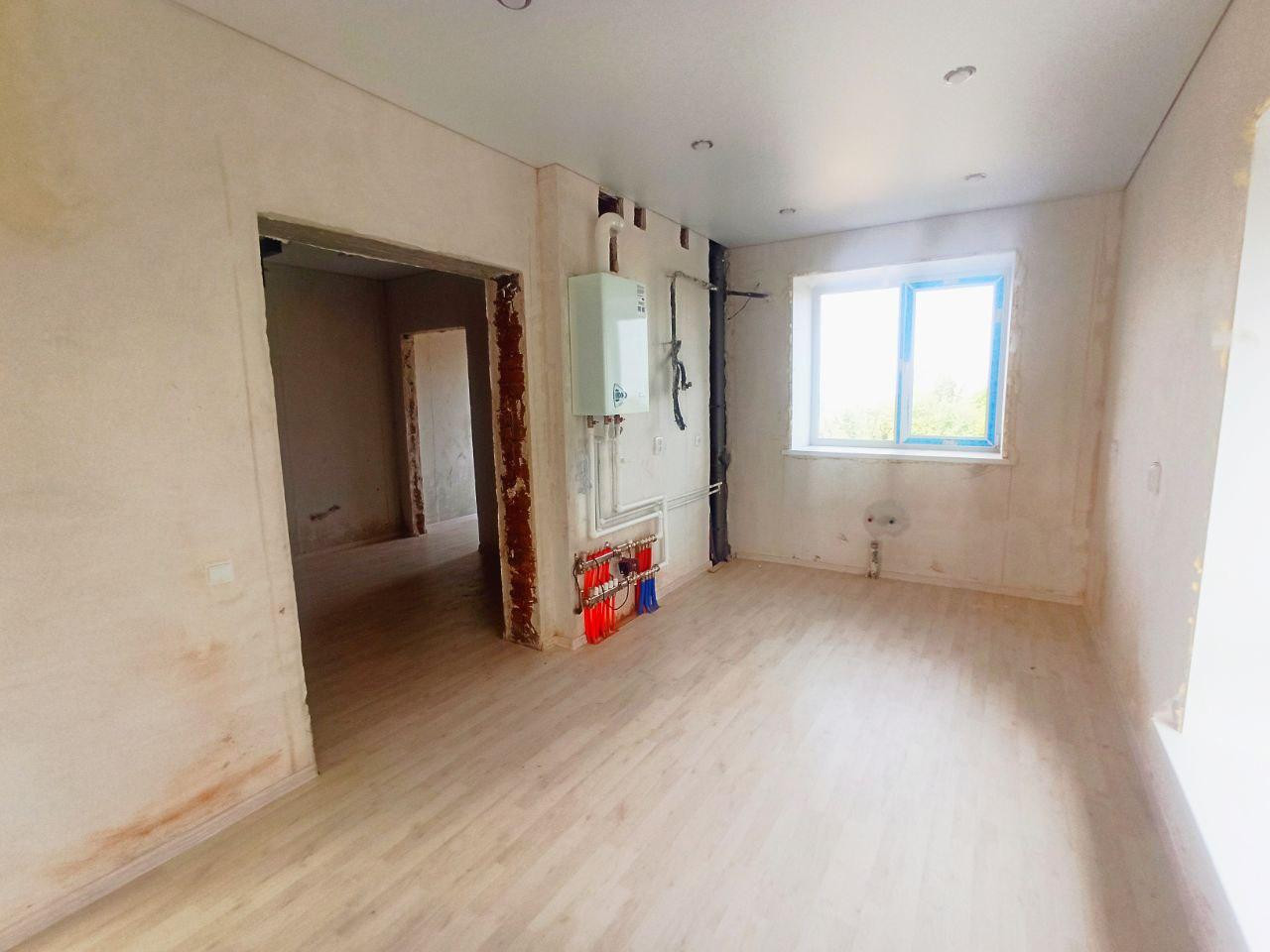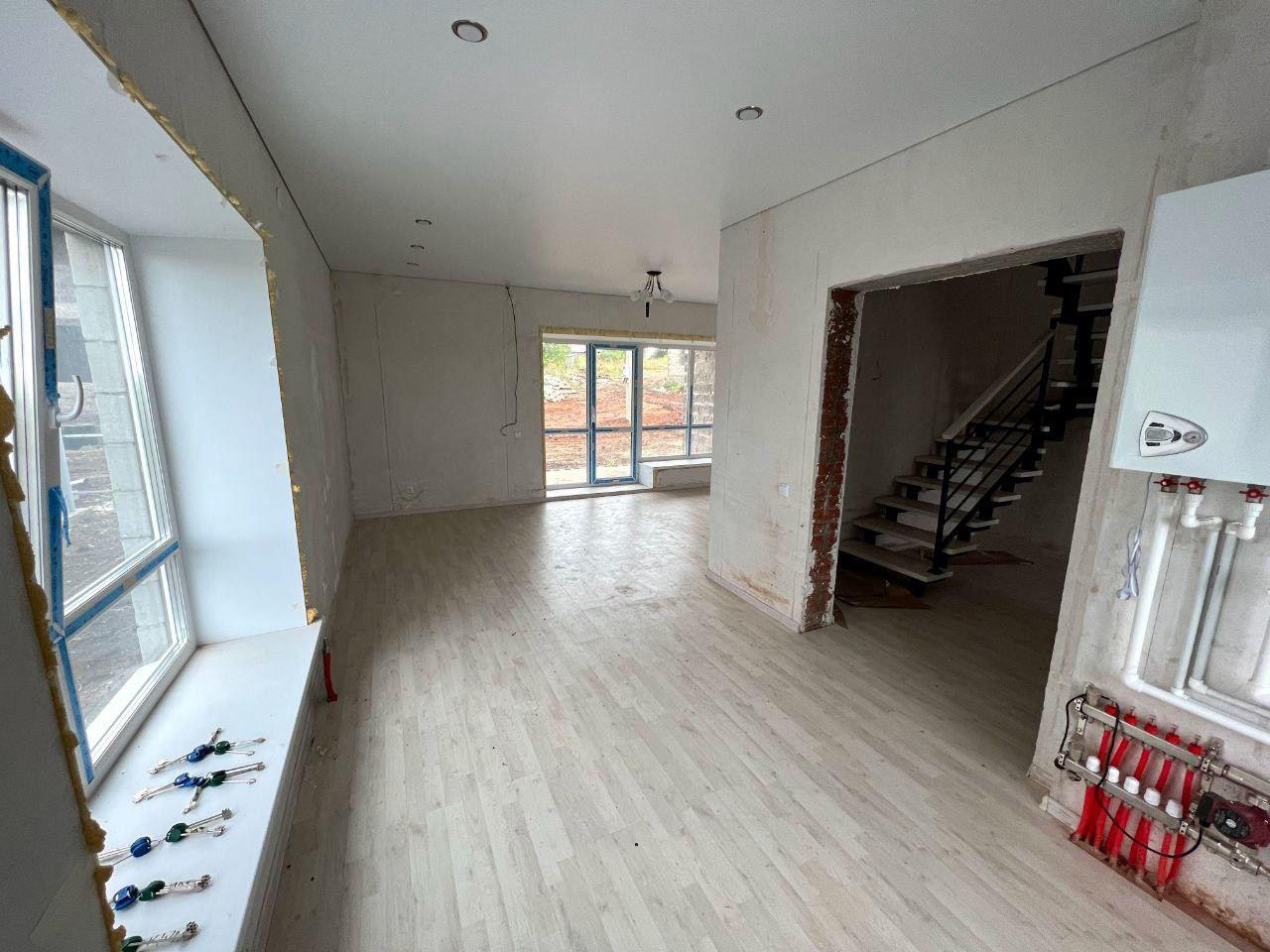 Черновая: стяжка пола, штукатурка стен, входная дверь, газовый котёл (1 этаж - тёплый пол с выводами под радиаторы, 2 этаж - радиаторы), заведённые в дом электричество, вода, канализация.