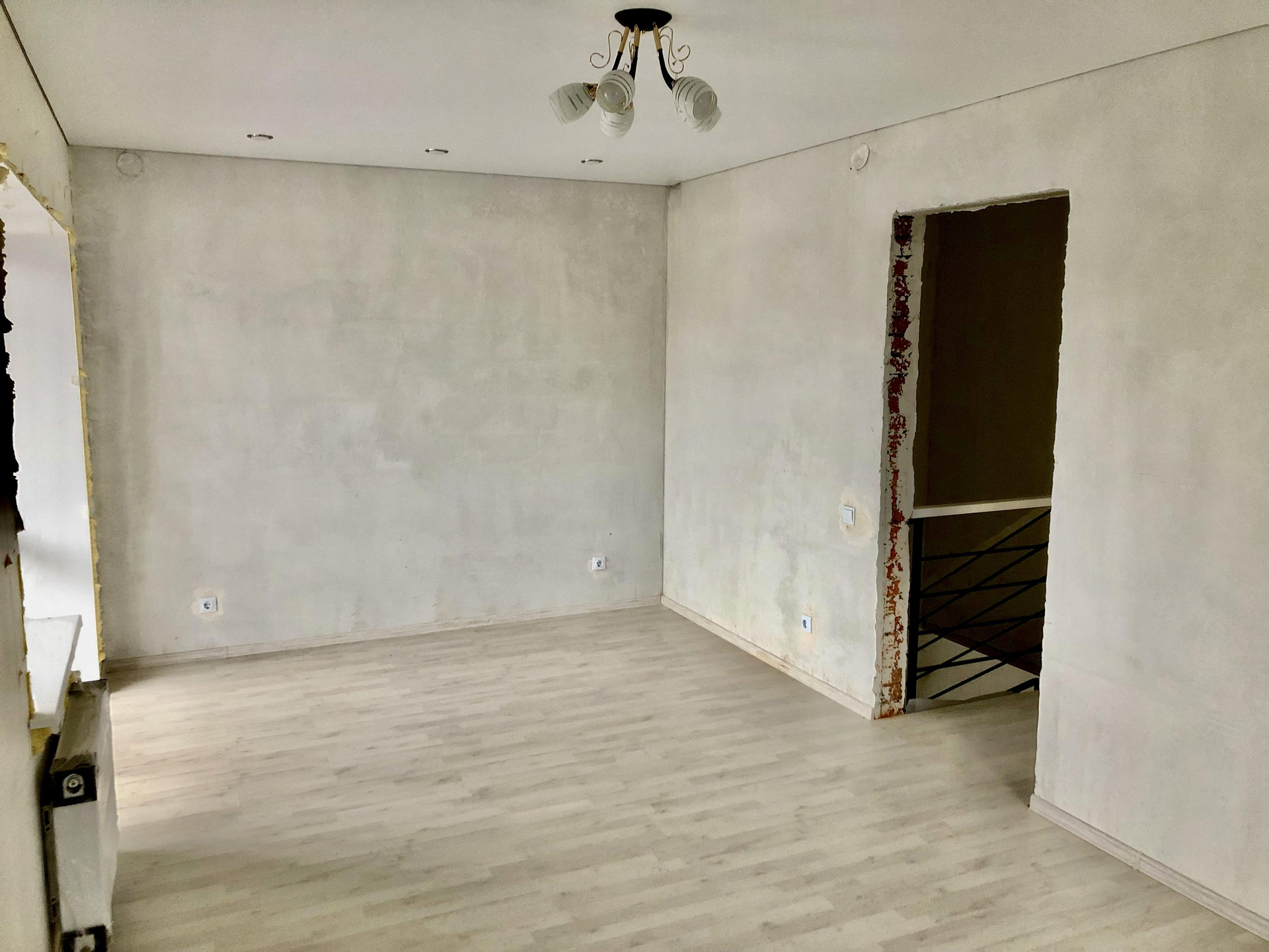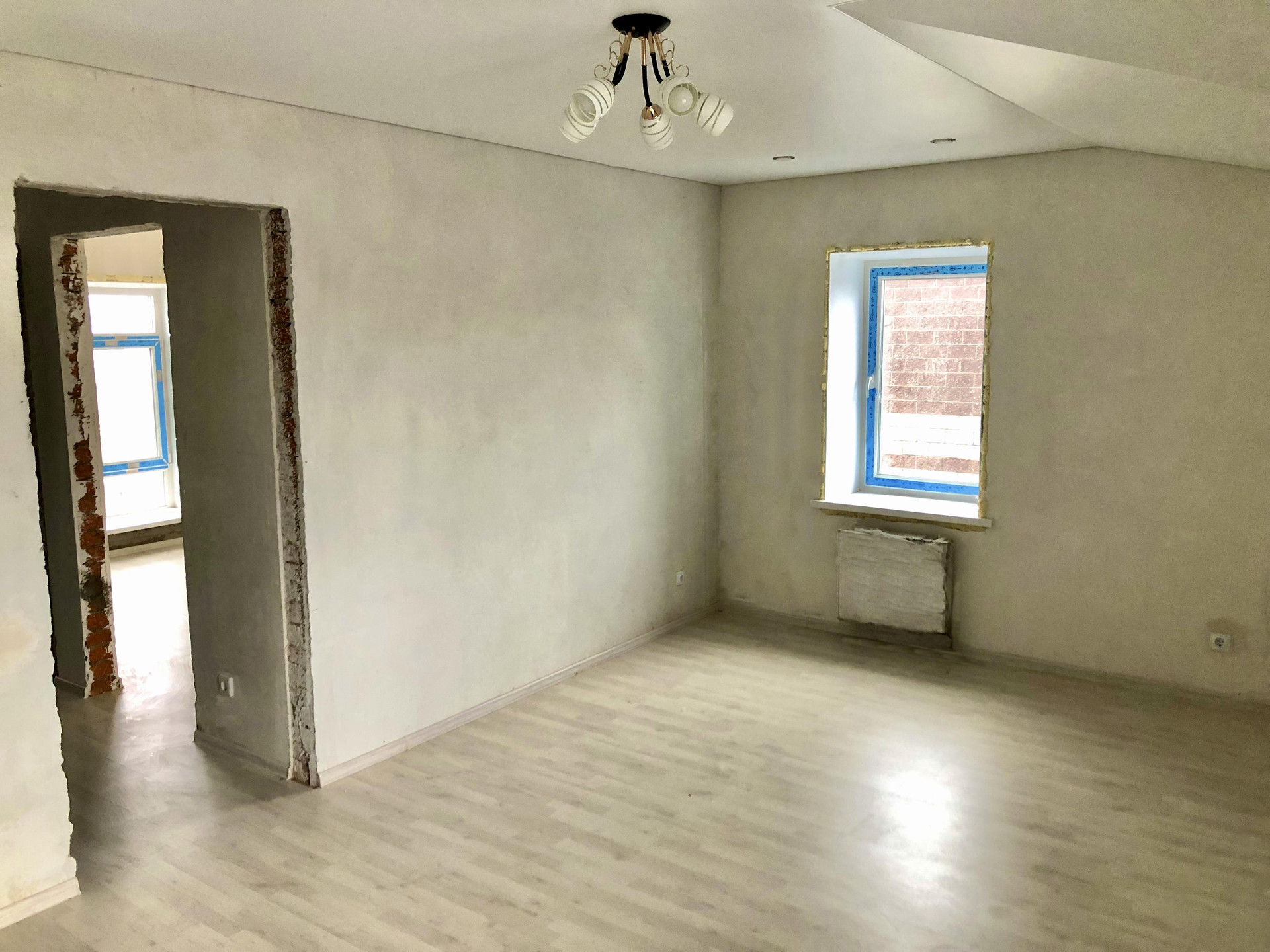 Получистовая: дополнительно к черновой (во всех помещениях, кроме санузлов): натяжной потолок с точечными светильниками, оконные откосы и подоконники, выровненные «под маяк» стены, ровный пол.