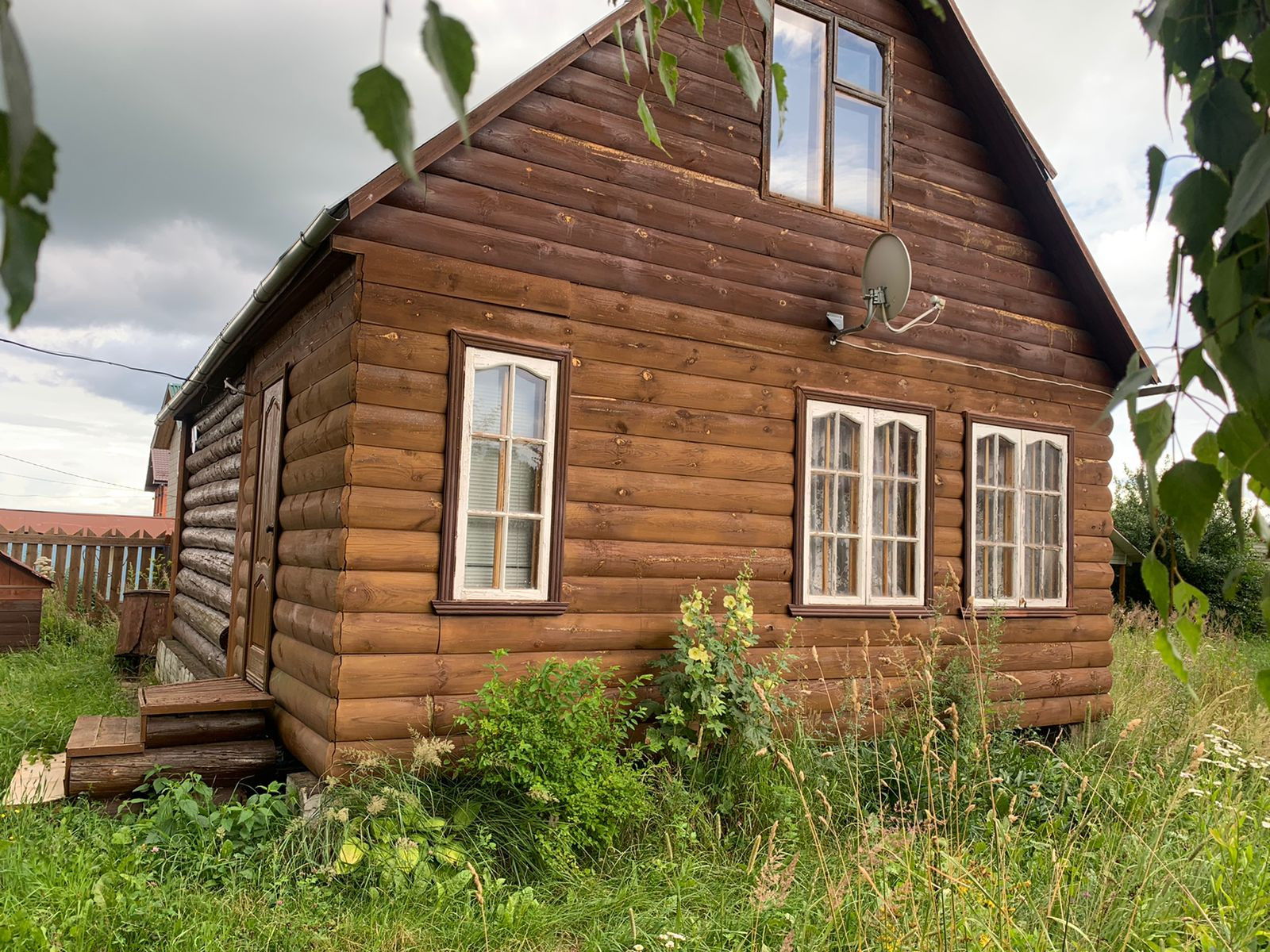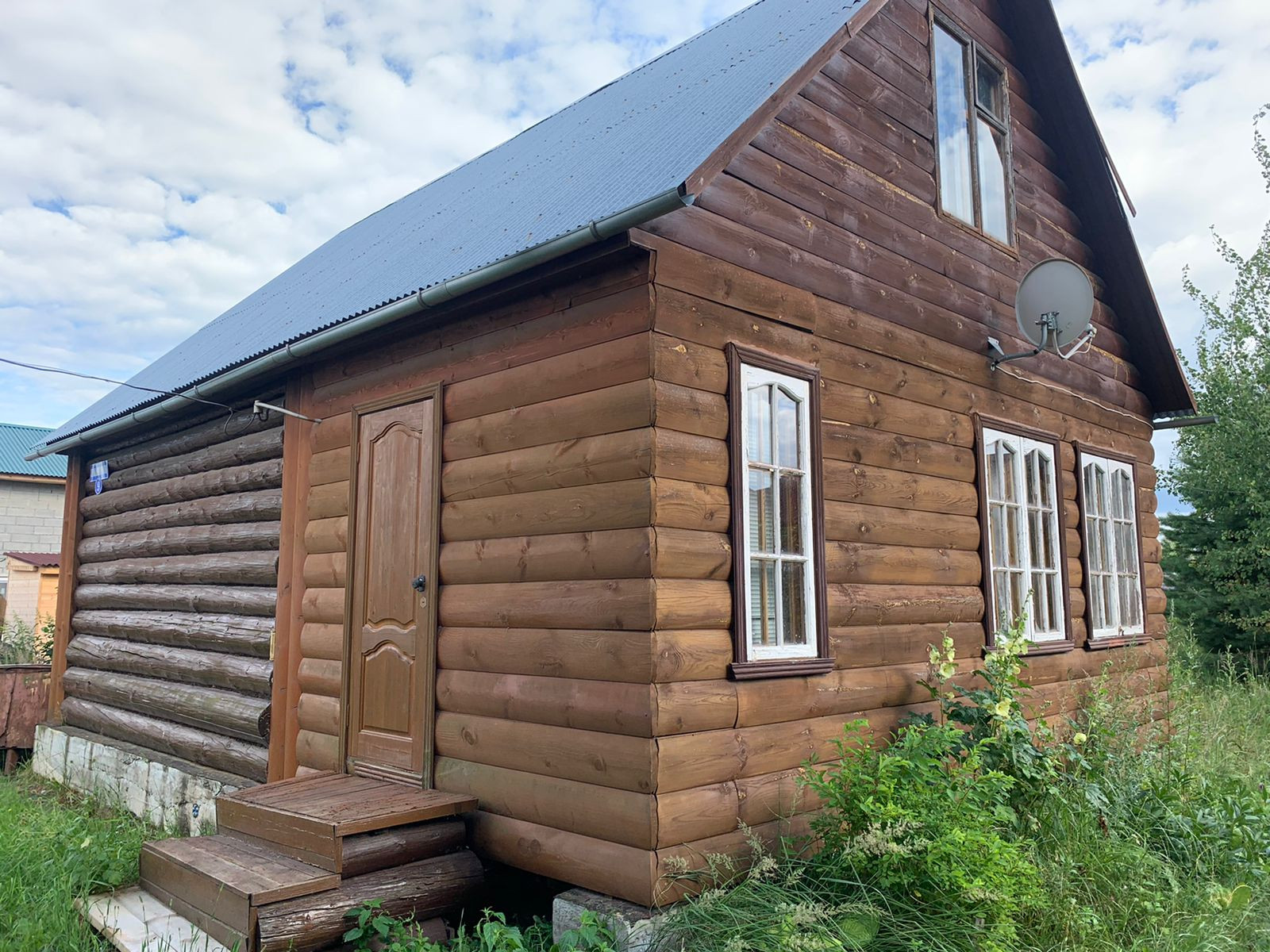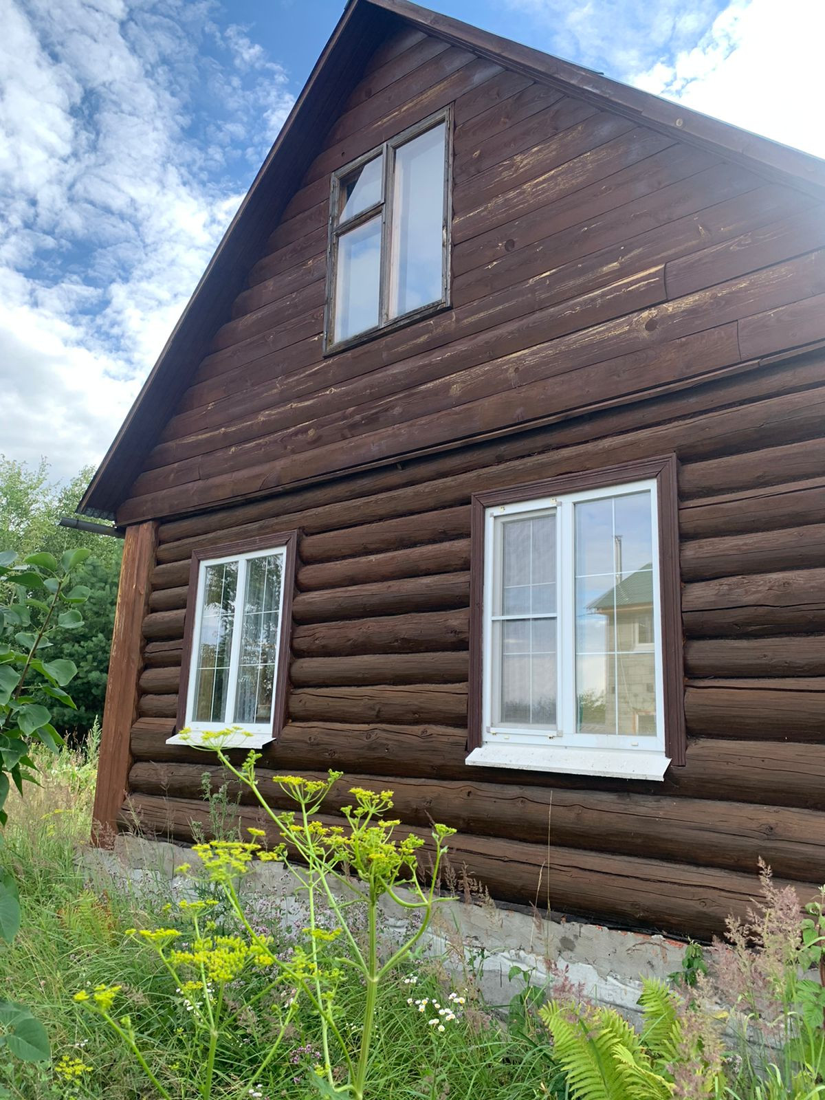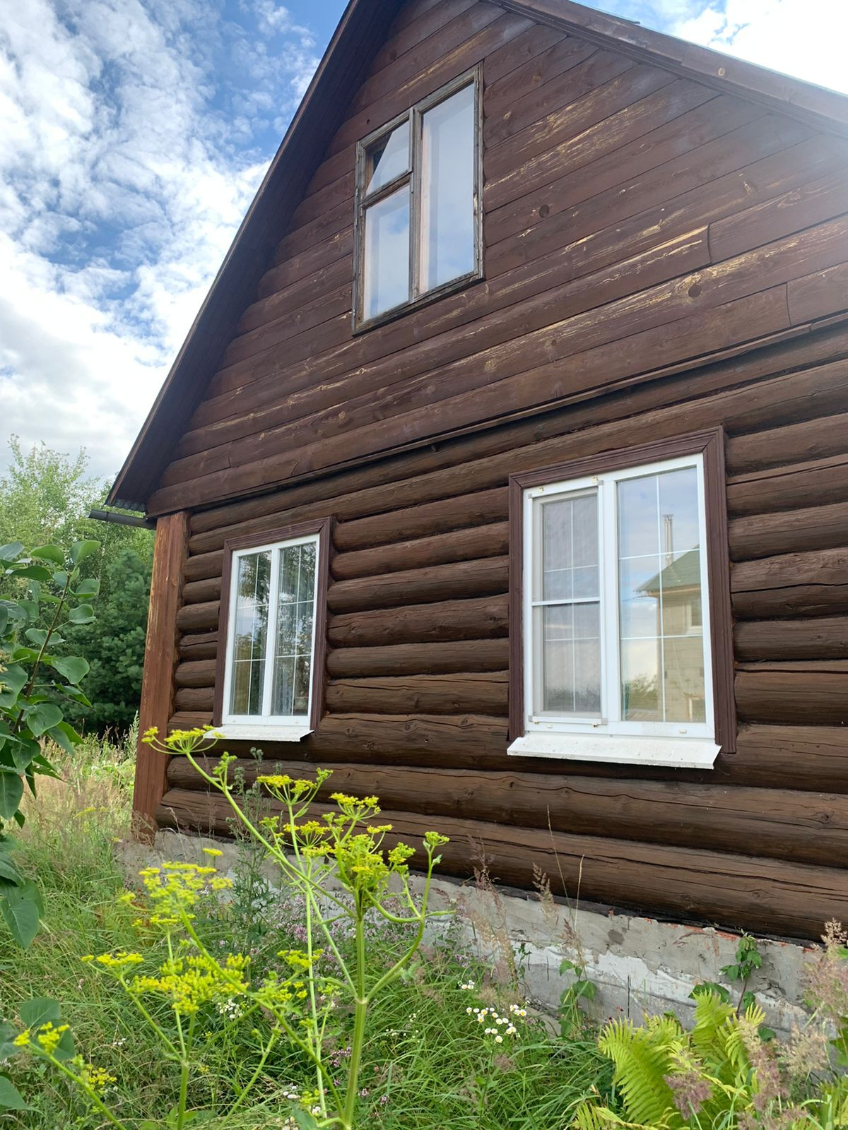 Бревенчатый дом общей площадью 77м2, на первом этаже окна  ПВХ.  Мансардный этаж на 2 комнаты , первый этаж 1 большая комната. Крыша металлочерепица, фундамент ленточный.