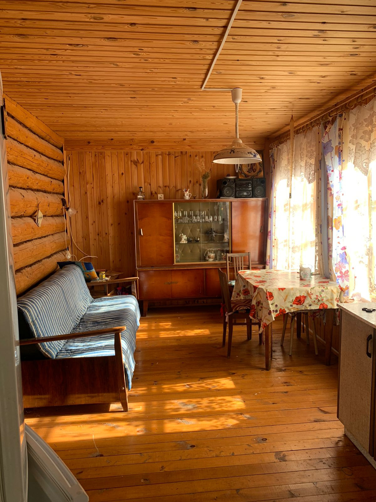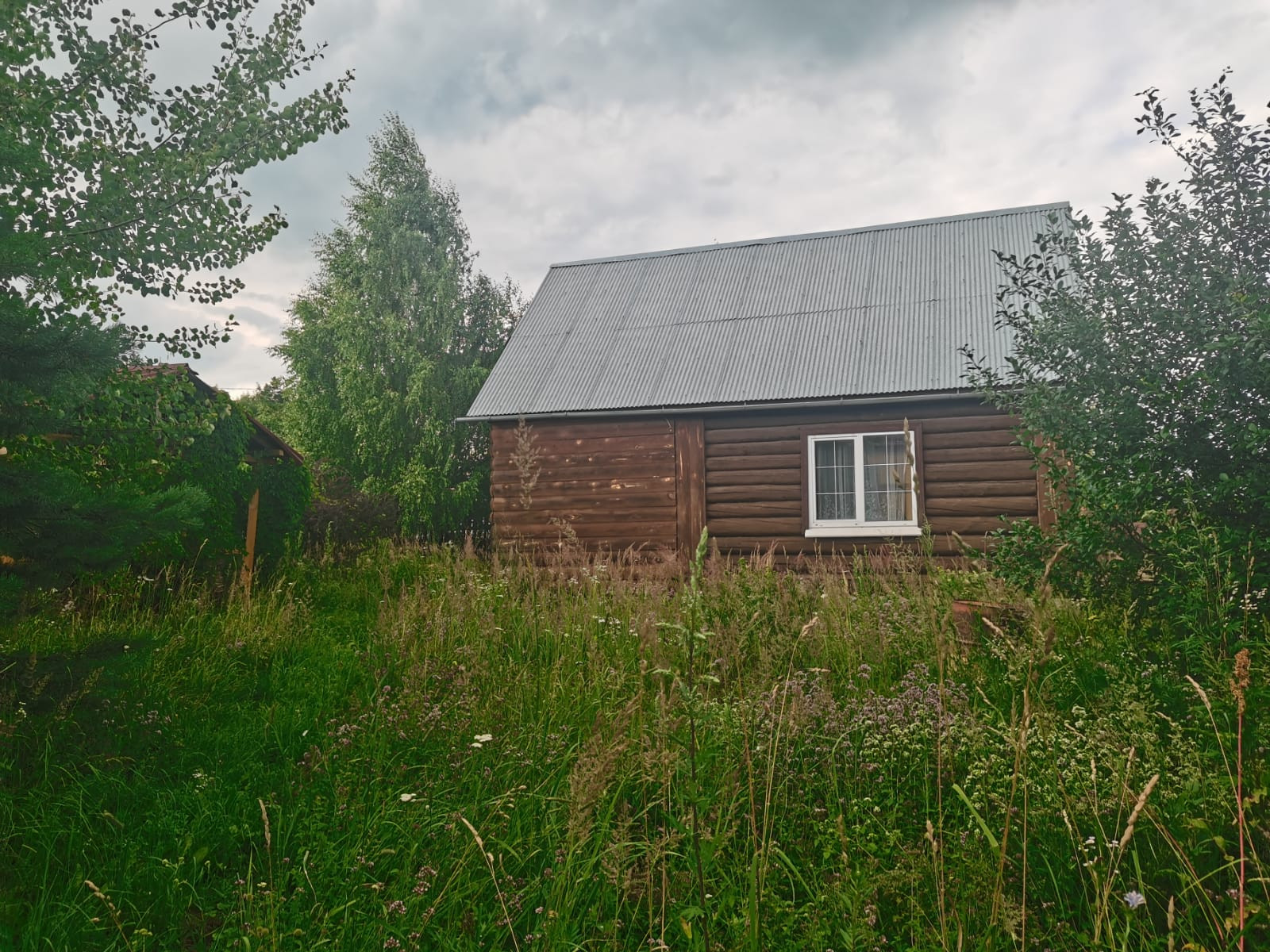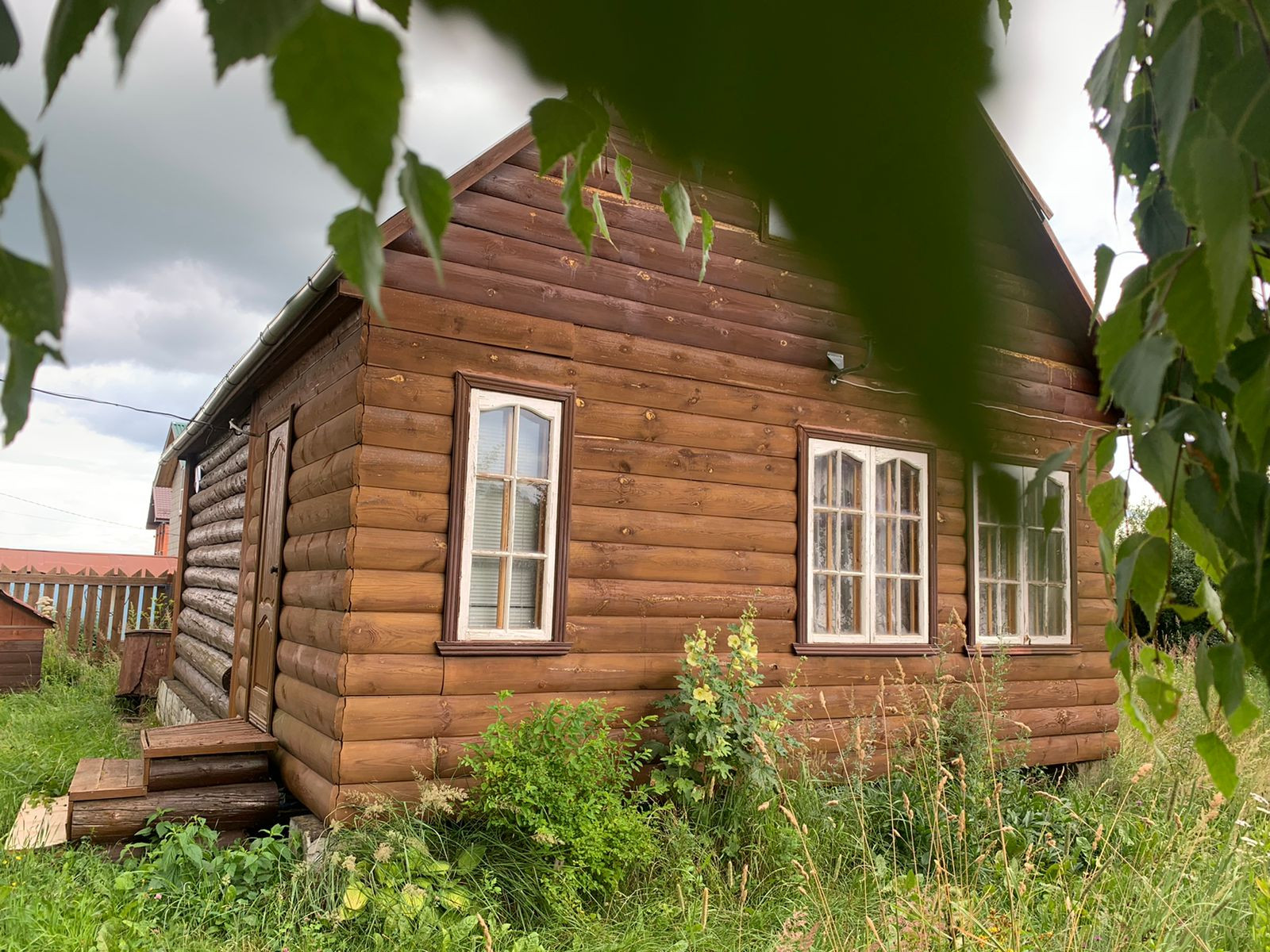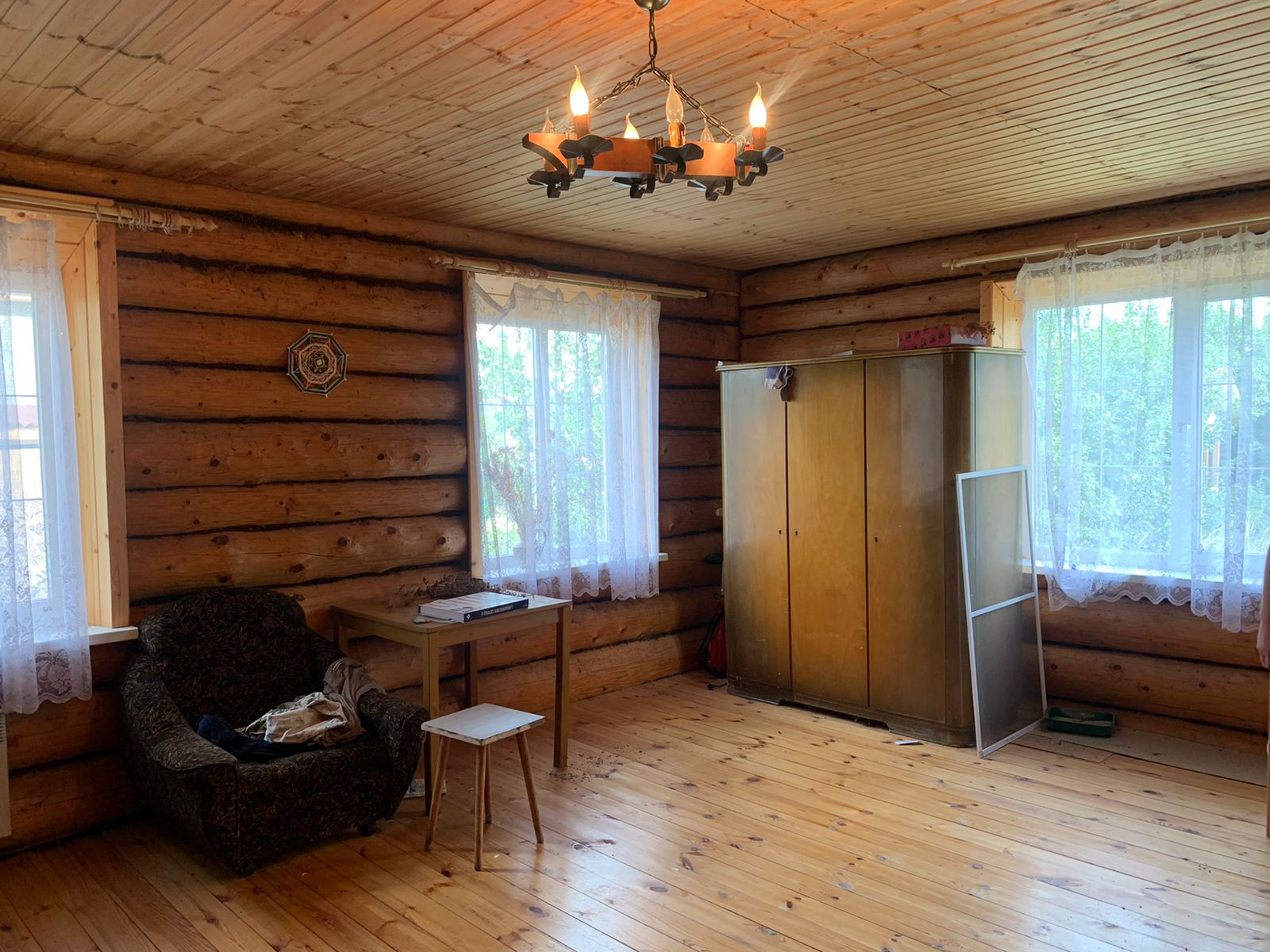Бревенчатый дом общей площадью 77м2, на первом этаже окна  ПВХ.  Мансардный этаж на 2 комнаты , первый этаж 1 большая комната. Крыша металлочерепица, фундамент ленточный.