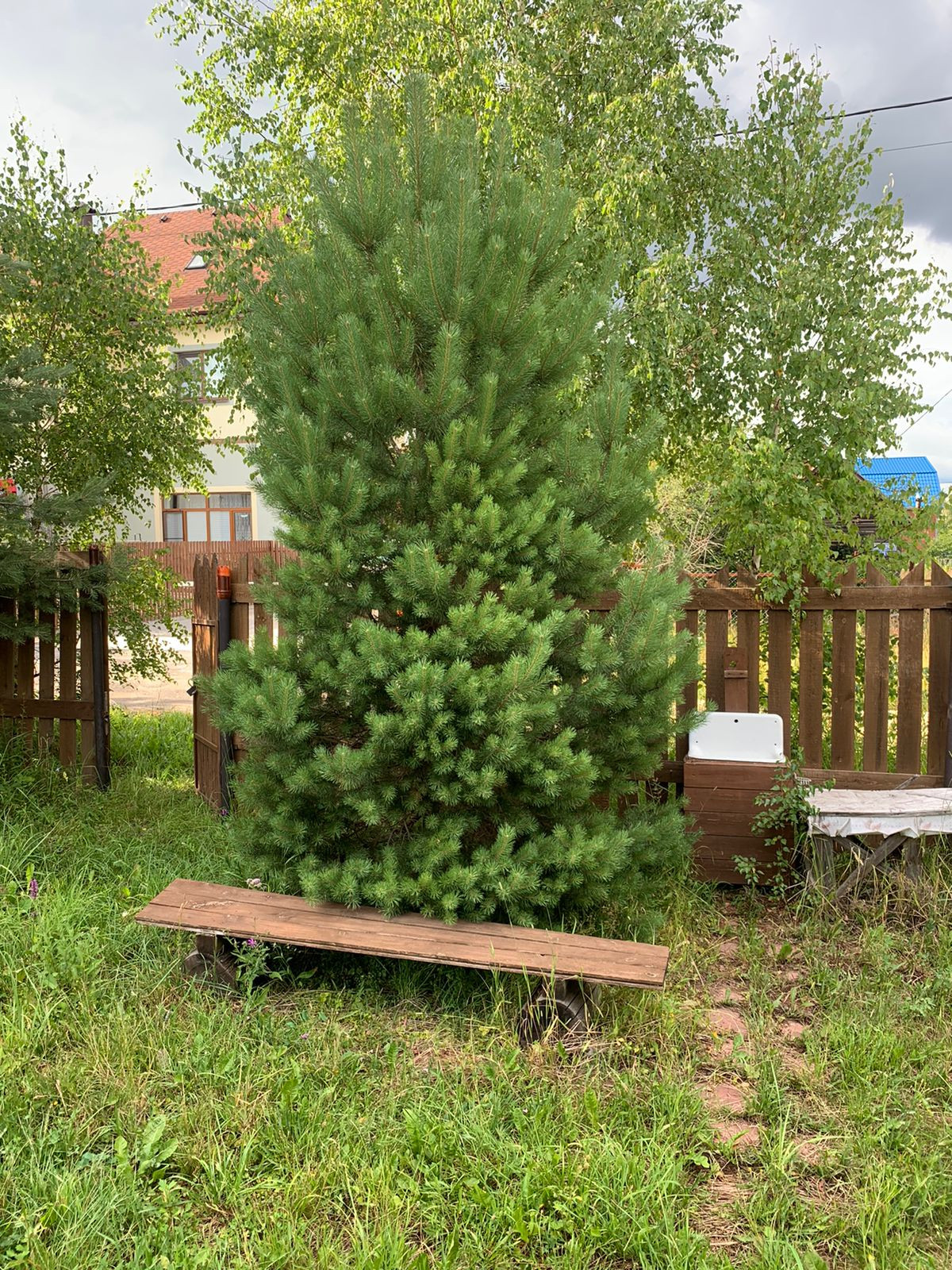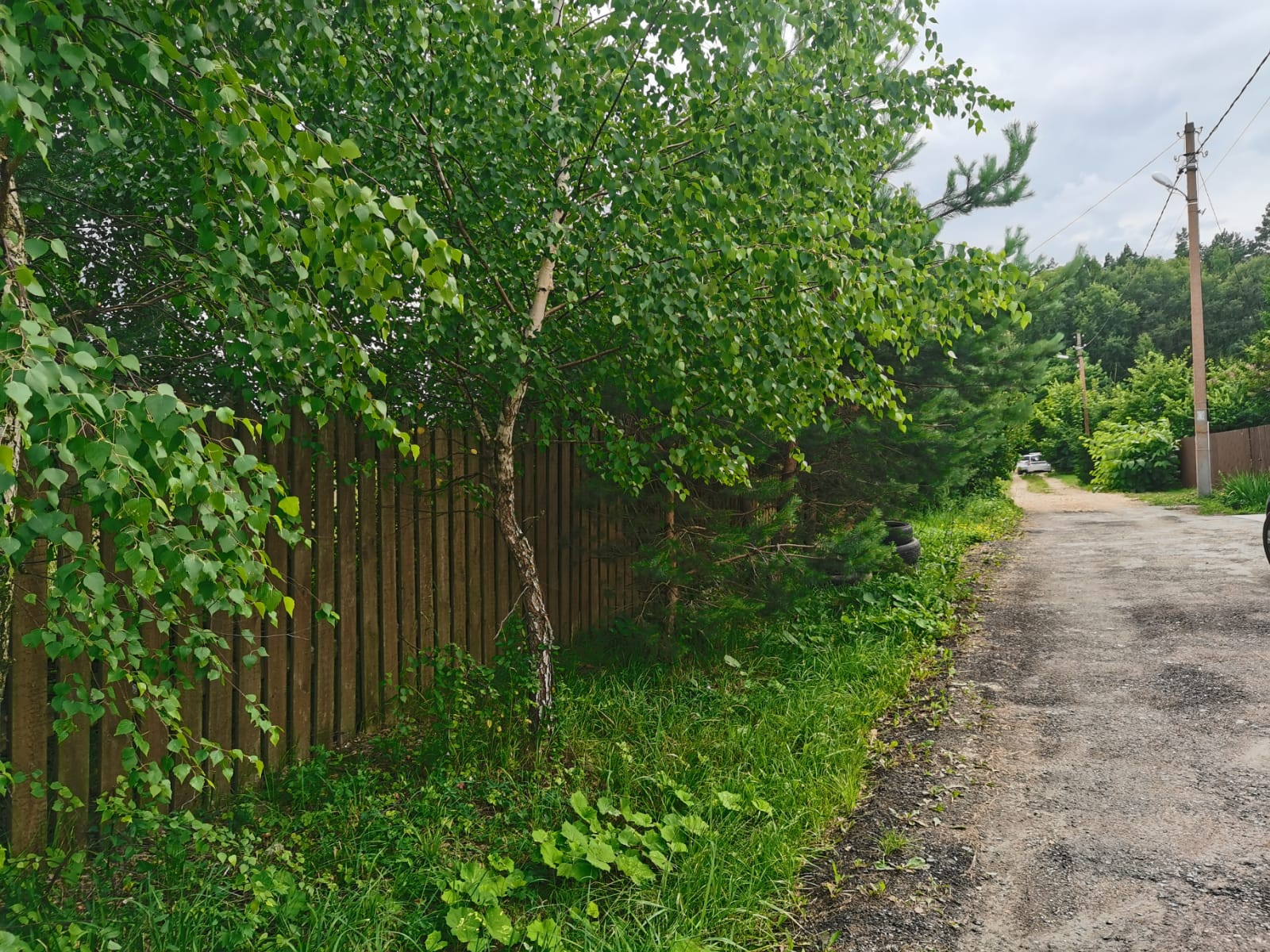 Участок правильной формы, заезд для автомобиля, плодоносящий сад, кустарники, березы, ели.