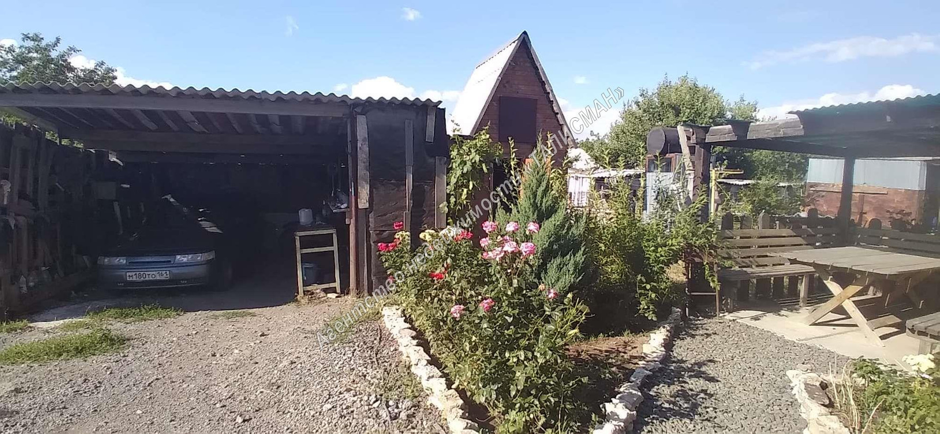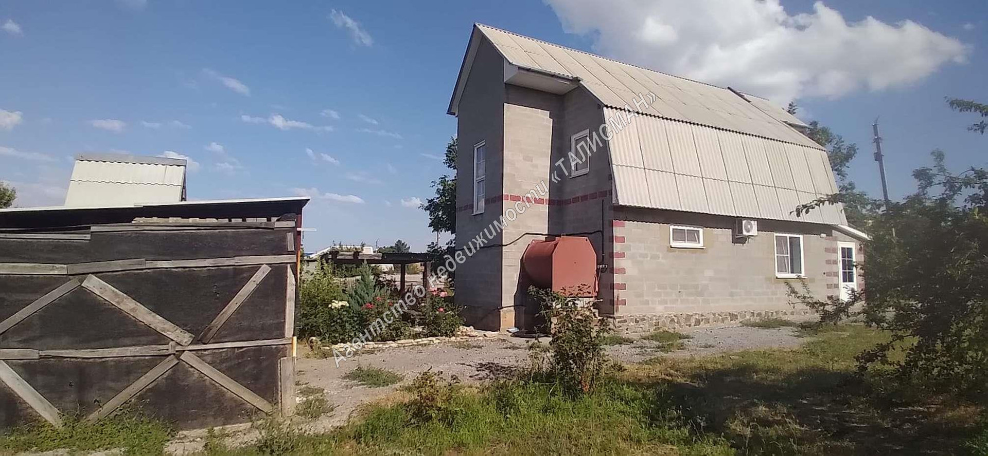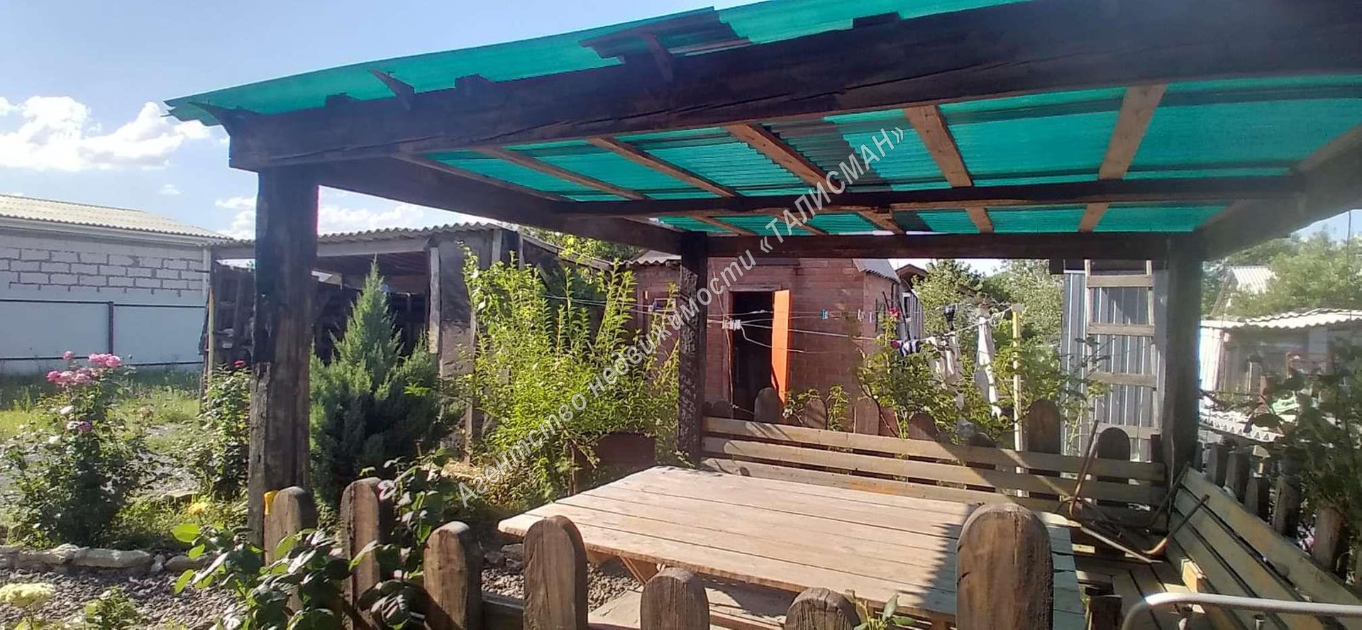 На территории: ограждение металлопрофиль, 2 въезда, 2 входа, большой участок земли со всеми коммуникациями - введены в эксплуатацию, 2 хозпостройки, 2 навеса (для авто, для отдыха),уличный санузел, сквважина, сливная яма.