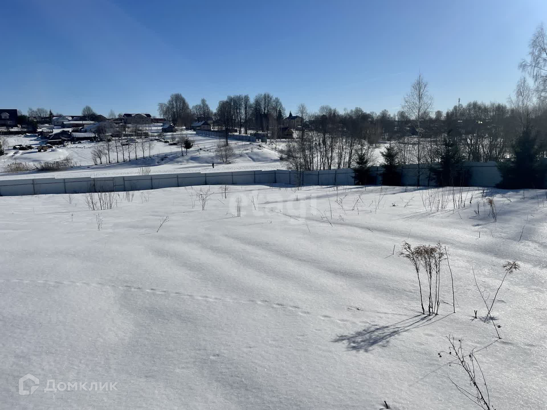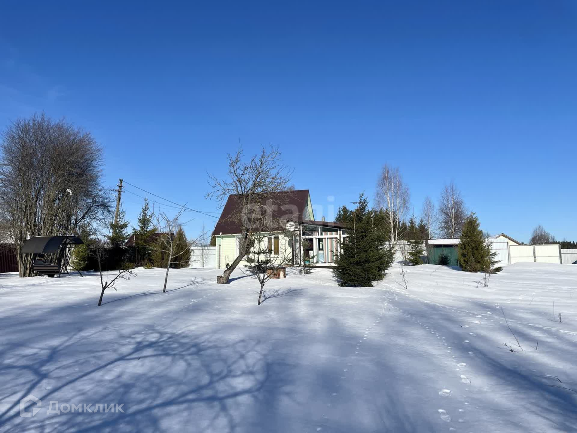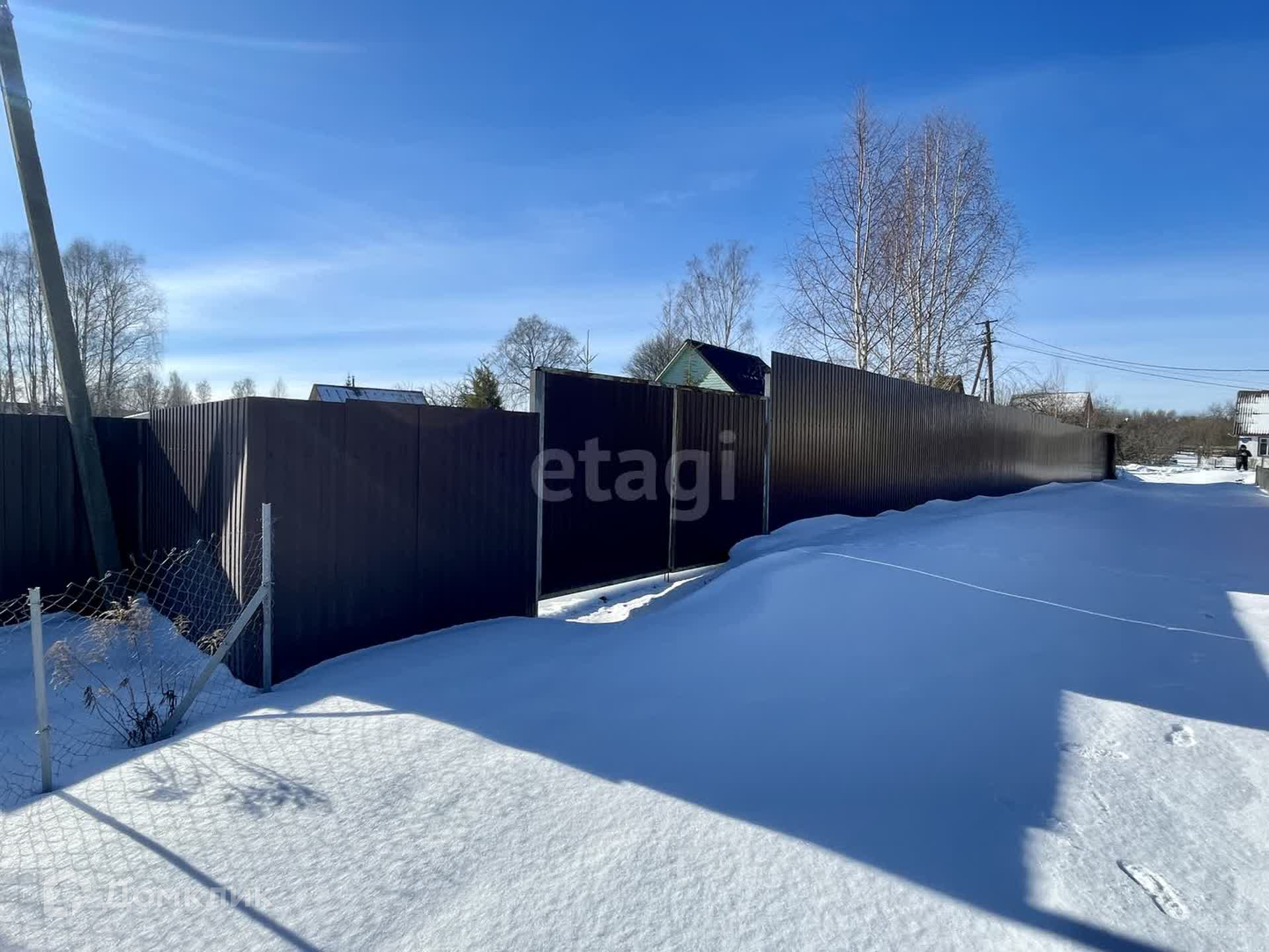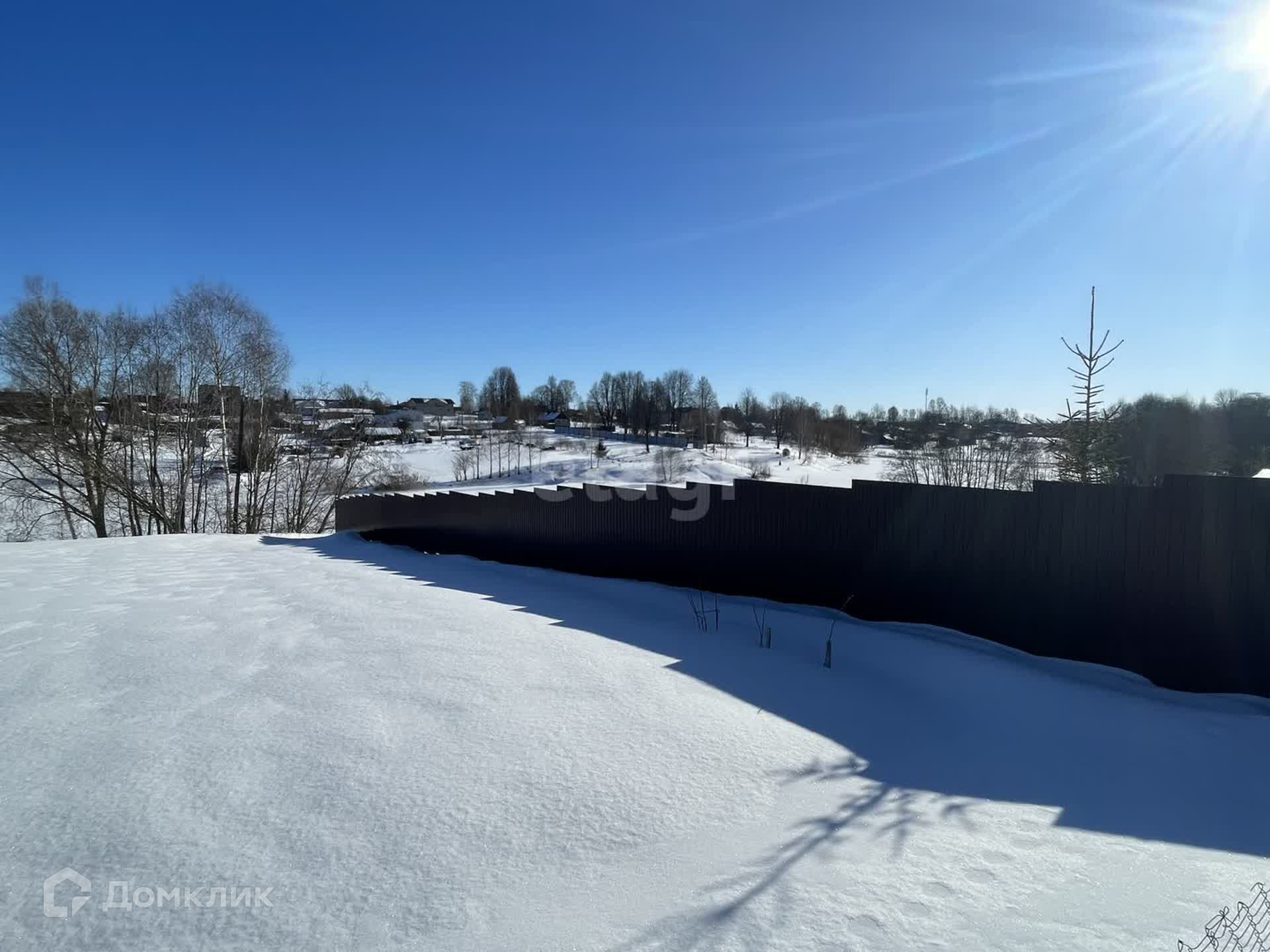 Ровный участок огорожен, установлены откатные ворота. Высажены плодовые деревья и хвойные растения.