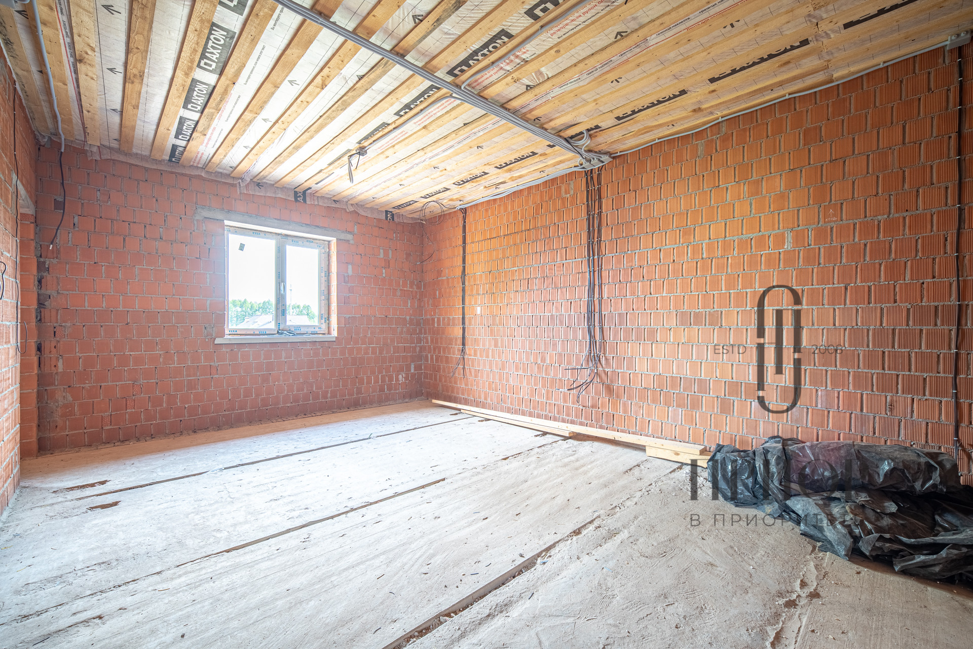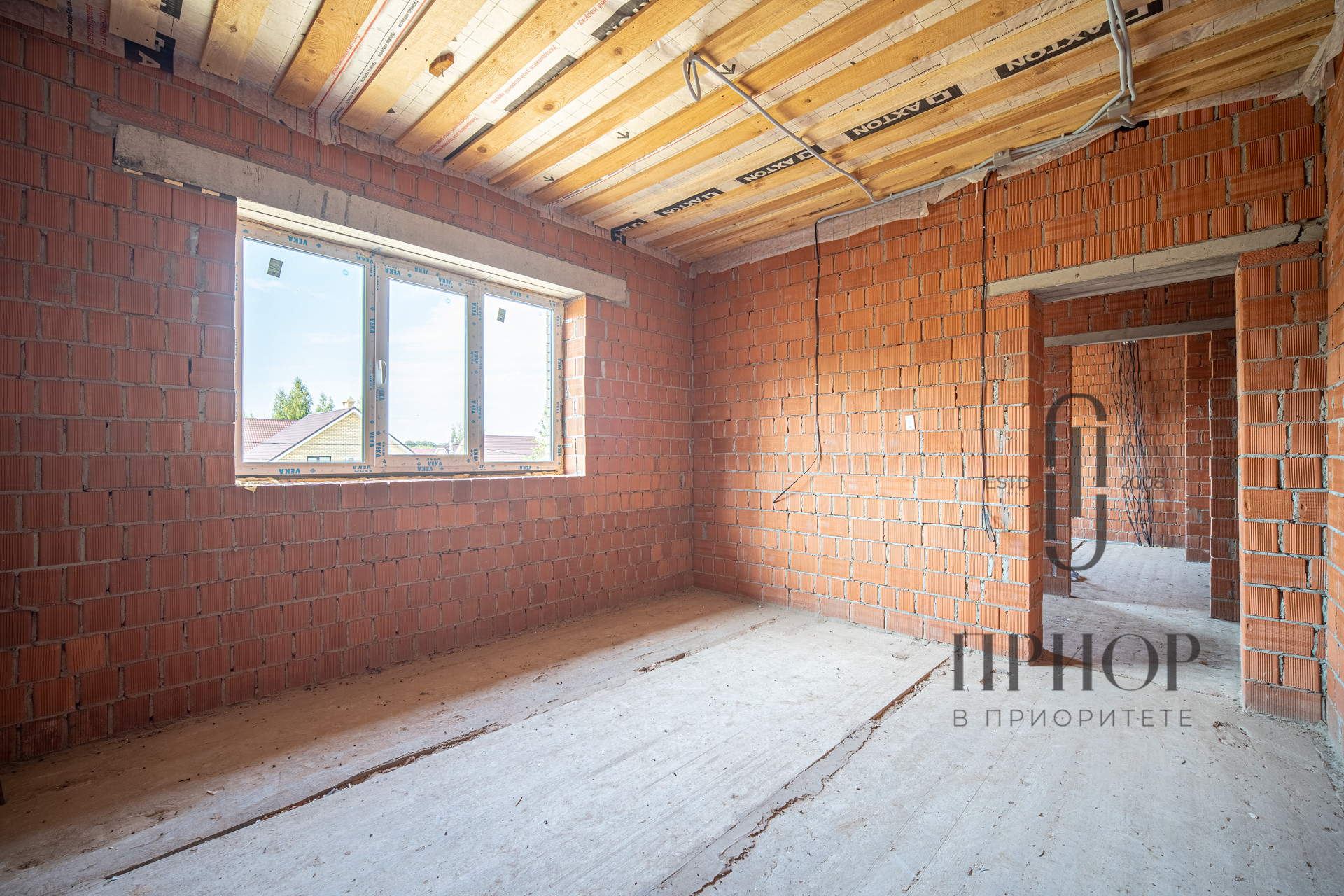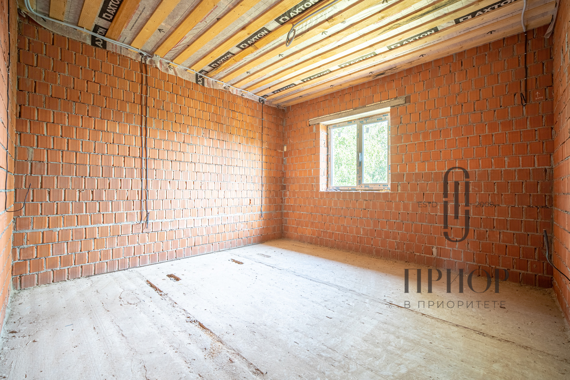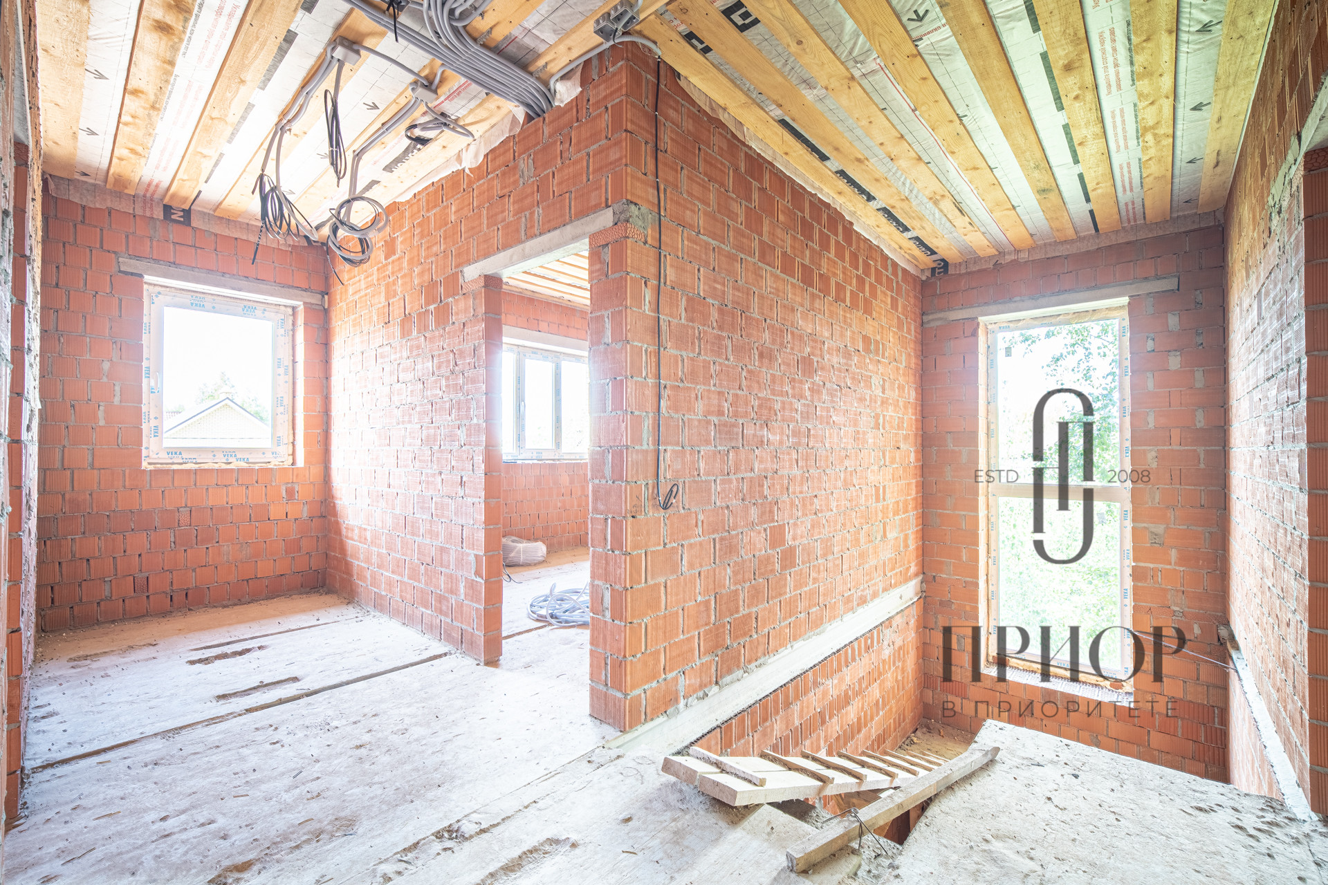 Дом строился постепенно с соблюдением необходимых сроков, в первый год был поднят и выровнен участок, залит ленточный фундамент на сваях, во второй год возведены стены и установлена кровля. За это время дом прошел проверку временем и готов к внутренней отделке.