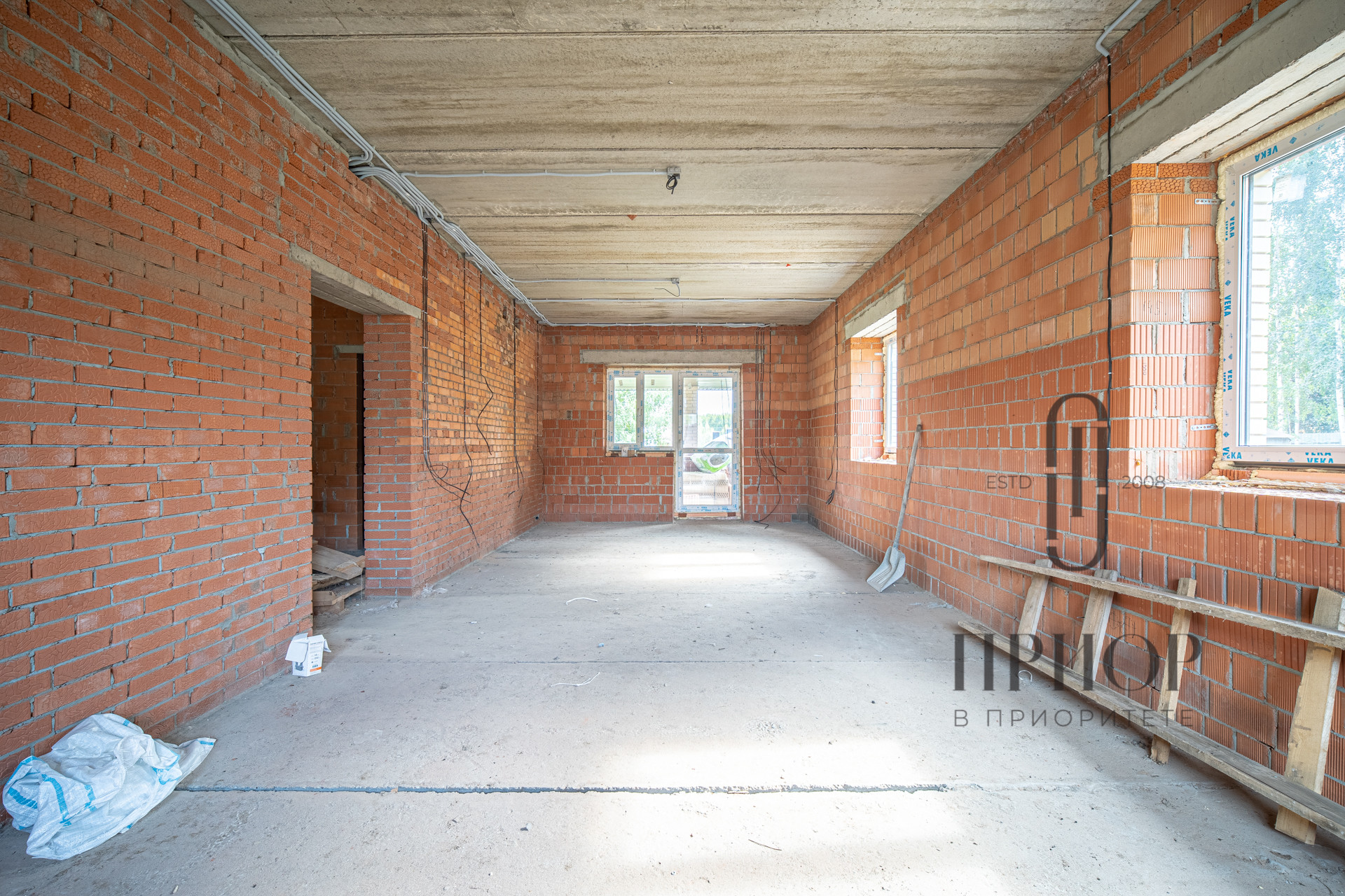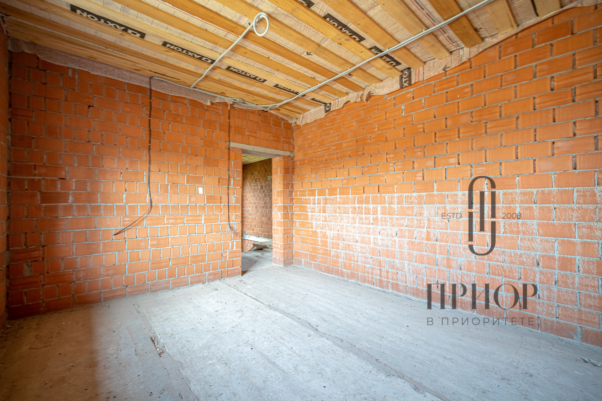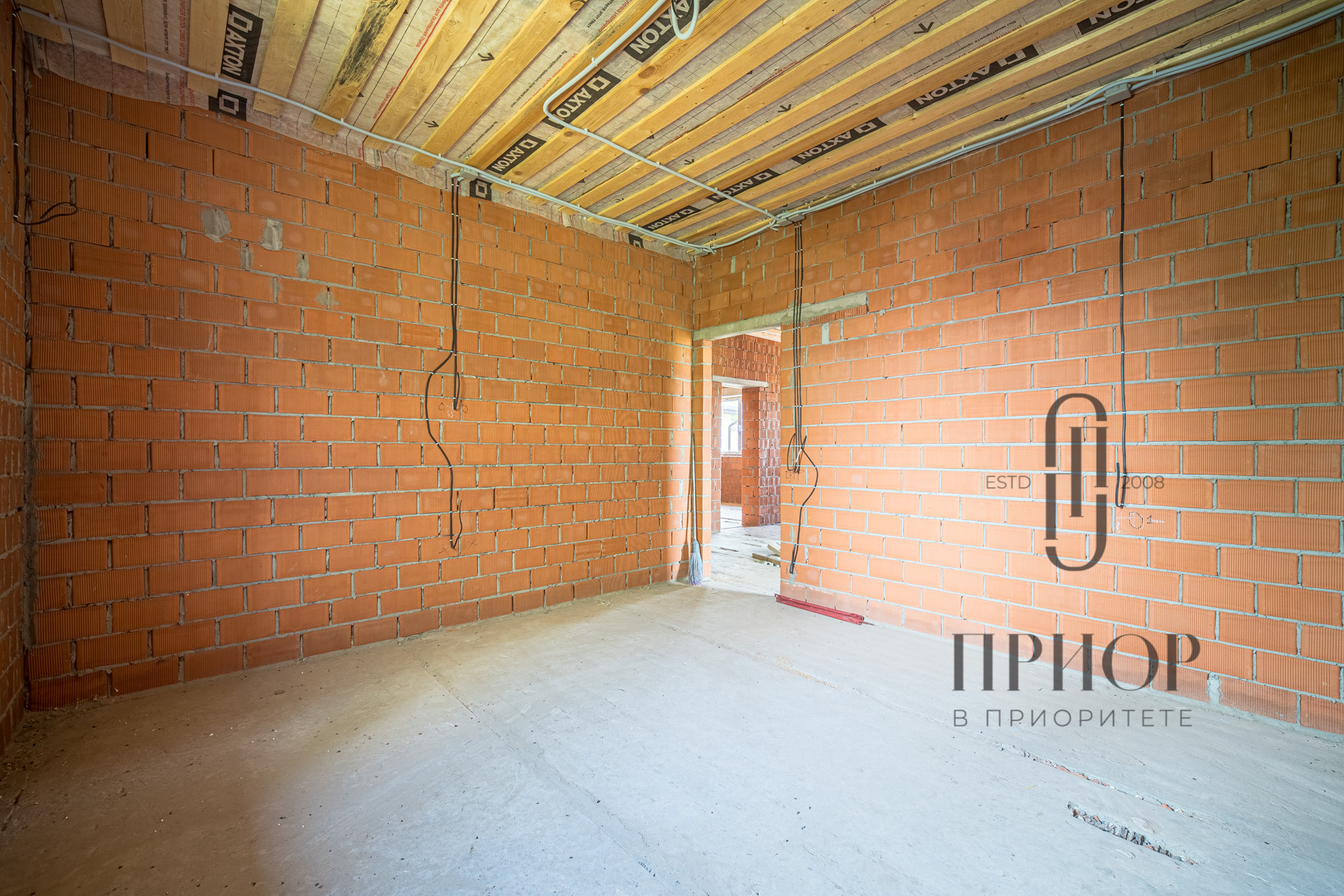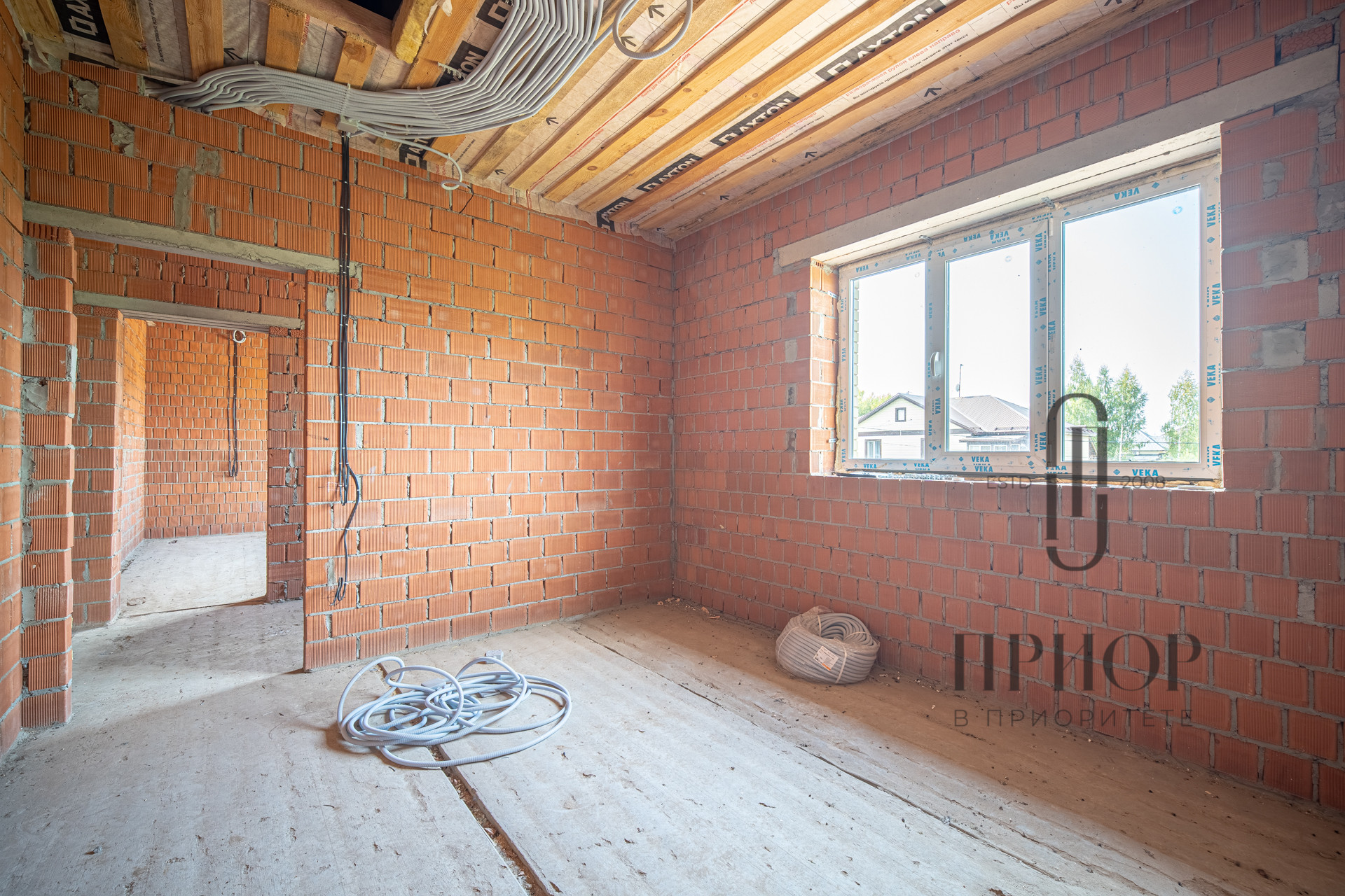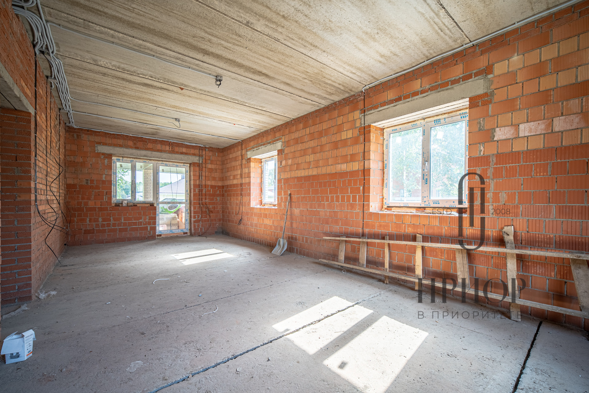Дом строился постепенно с соблюдением необходимых сроков, в первый год был поднят и выровнен участок, залит ленточный фундамент на сваях, во второй год возведены стены и установлена кровля. За это время дом прошел проверку временем и готов к внутренней отделке.