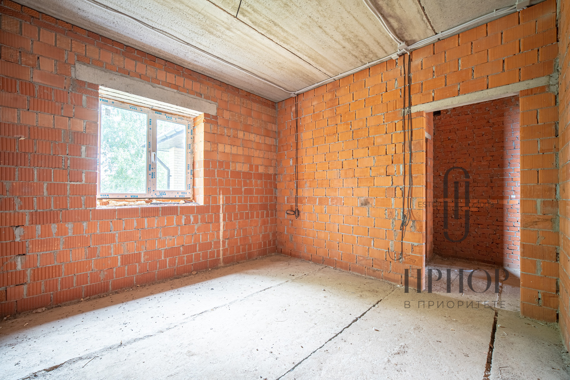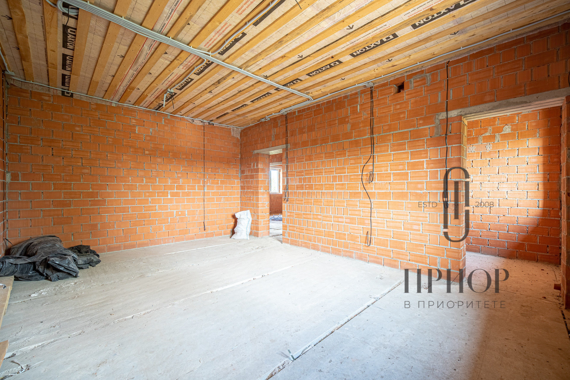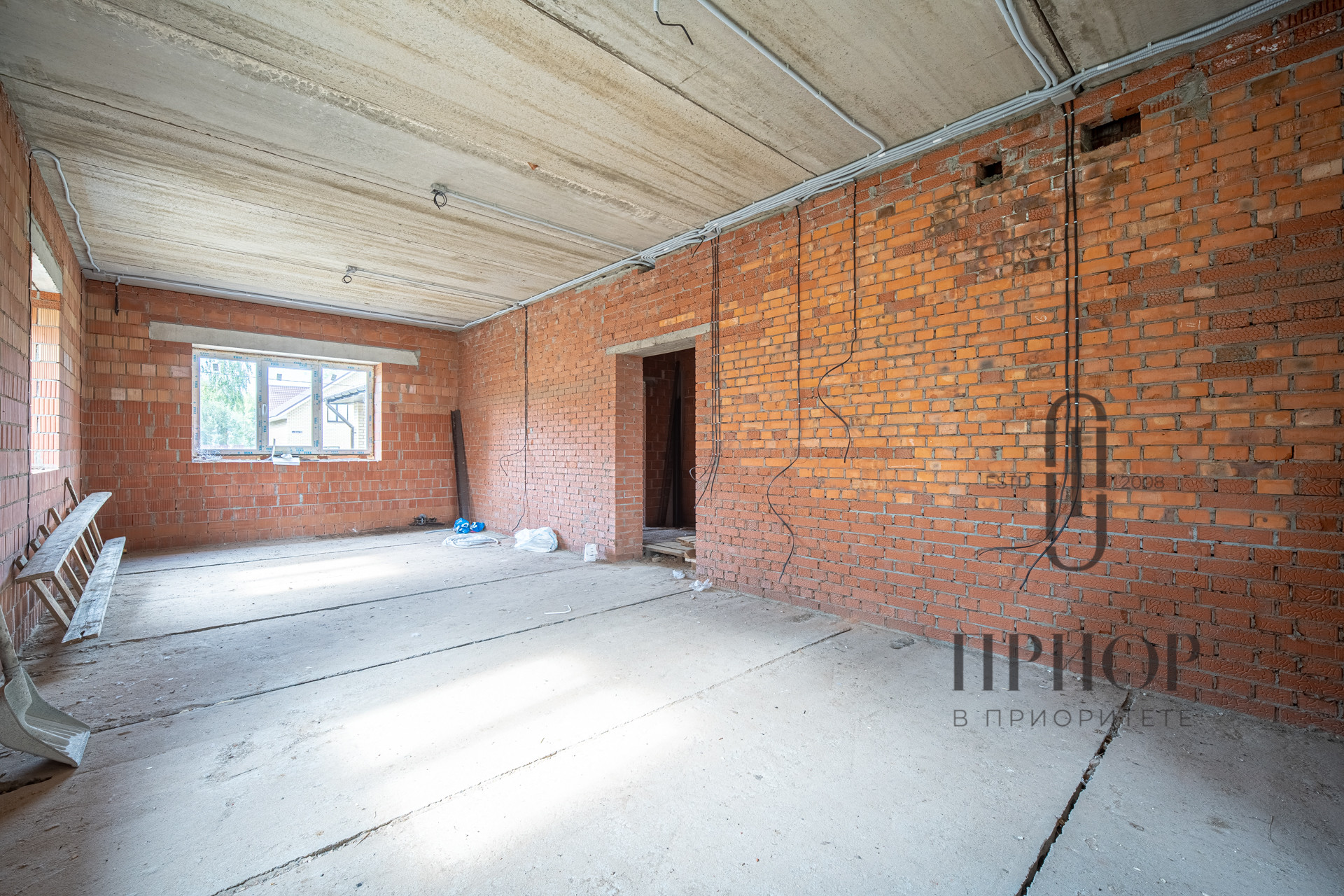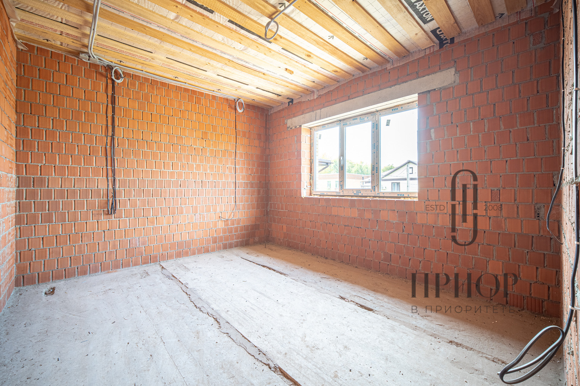 Дом строился постепенно с соблюдением необходимых сроков, в первый год был поднят и выровнен участок, залит ленточный фундамент на сваях, во второй год возведены стены и установлена кровля. За это время дом прошел проверку временем и готов к внутренней отделке.