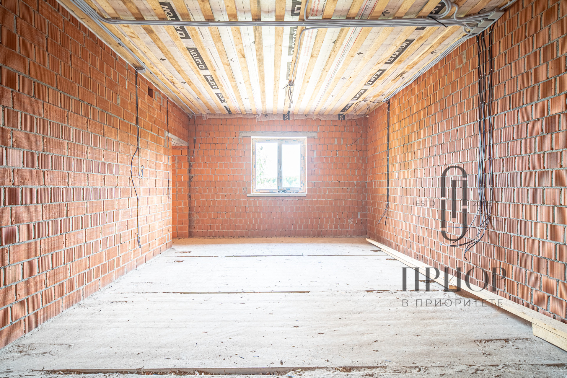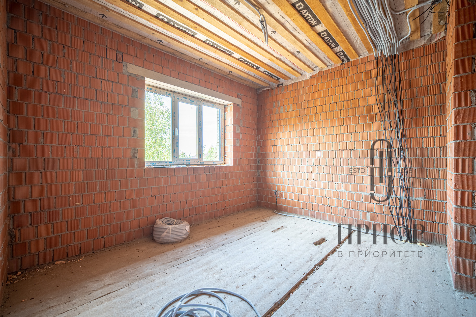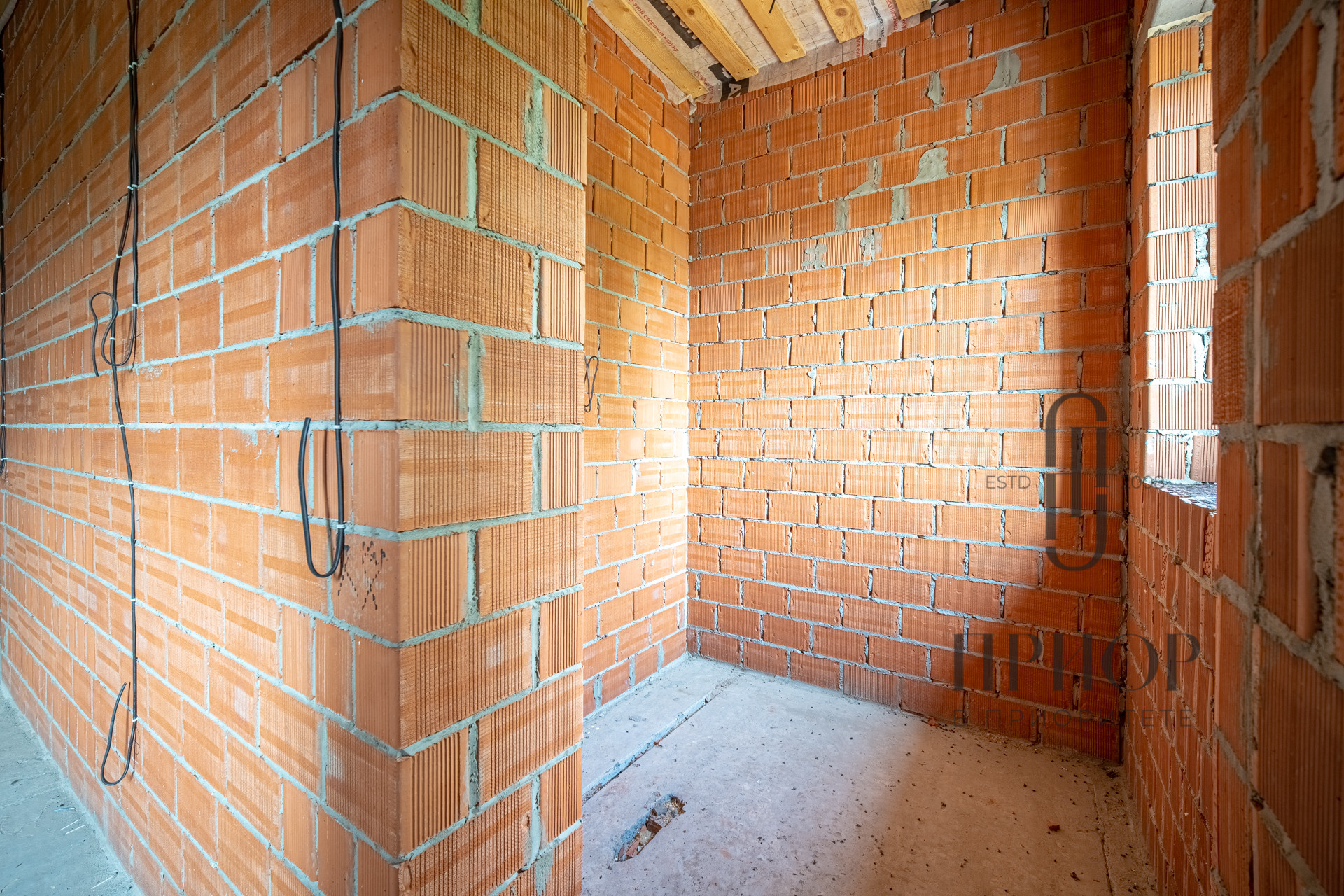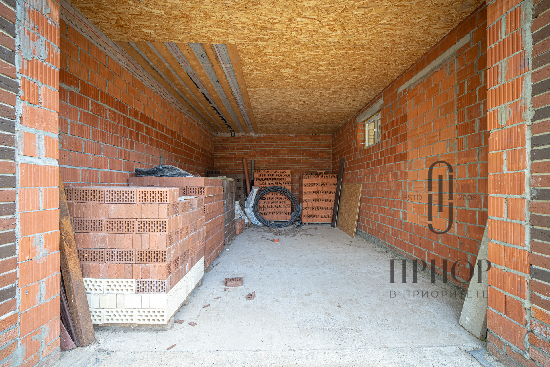 Дом выполнен из облицовочного кирпича М-150 марки ЛСР в цвете "Баварская кладка", внутренние стены из блоков 2.1NF Wienerberger. В кладке использован эстетичный белый турецкий раствор, не дающий высолов на фасаде, не разрушающийся при попадании осадков.