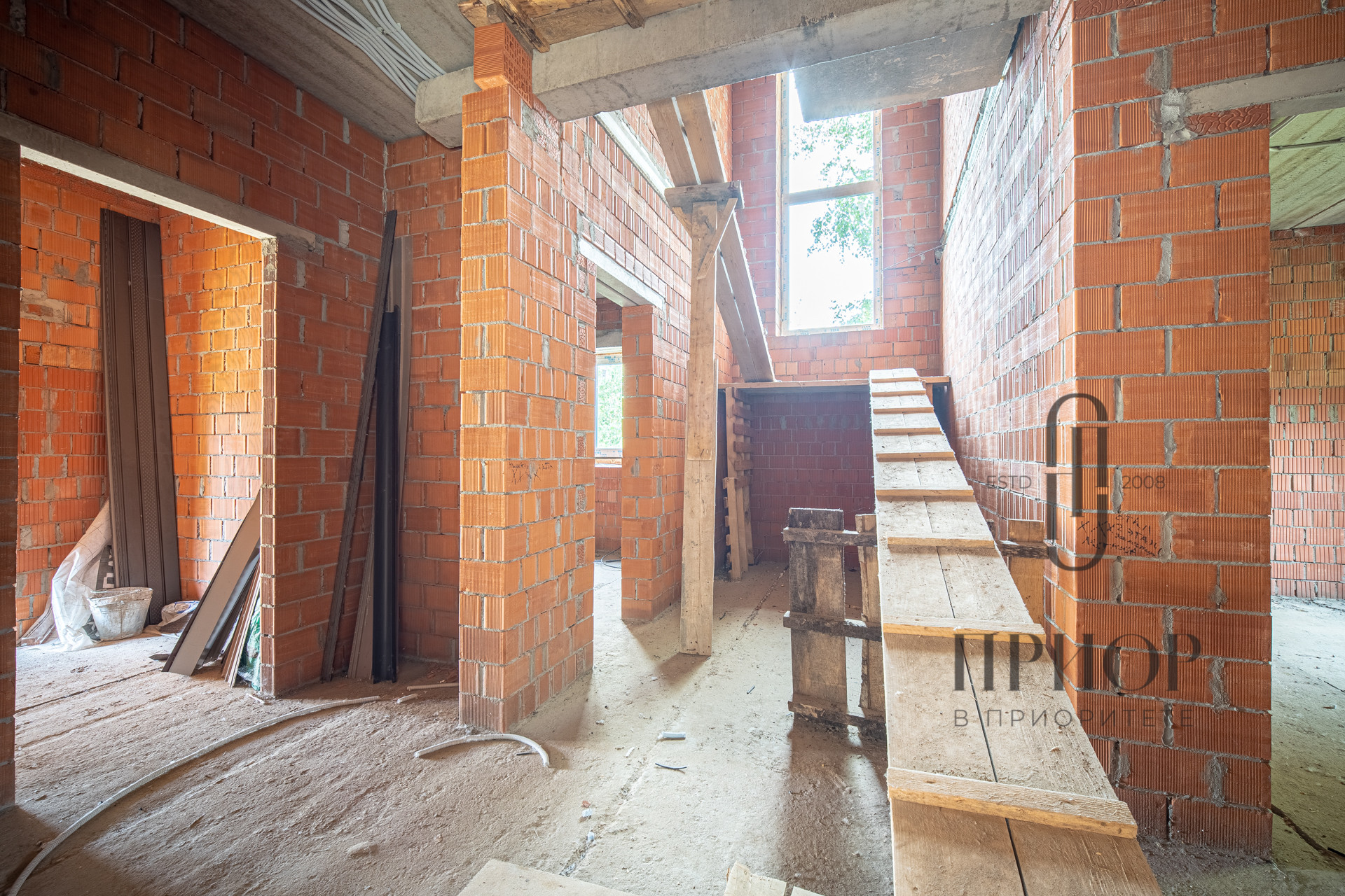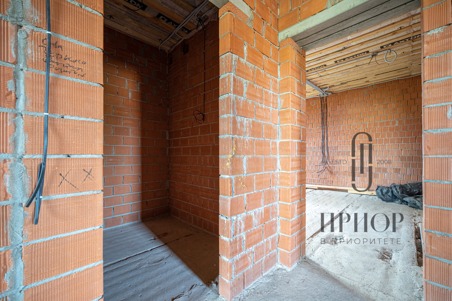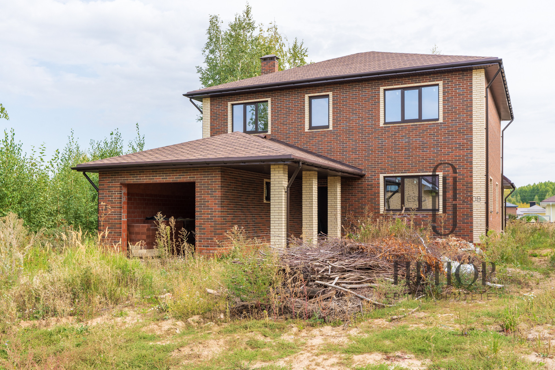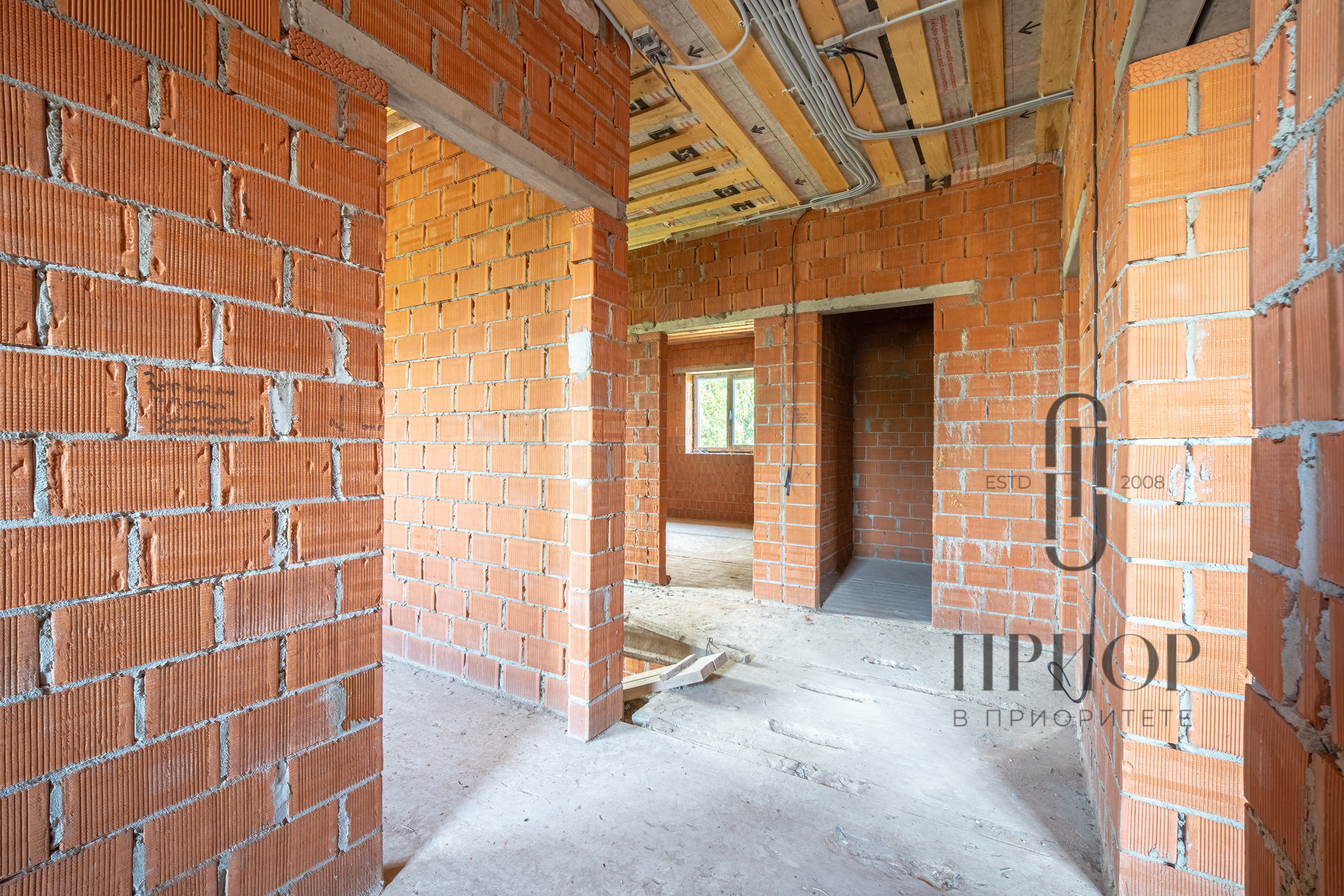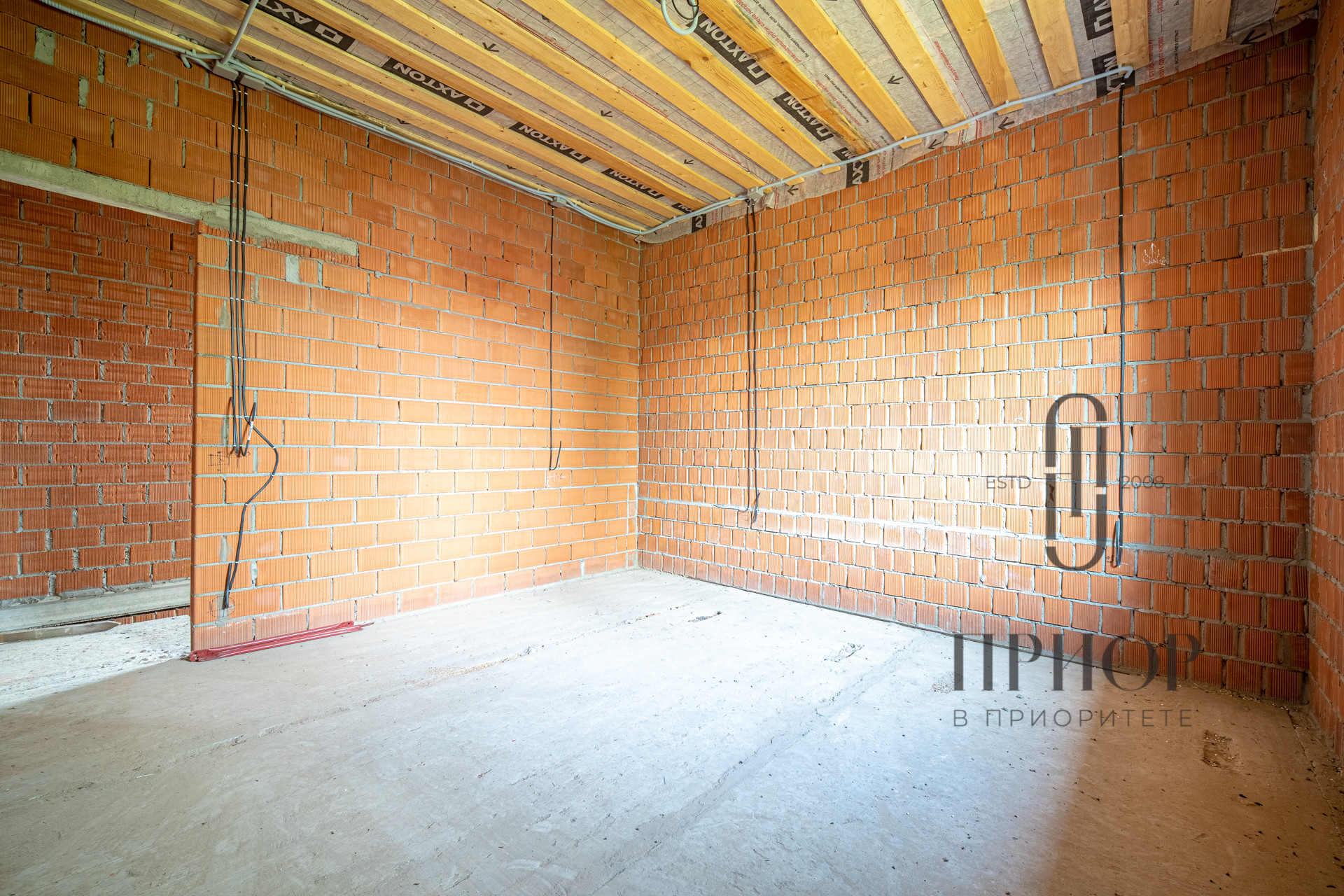 Дом выполнен из облицовочного кирпича М-150 марки ЛСР в цвете "Баварская кладка", внутренние стены из блоков 2.1NF Wienerberger. В кладке использован эстетичный белый турецкий раствор, не дающий высолов на фасаде, не разрушающийся при попадании осадков.