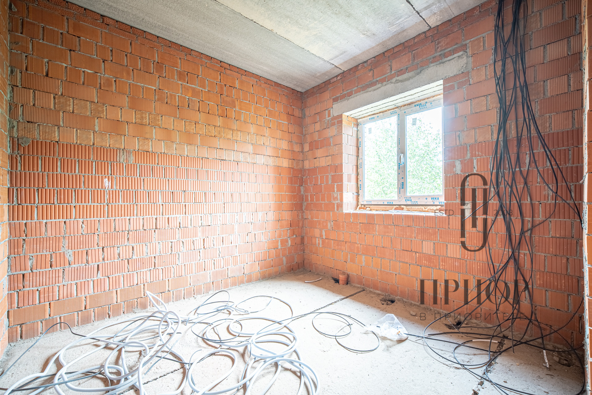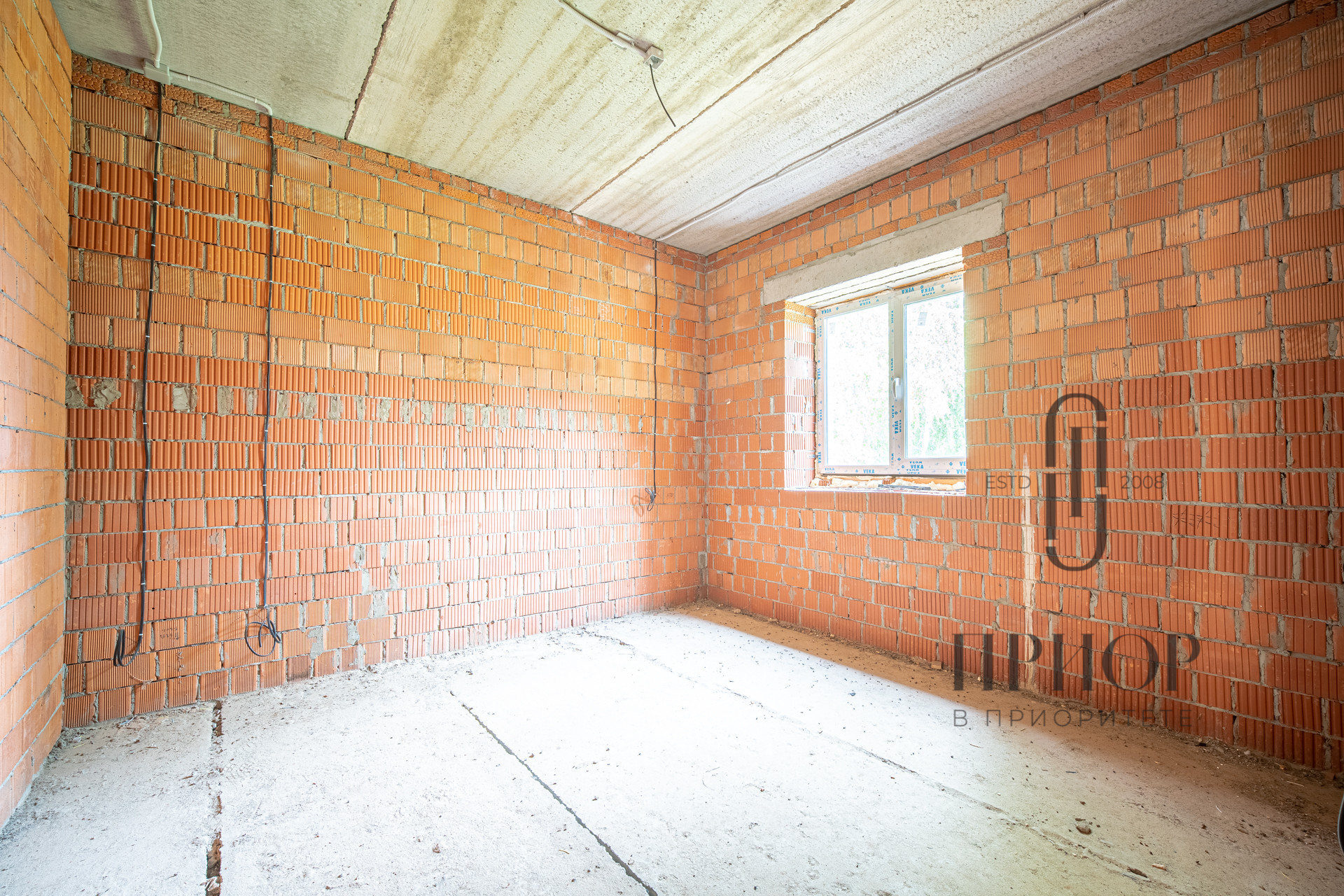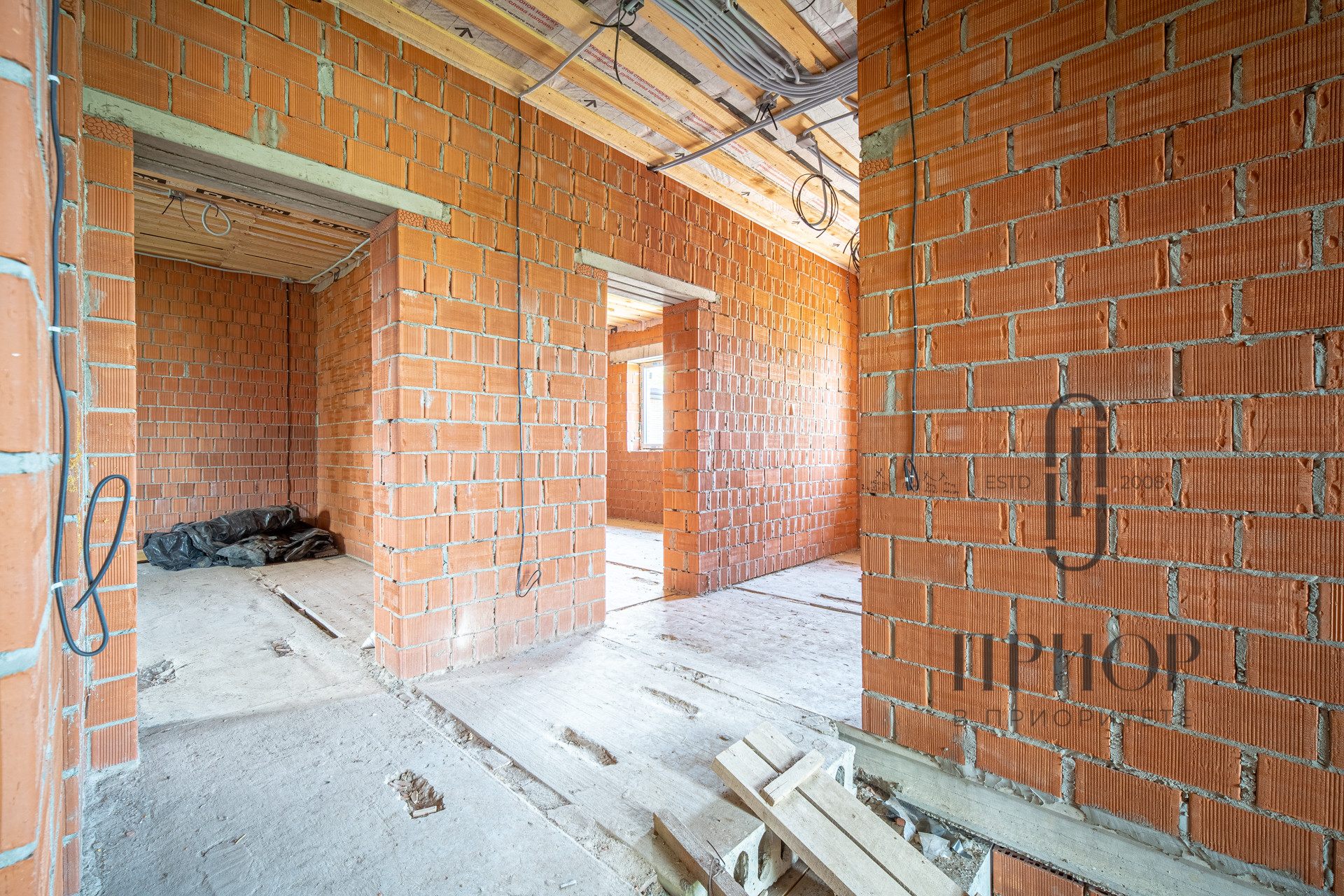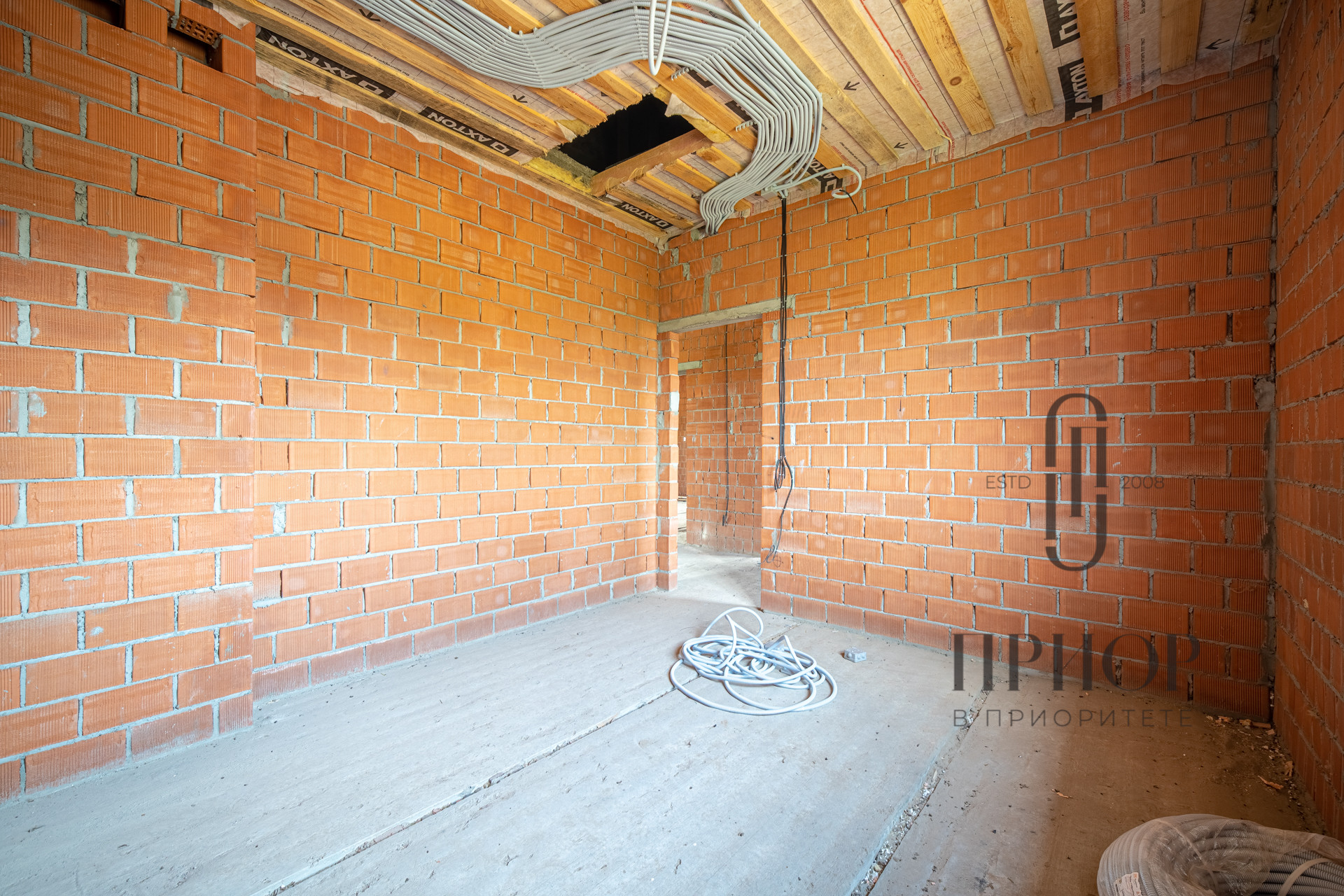 Дом выполнен из облицовочного кирпича М-150 марки ЛСР в цвете "Баварская кладка", внутренние стены из блоков 2.1NF Wienerberger. В кладке использован эстетичный белый турецкий раствор, не дающий высолов на фасаде, не разрушающийся при попадании осадков.