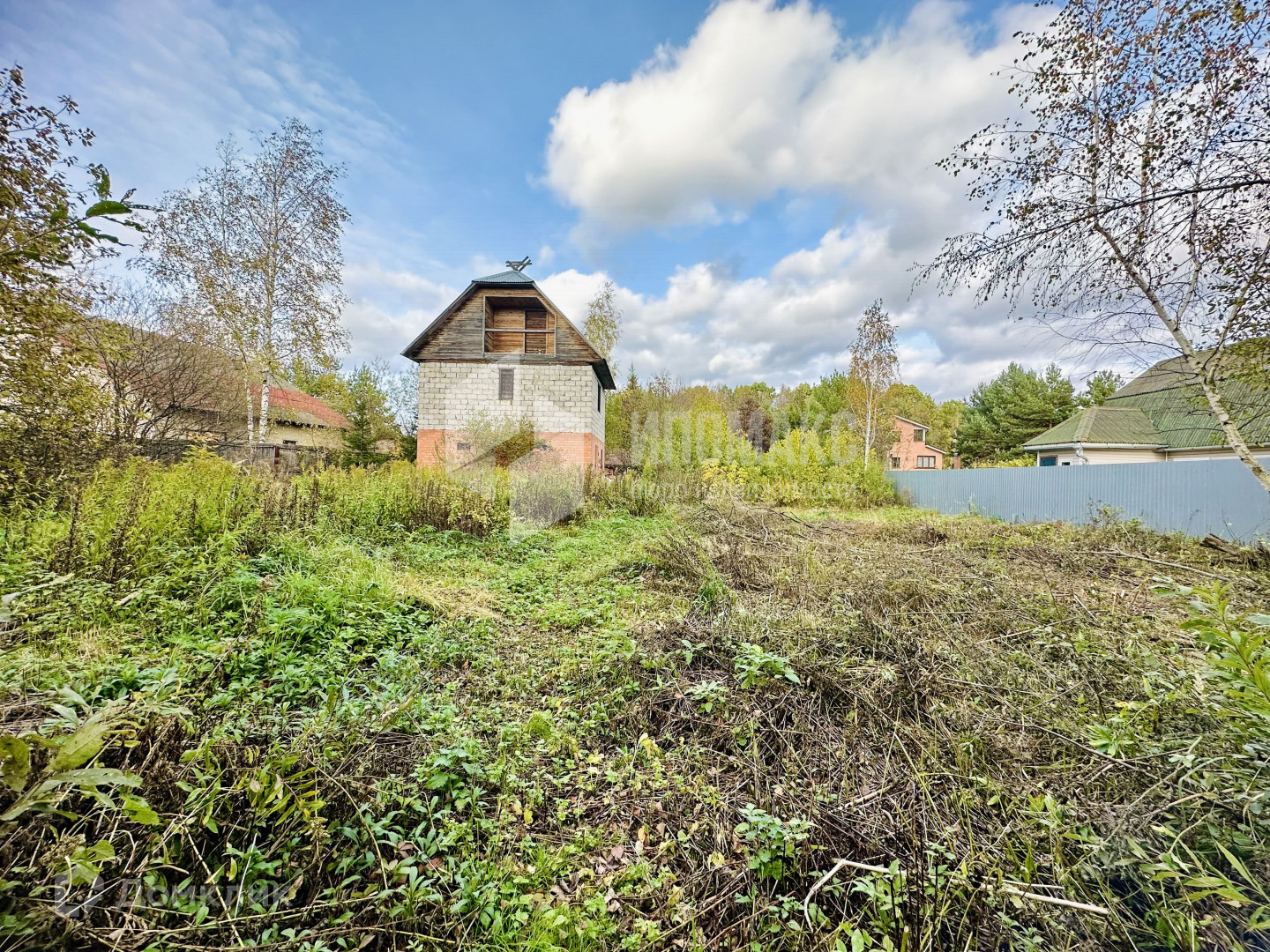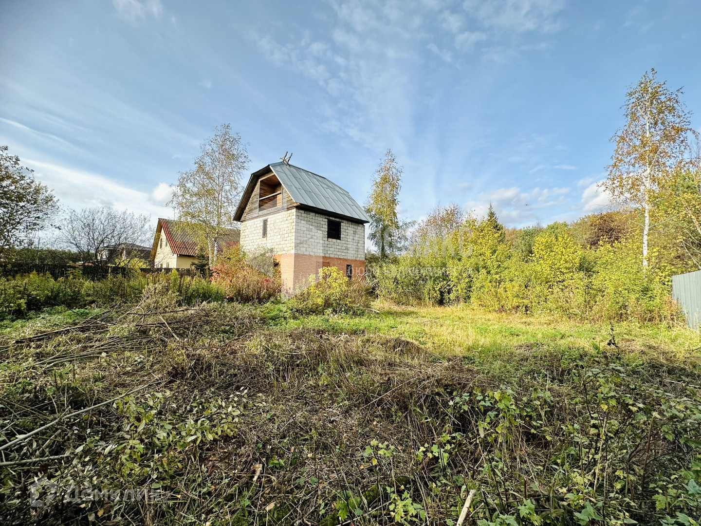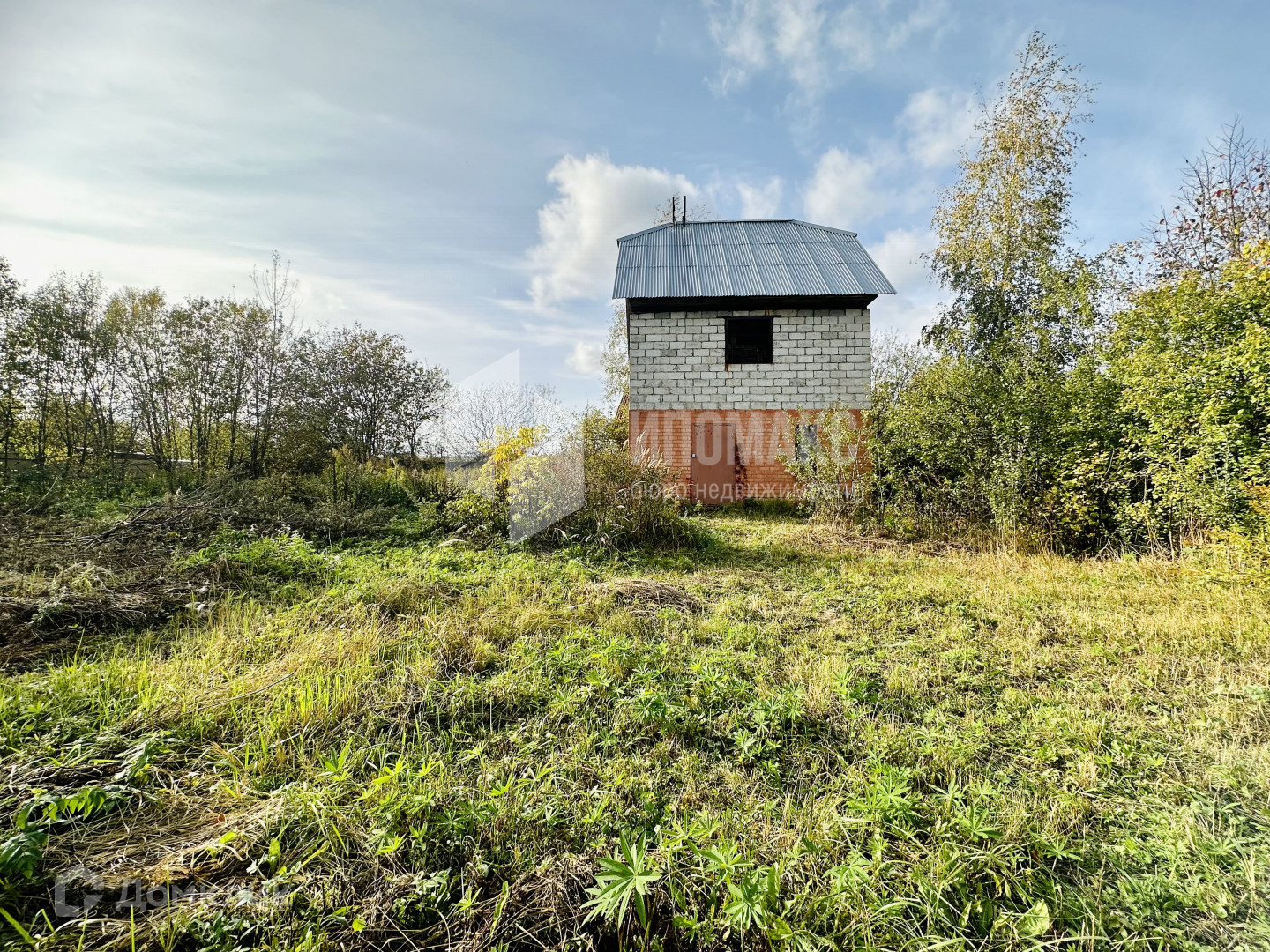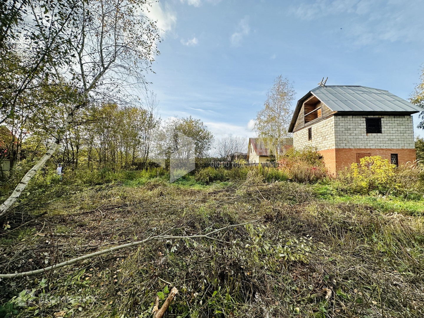 Участок правильной формы, сухой, построен двухэтажный гараж: первый этаж из кирпича, второй из блоков с мансардой, общей площадью 85 м2, при желании его можно переоборудовать под дом.