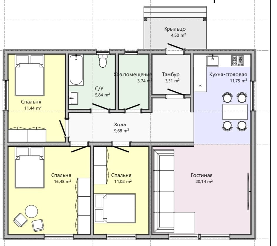 В доме очень удачная планировка: три спальни,просторная гостинная и кухня-столовая,хоз помещение,санузел,холл.