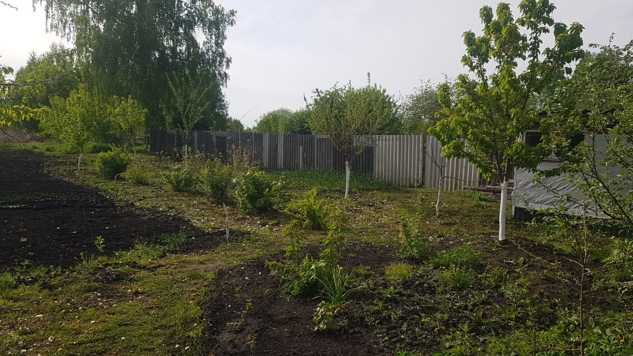 Во дворе дома ухоженная территория с плодовыми деревьями и декоративными кустарниками.