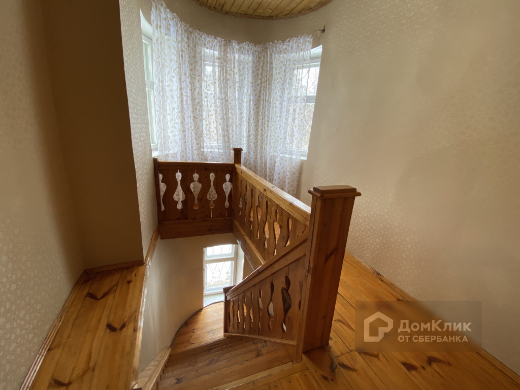 Из гостиной предусмотрен выход на второй этаж дома по красивой деревянной лестнице с балюстрадой из массива дерева.