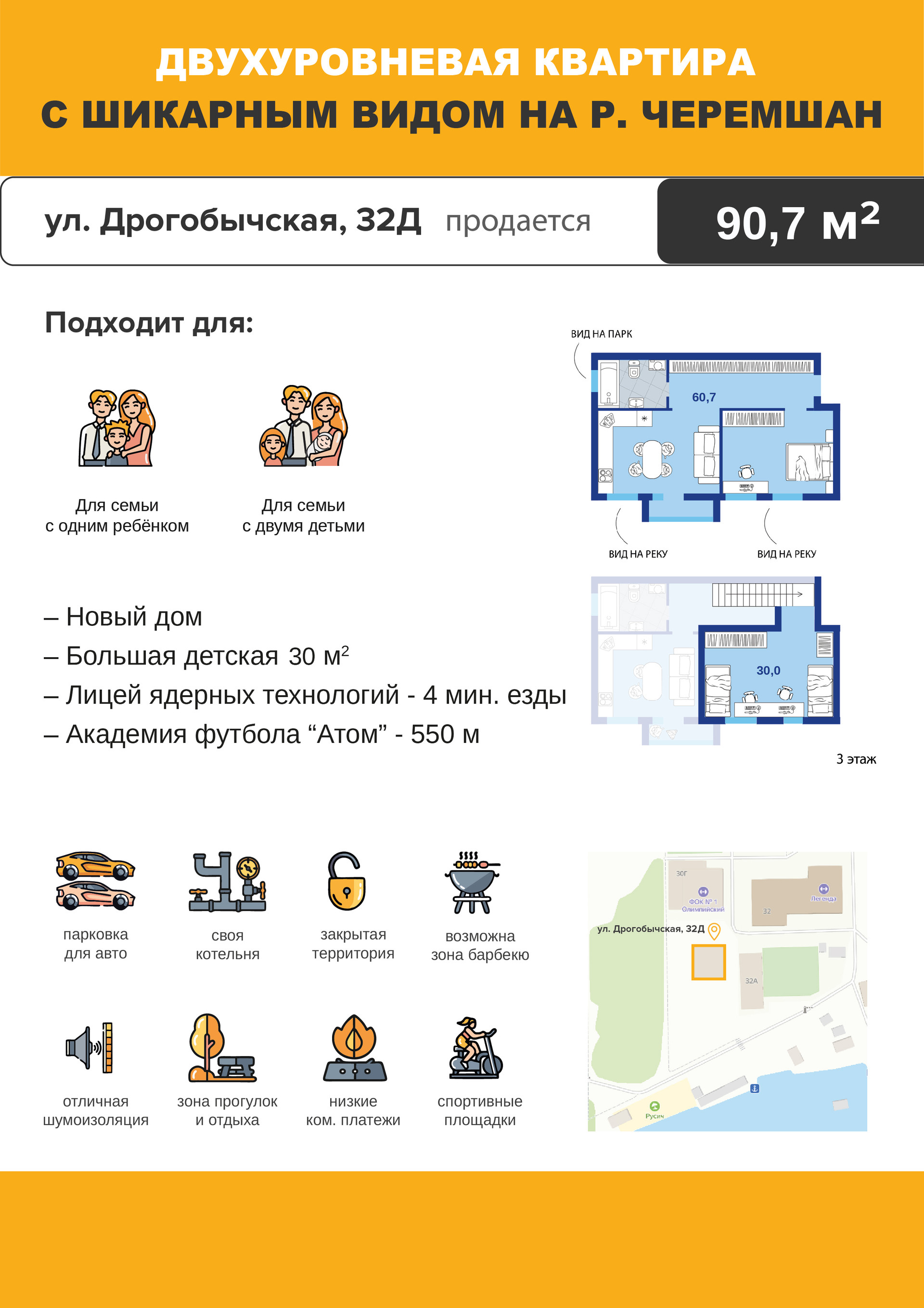 -в районе построен совершенно новый ЛИЦЕЙ ЯДЕРНЫХ ТЕХНОЛОГИЙ, где могут учится Ваши дети, в 2 шагах от дома расположены академия футбола "Атом" и территория для спорта ФОК, река Черемшан в 500 метрах от дома, идеально для любителей рыбалки и пляжного отдыха.