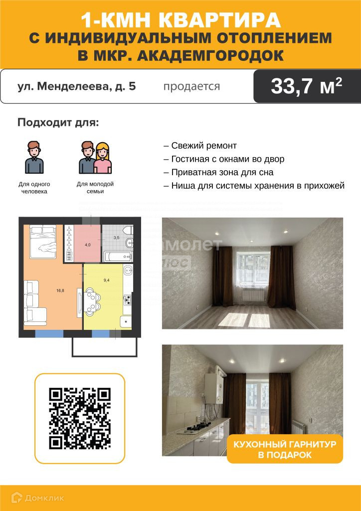 ОДНОКОМНАТНАЯ КВАРТИРА с ИНДИВИДУАЛЬНЫМ ОТОПЛЕНИЕМ в мкр. Академгородок на ул. Менделеева, д. 5, общей площадью 33,7 м на удобном первом этаже малоэтажного жилого дома. КВАРТИРА с РЕМОНТОМ и не требует совершенно никаких вложений. ЗАЕЗЖАЙ И ЖИВИ!