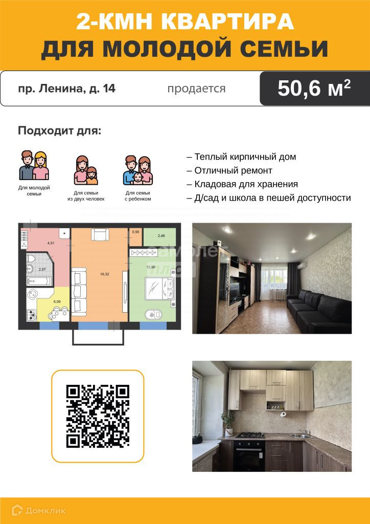 2-комнатная квартира, 50.55 м2, этаж 4 / 5, на продажу в Димитровграде, проспект Ленина, 14