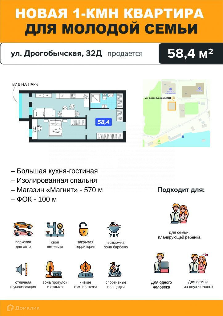 Арт. 70155408 ОДНОКОМНАТНАЯ КВАРТИРА на берегу Черемшана, В ДОМЕ СО СВОЕЙ КОТЕЛЬНОЙ, общей площадью 58,4 м, расположенная по адресу ул. Дрогобычская д.32Д.