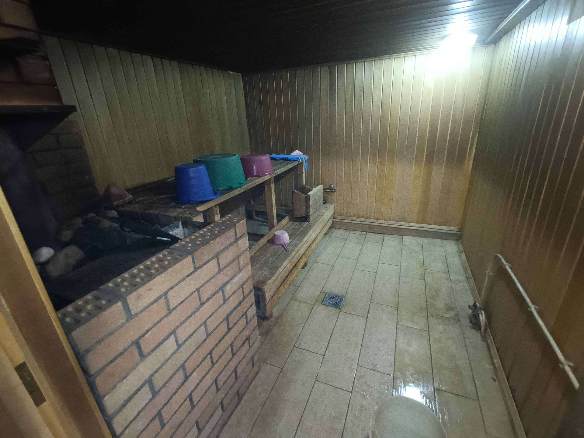 Баня-сауна в комплексе с домом(вход в сауну из дома), баня отапливается дровами, печь каменка, полы-плитка теплый пол.
