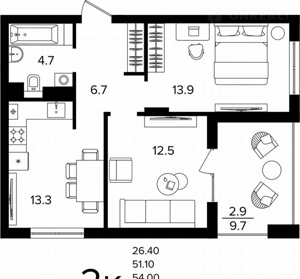 Общая площадь 54 м2