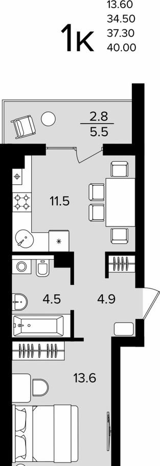 Общая площадь 37.3 м2
